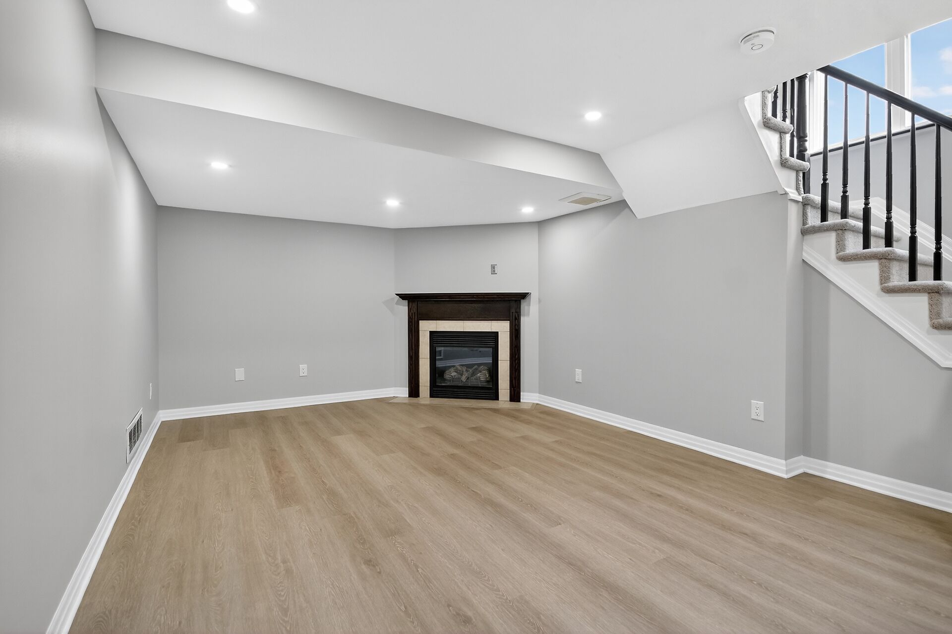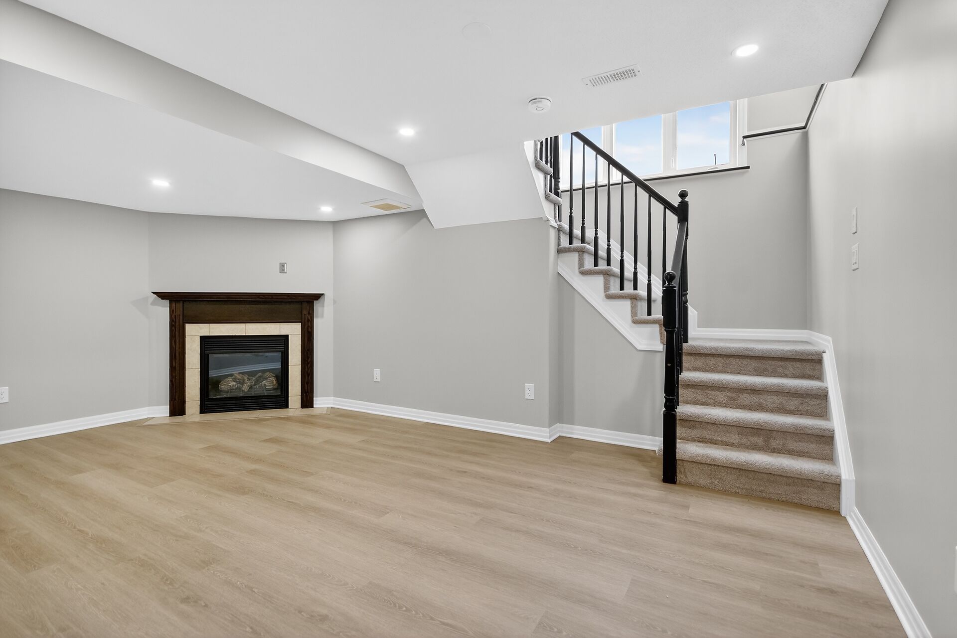 • Finished basement with a gas fireplace and potential extra living space.