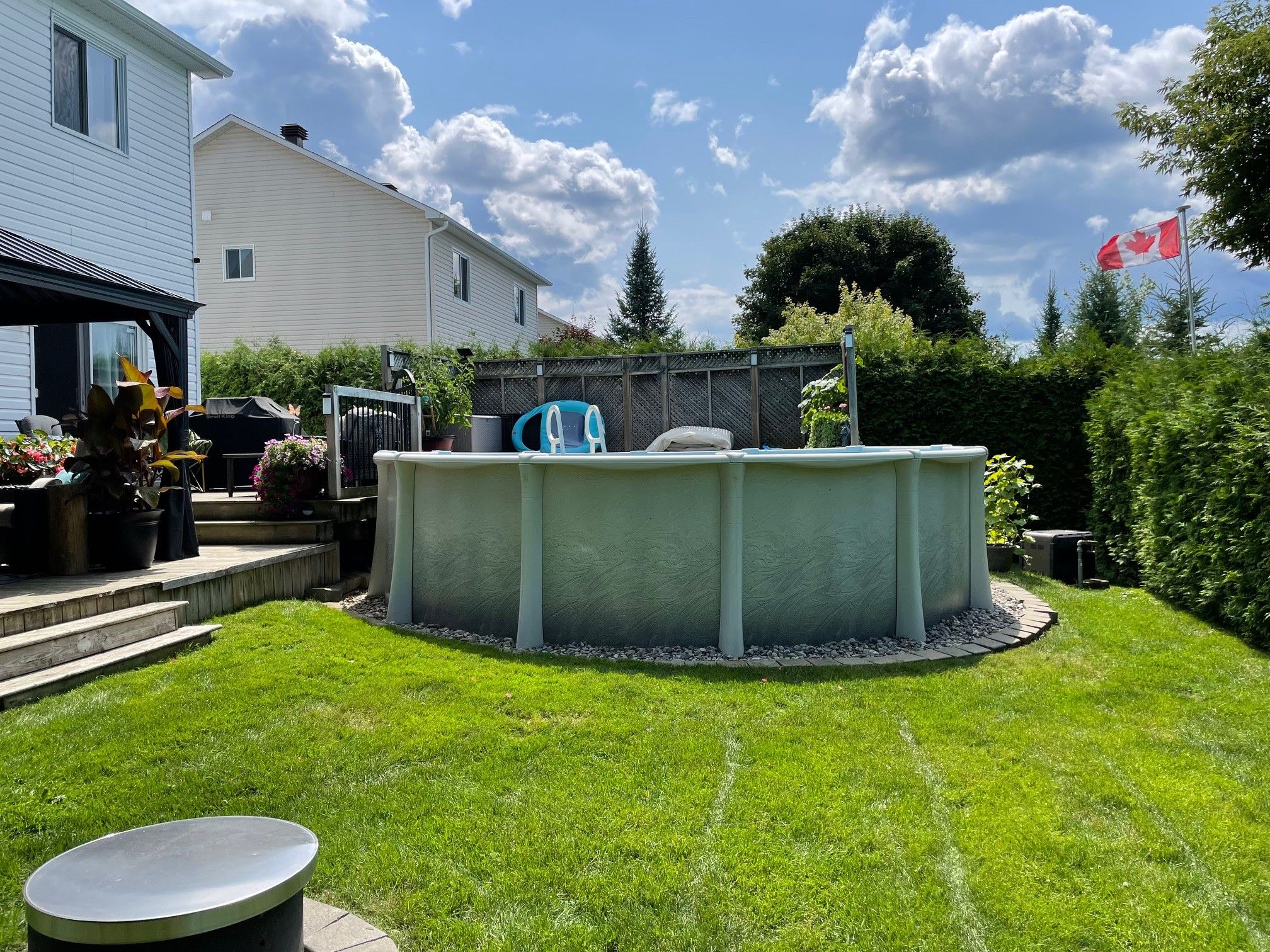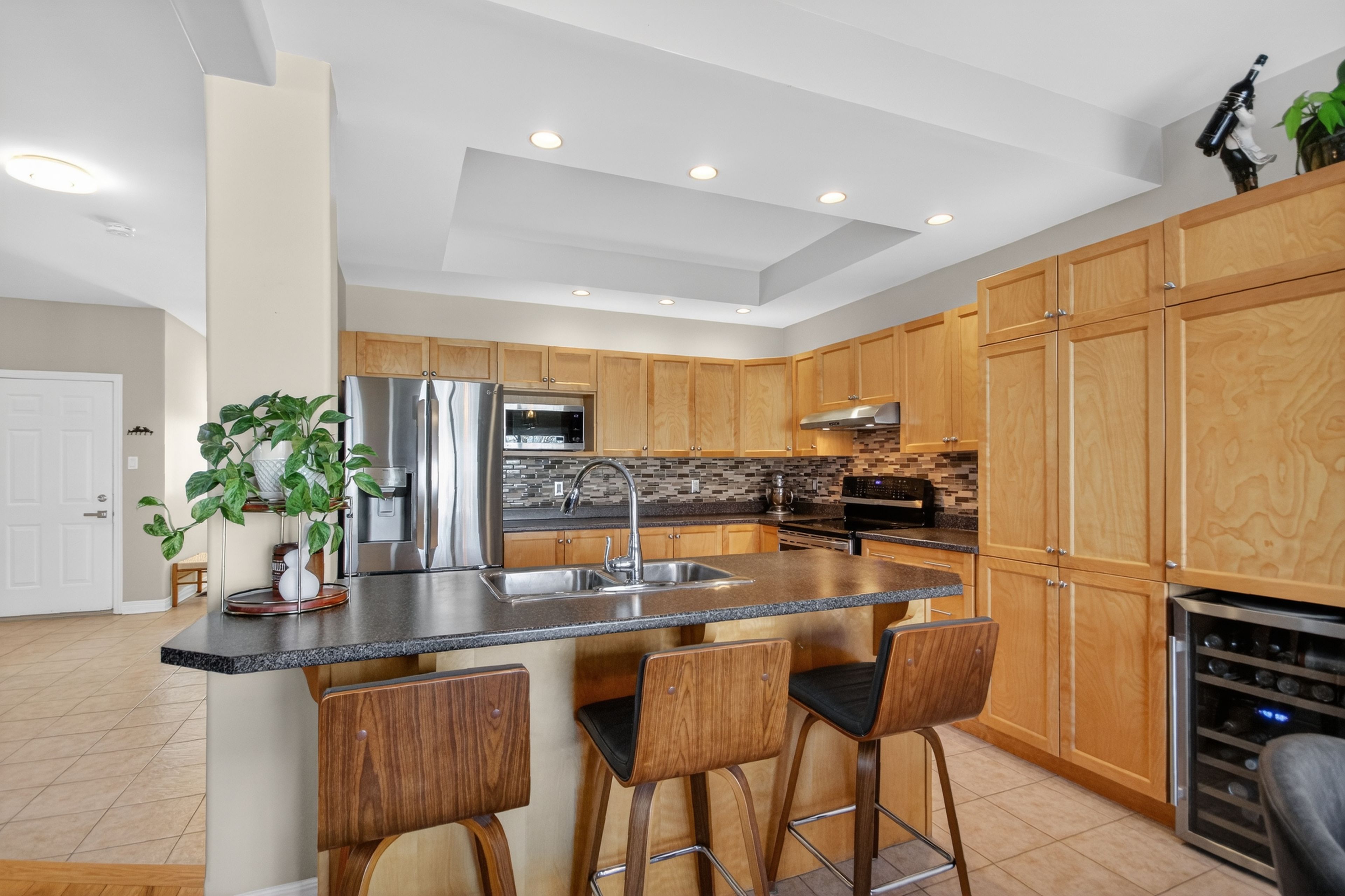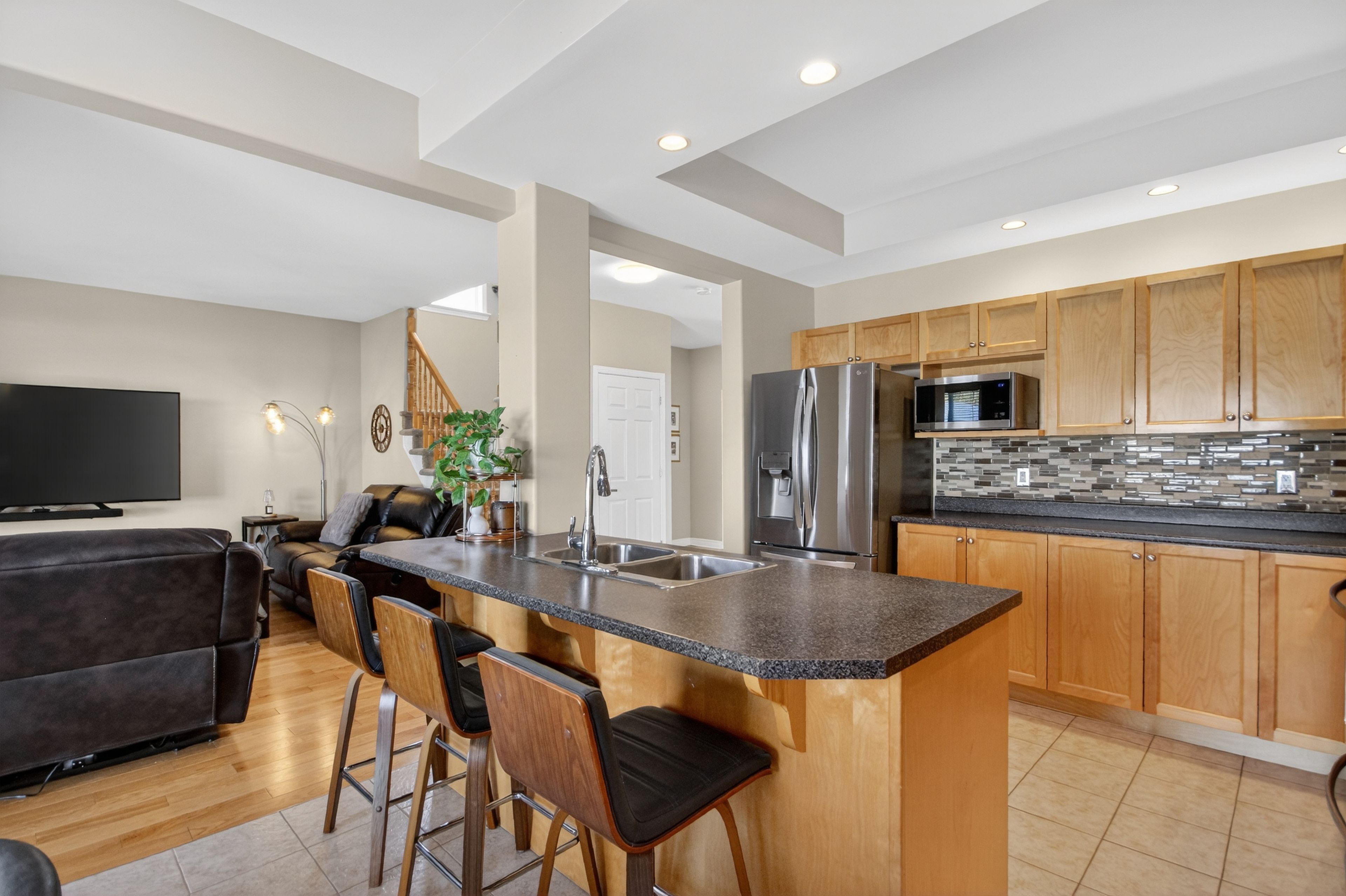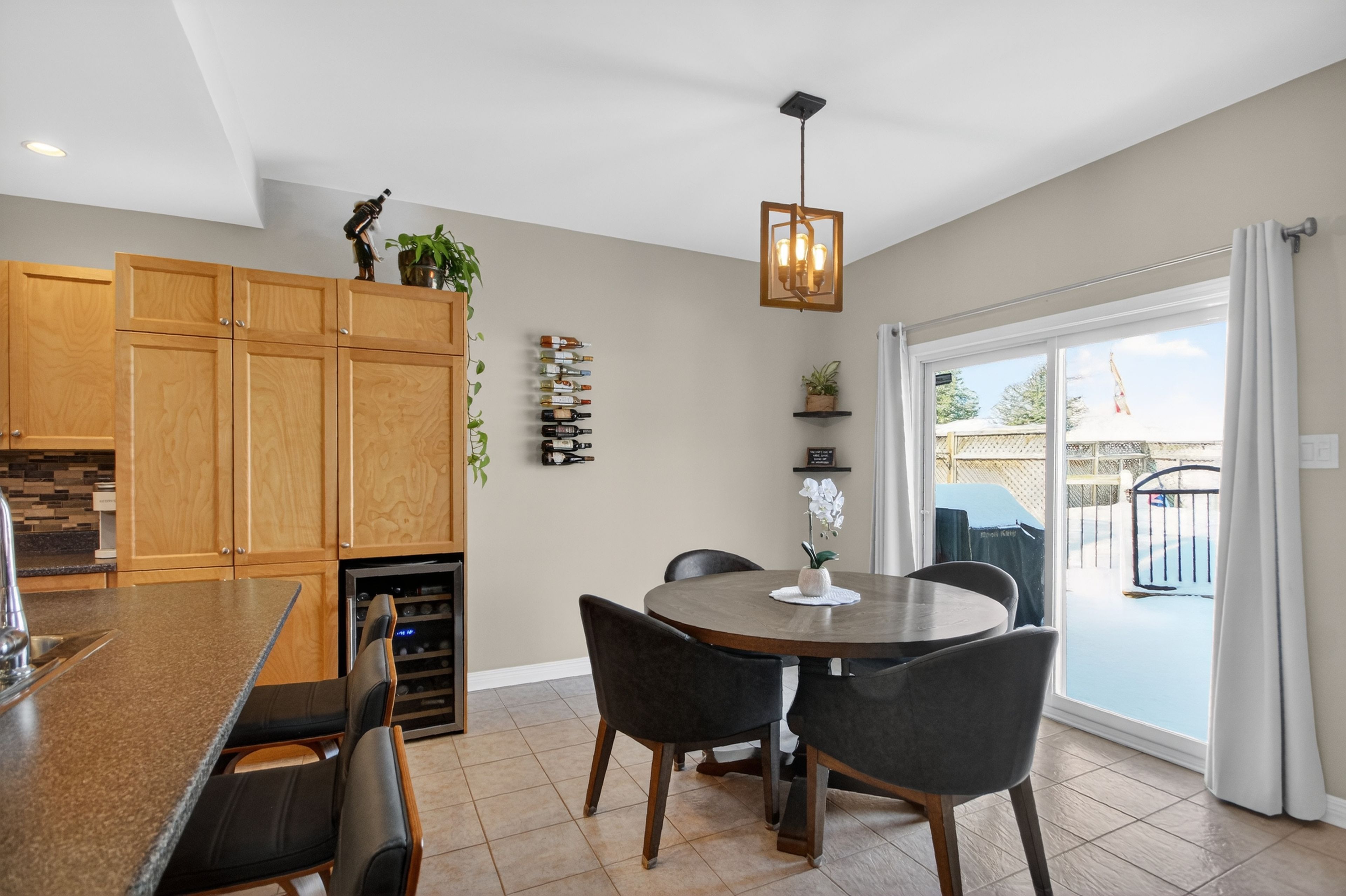 6291 ottawa street w. Beautifully maintained, original-owner 3 bedroom home. "silver birch" model by glenlyn homes. Open concept main floor living with neutral finishes, rounded drywall corners, and thoughtful details throughout. "great room" offers cozy fireplace, large bright window overlooking backyard oasis, and warm hardwood flooring with character. The kitchen is the heart of the home and features an abundance of cabinetry, additional pantry, island with breakfast bar, wine fridge, stainless steel appliances, pot lighting, tile backsplash, and large eating area that leads to the back deck. Flexible living room or dining room with crown molding ideal for everyday living or formal entertaining. Upstairs, the primary bedroom offers a vaulted ceiling, walk-in closet, and updated luxury ensuite. New carpeting adds warmth and comfort. Laundry room conveniently located on the second level. Finished lower level with large recreation room, den, 2 pc bath, and ample storage. Meticulously landscaped backyard complete with heated above-ground saltwater pool, spacious deck for entertaining, and gazebo ideal for summer enjoyment. Ideally located within walking distance to a catholic school, new parks, outdoor recreational spaces, an outdoor rink, and basketball courts. Minutes to richmond centennial golf course. This location offers an exceptional lifestyle for growing families. Note: furnace 2022, carpets 2025, roof 2016, 8' x 8' shed, 50-amp breaker w/240 volt 3 phase in garage.