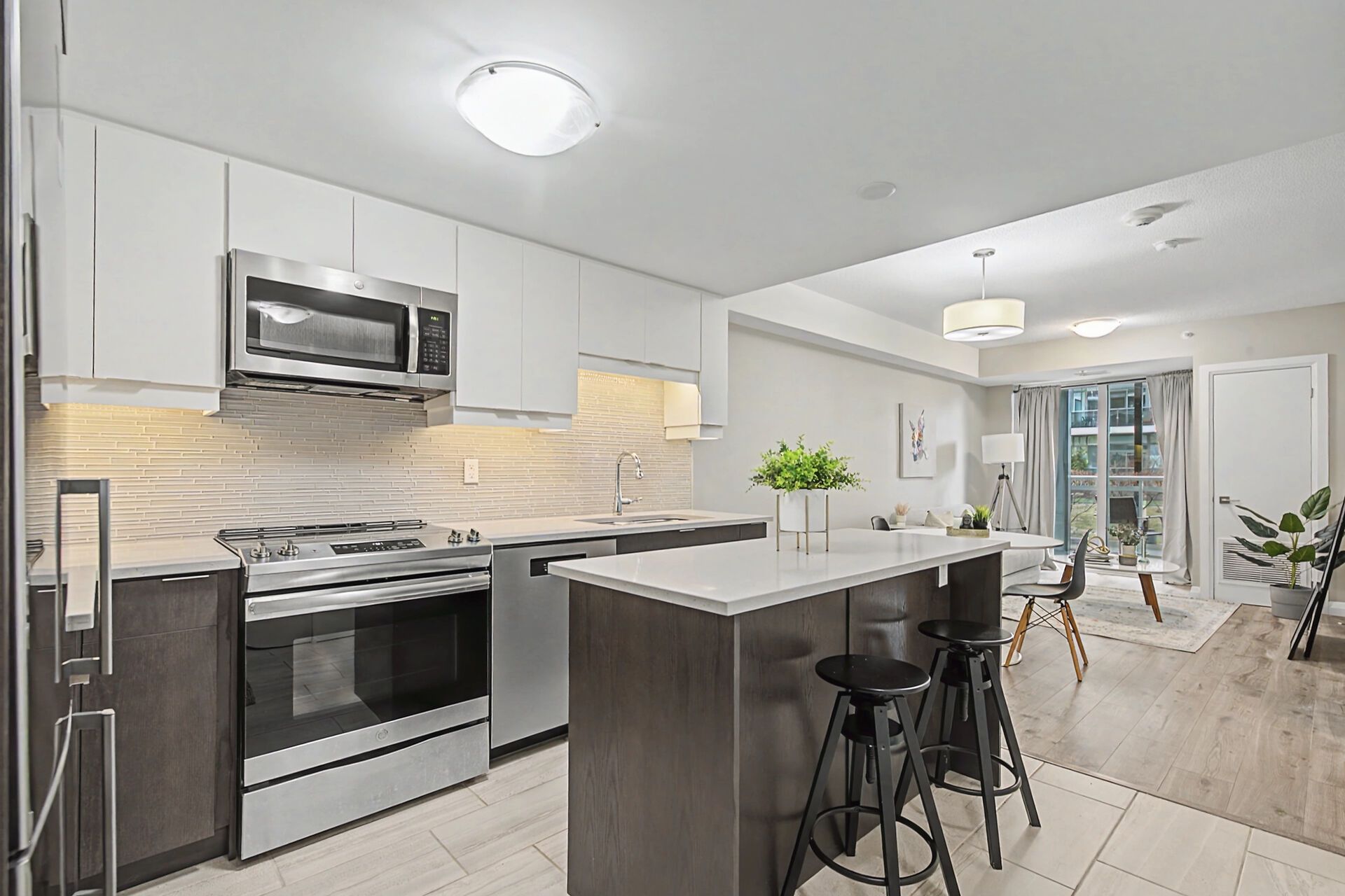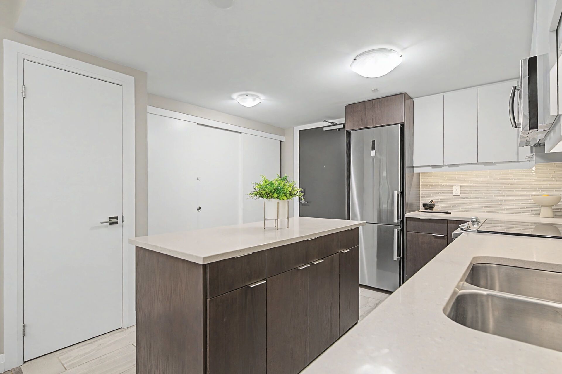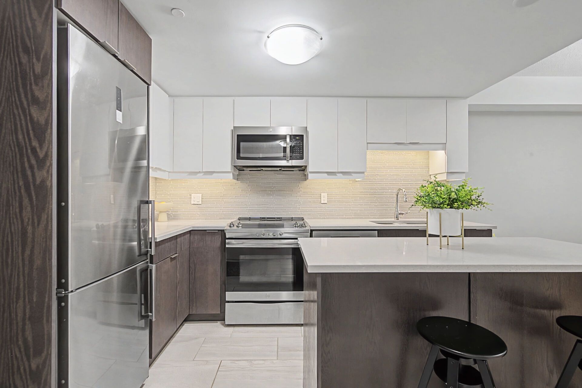 • Spacious kitchen with quartz countertops and modern appliances.
