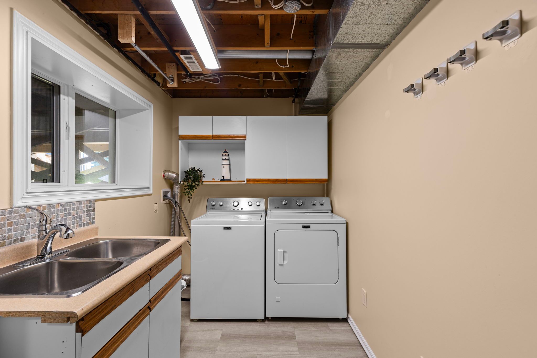 • Large double garage with ample paved driveway parking available.