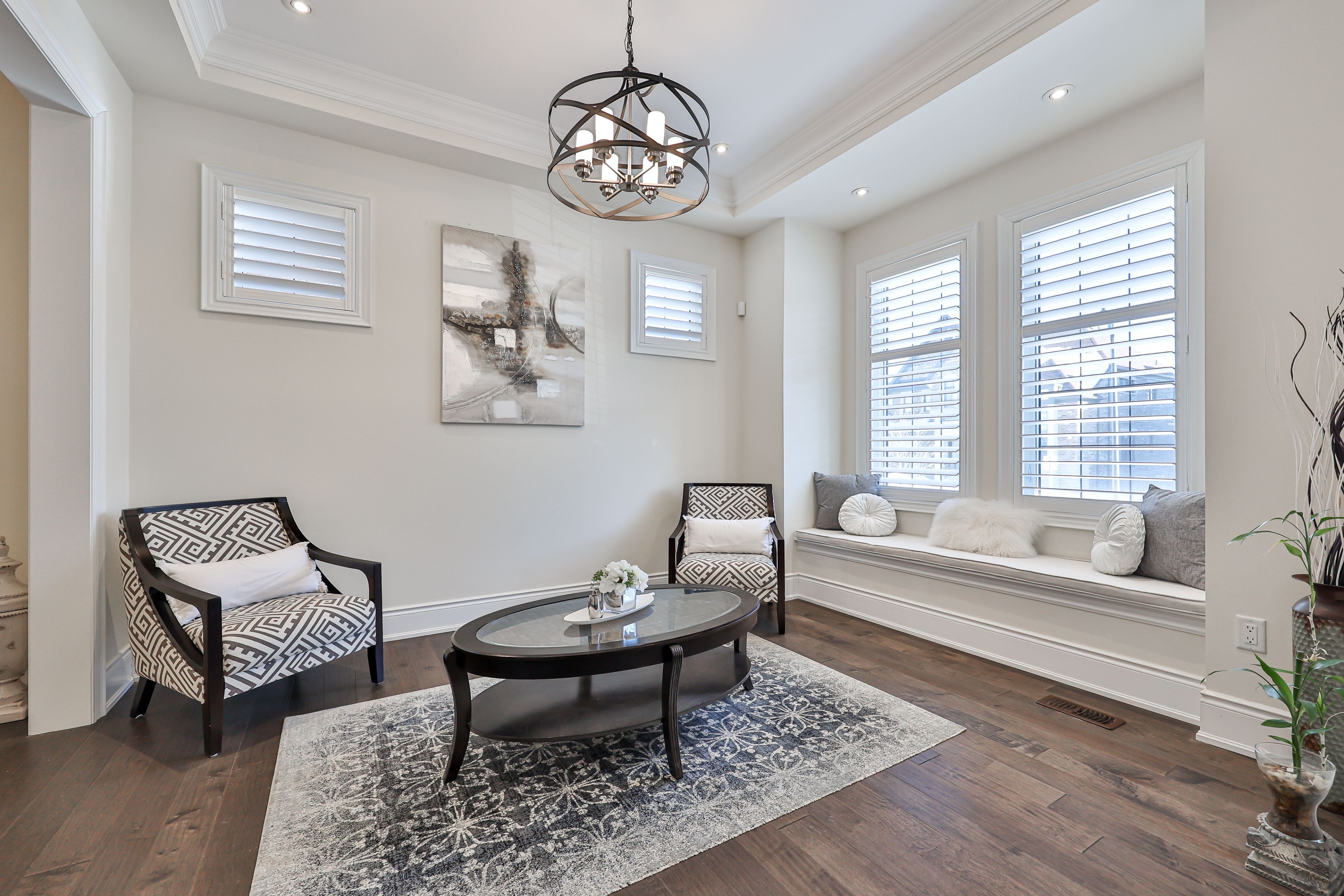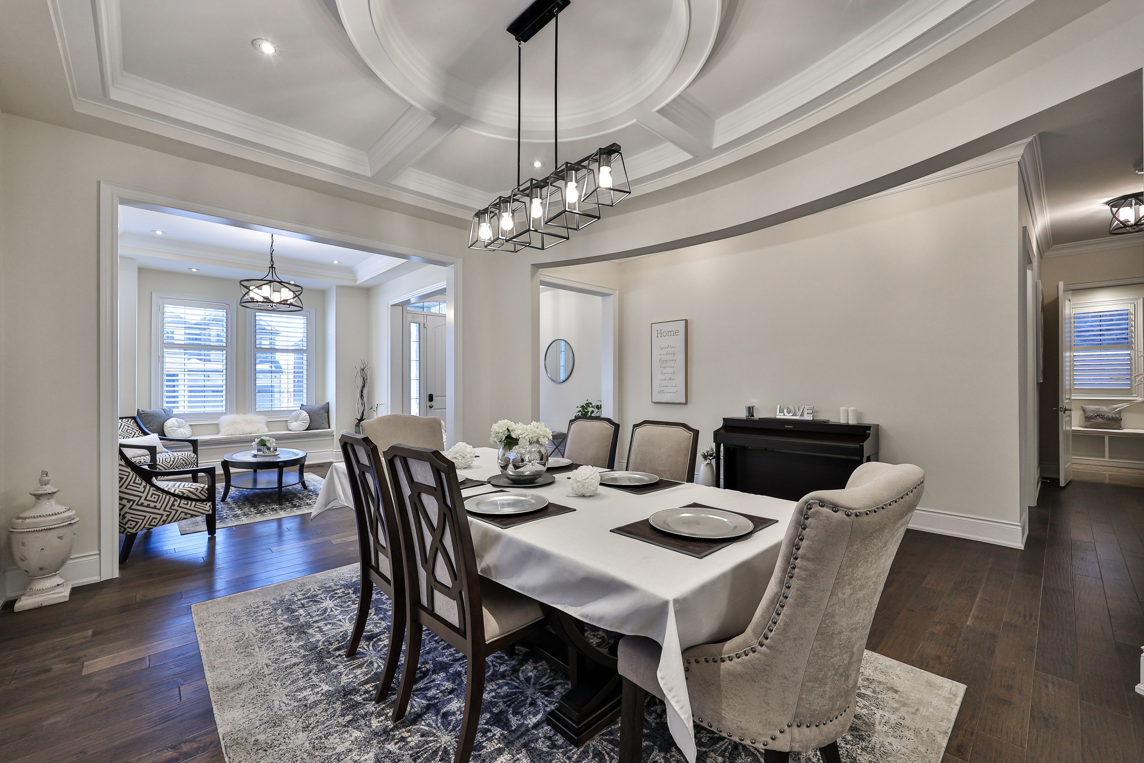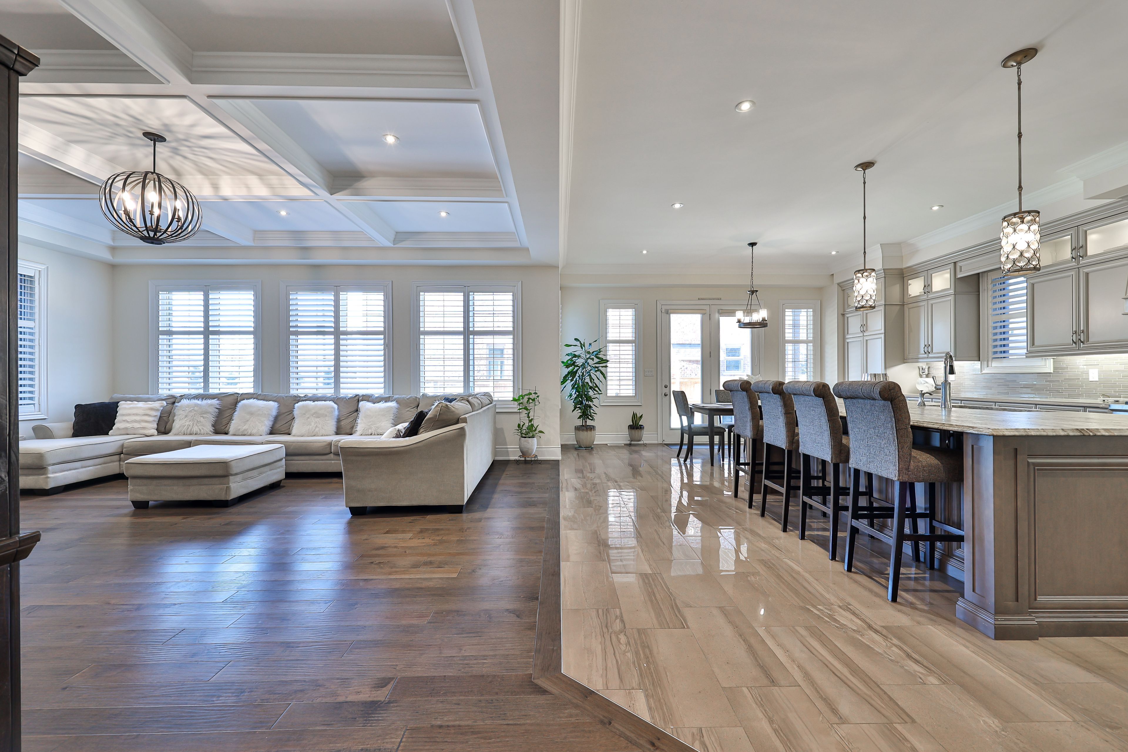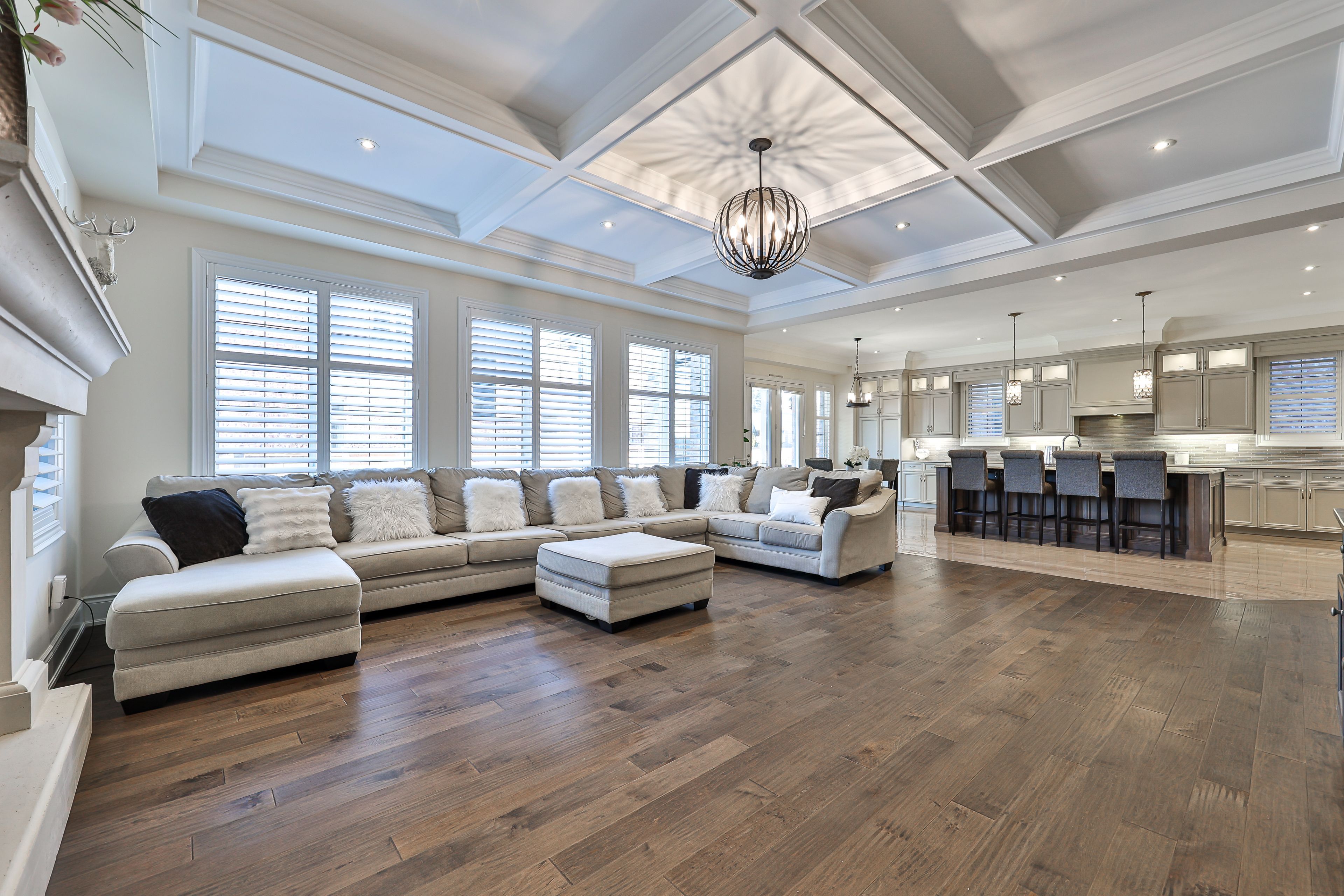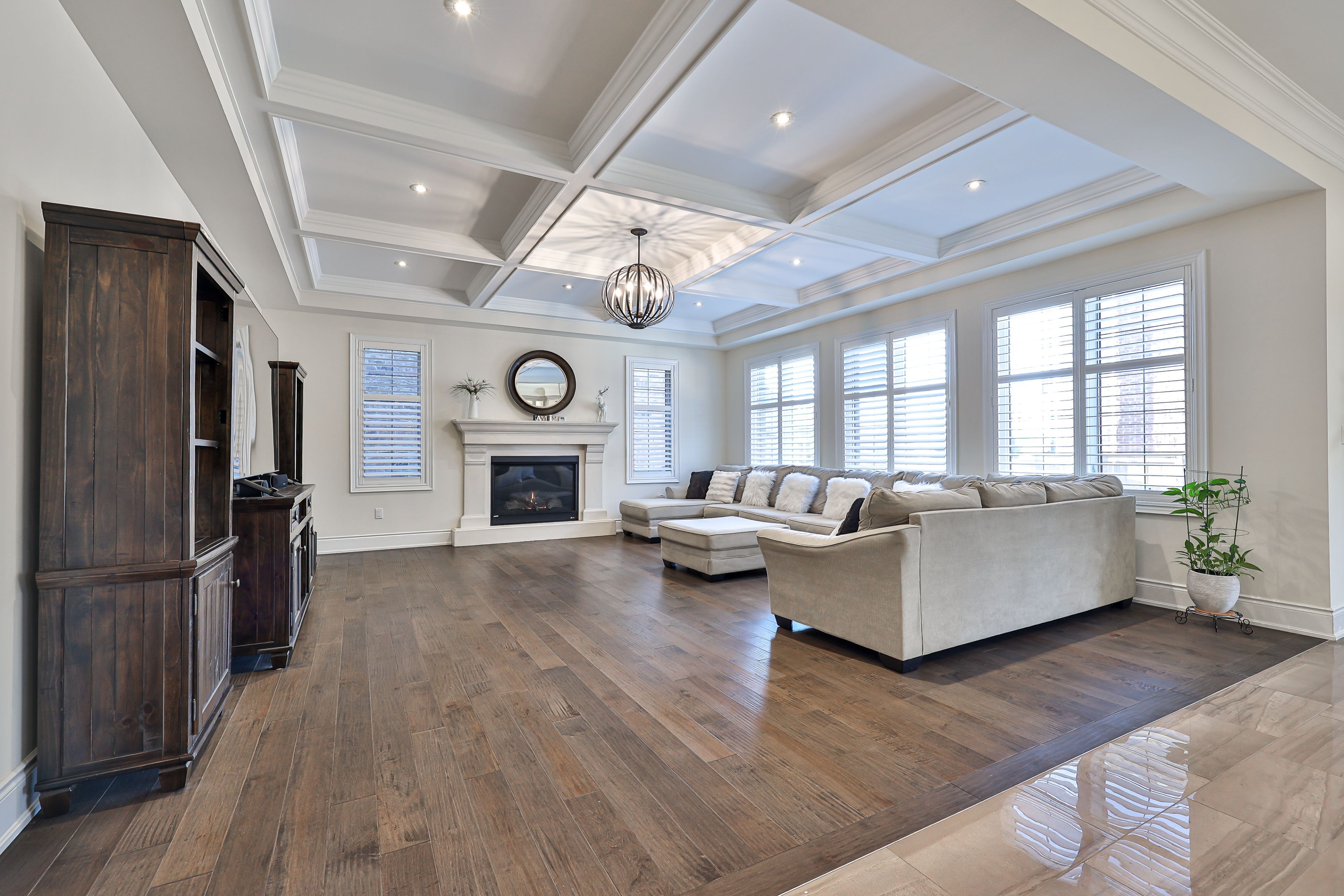 • Immaculate design features like coffered ceilings and hardwood floors.