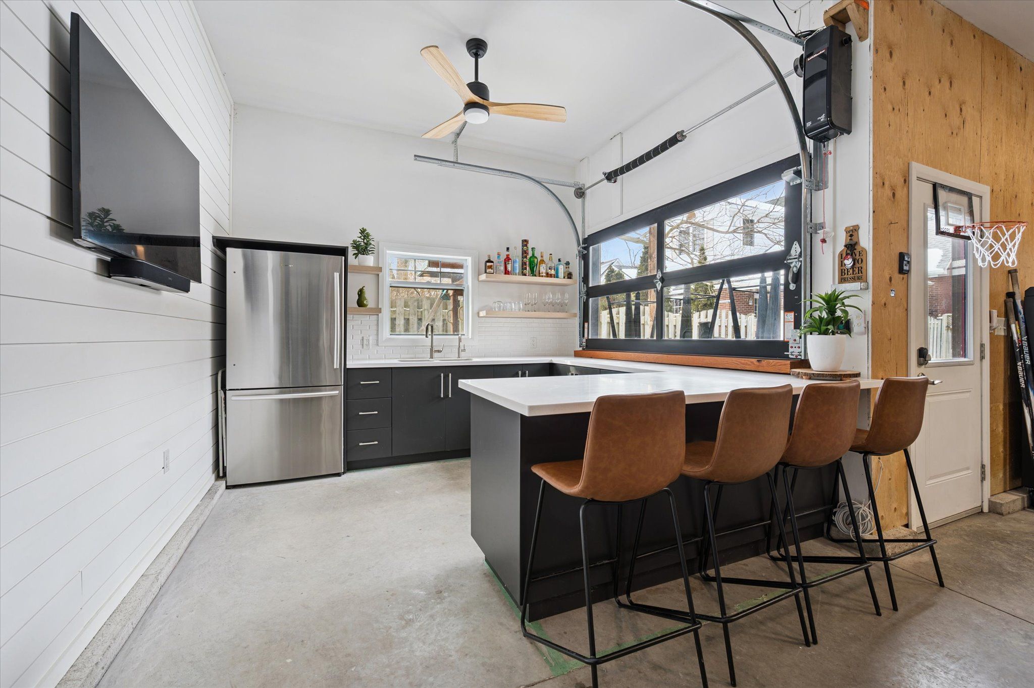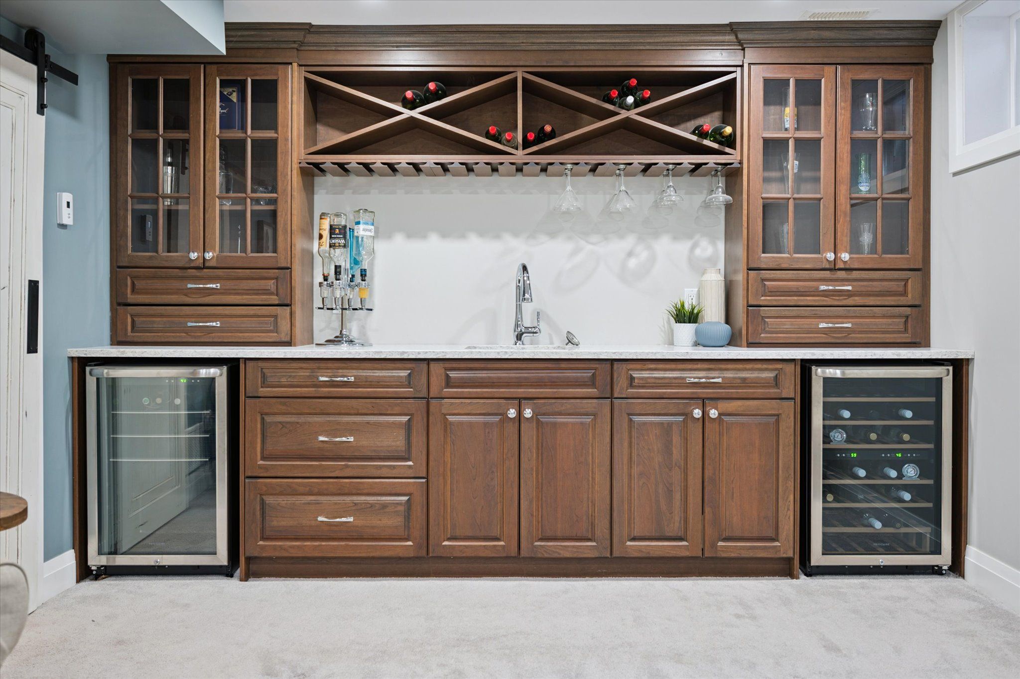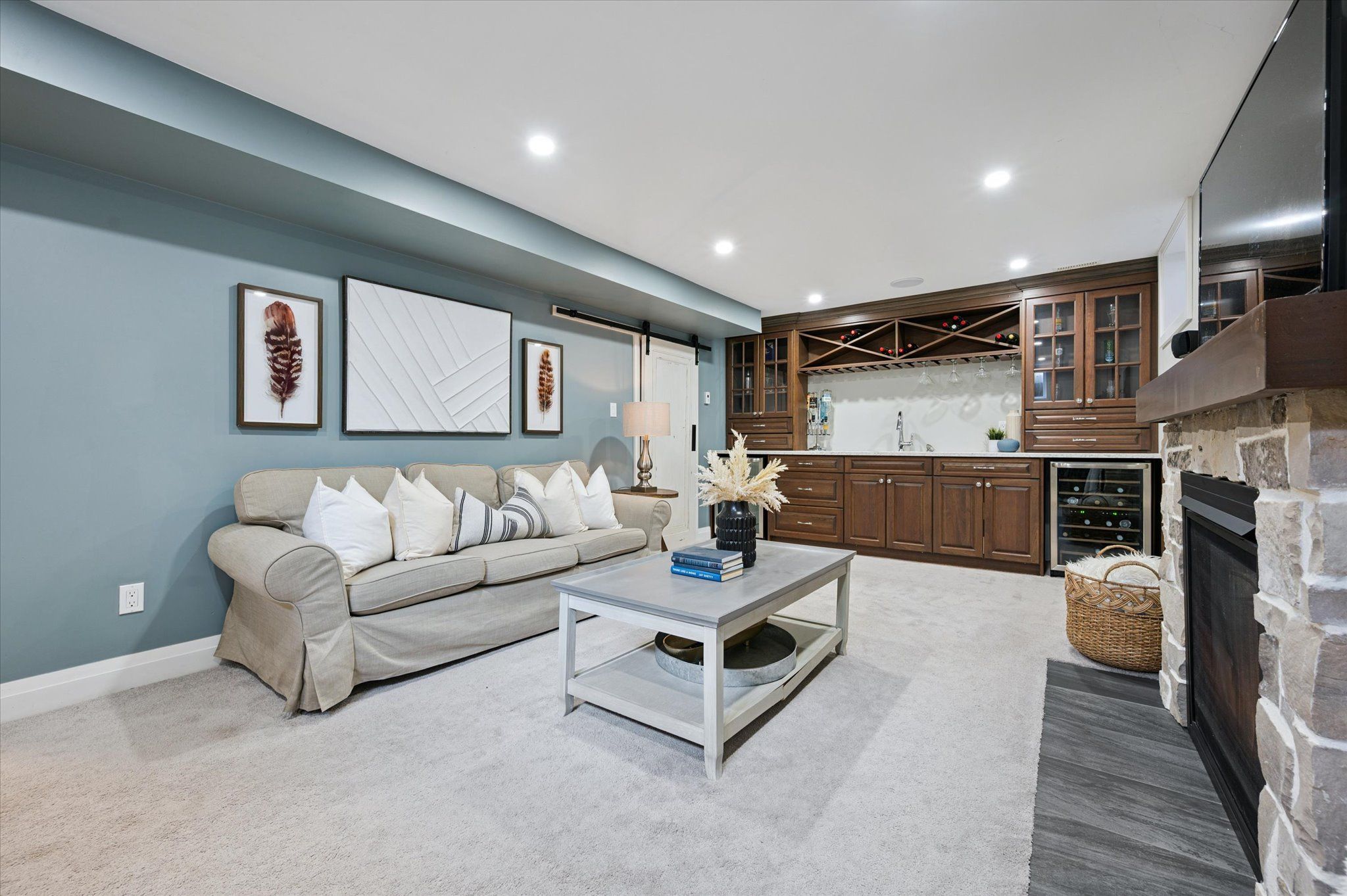 • Finished basement includes a stylish bar area for entertainment.