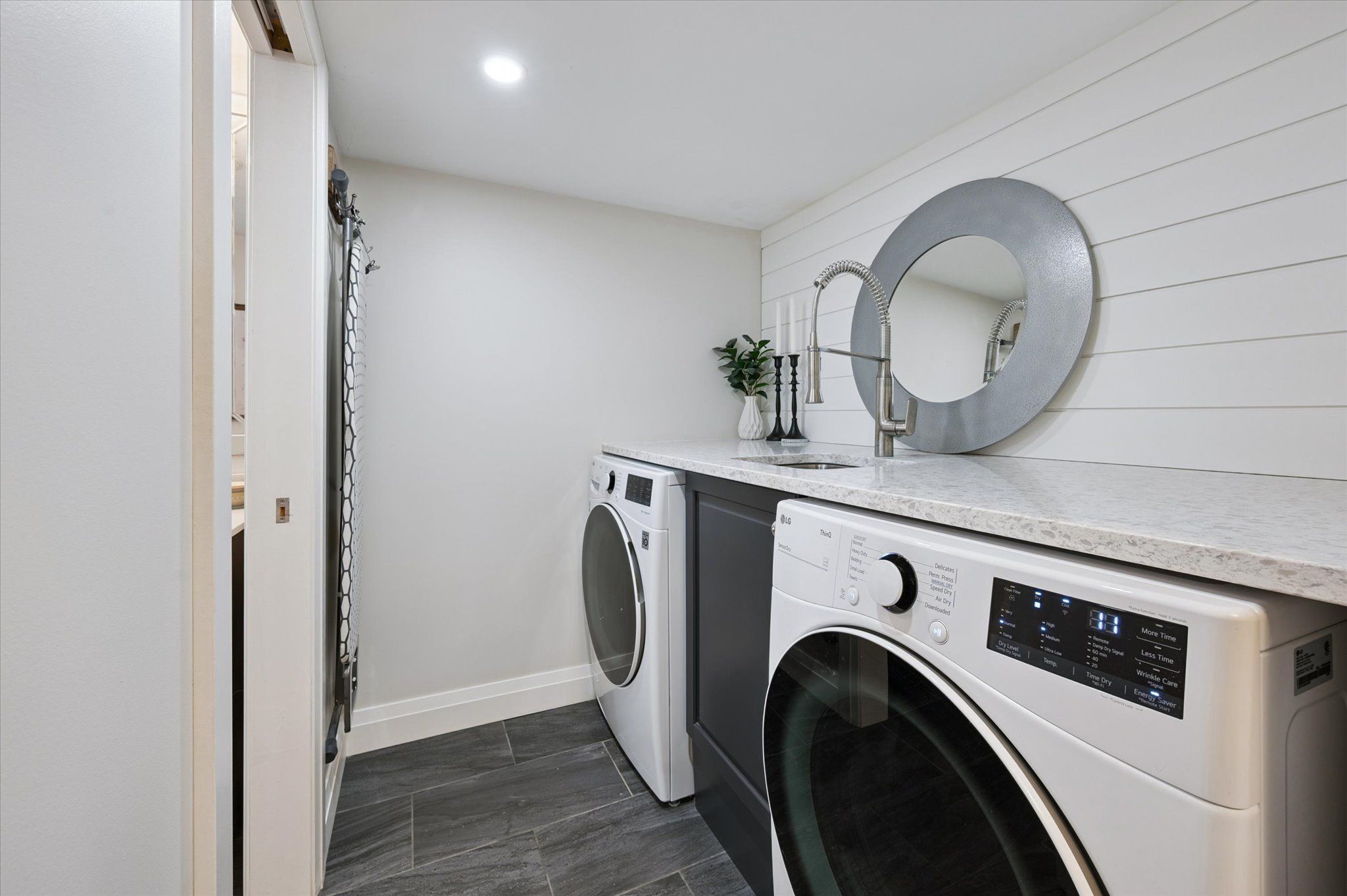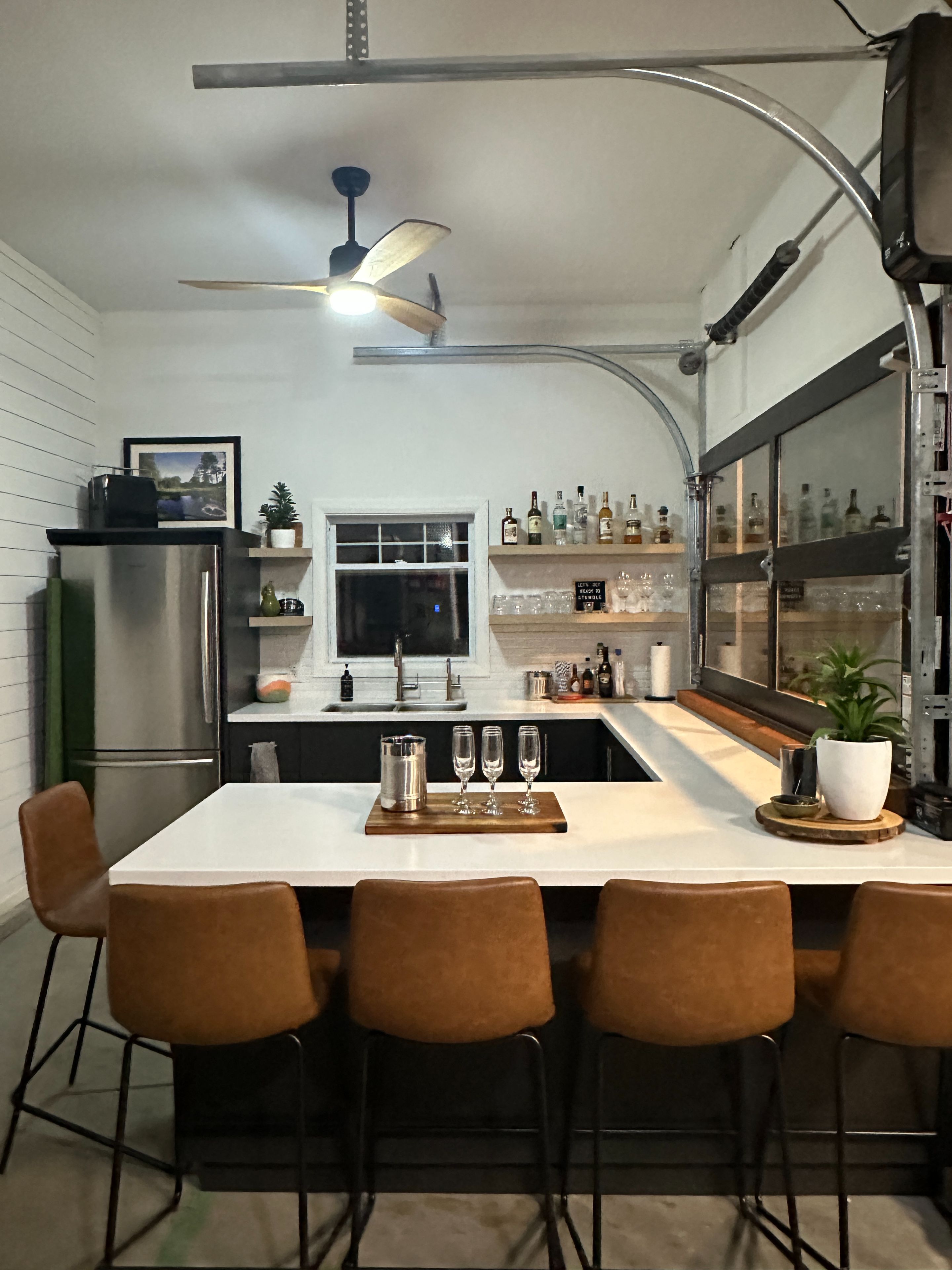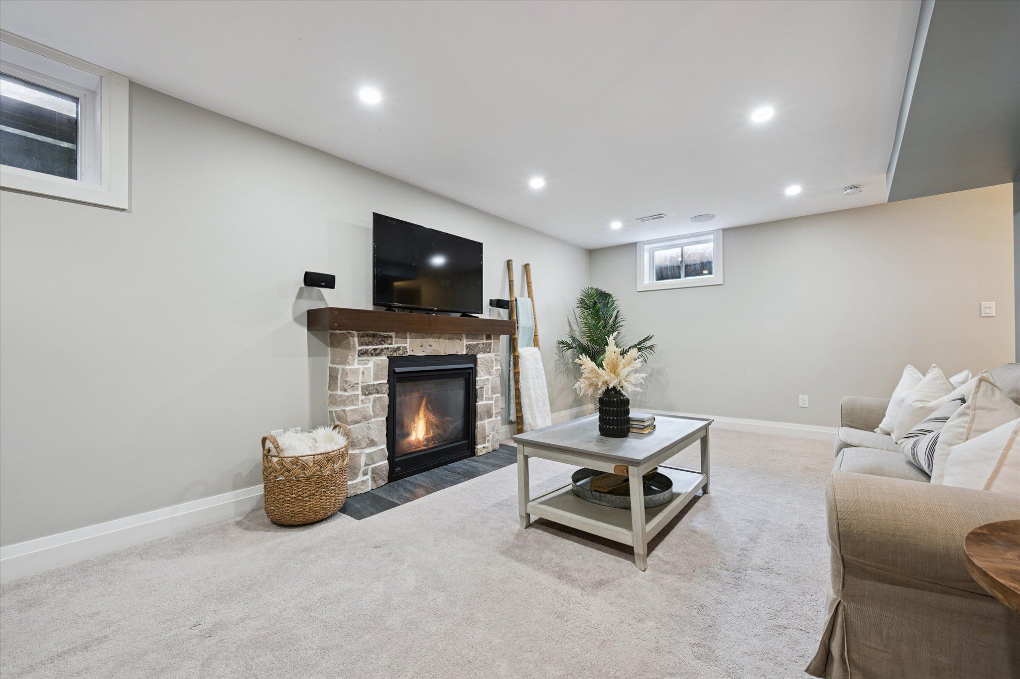 • Finished basement includes a stylish bar area for entertainment.