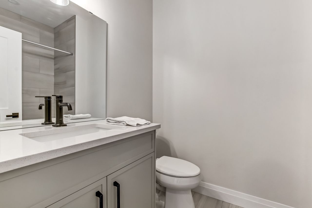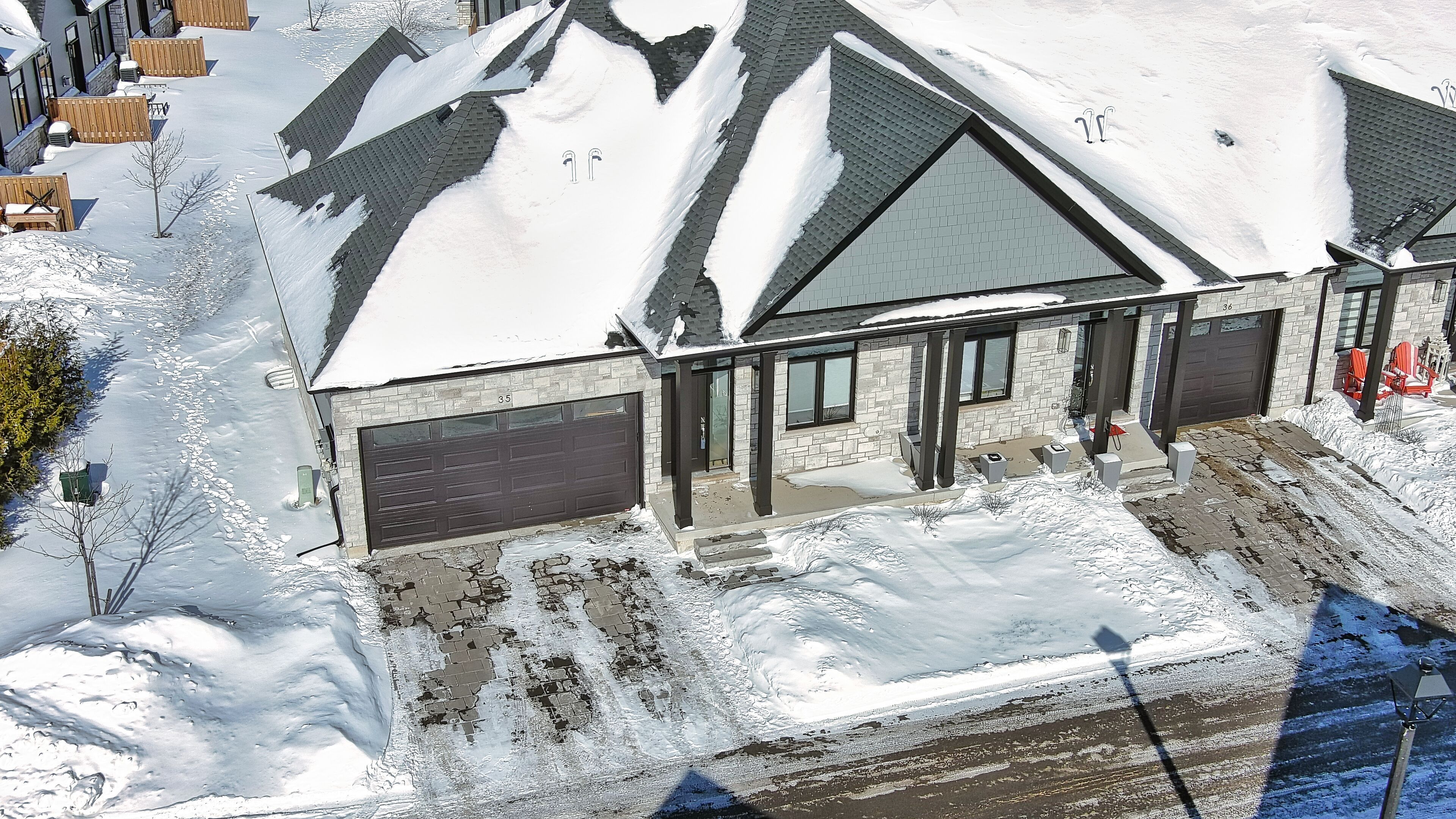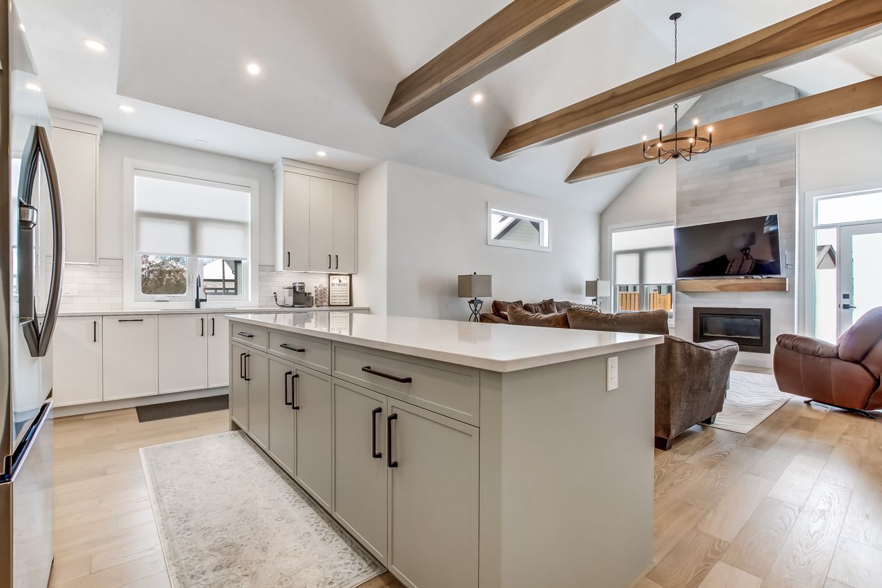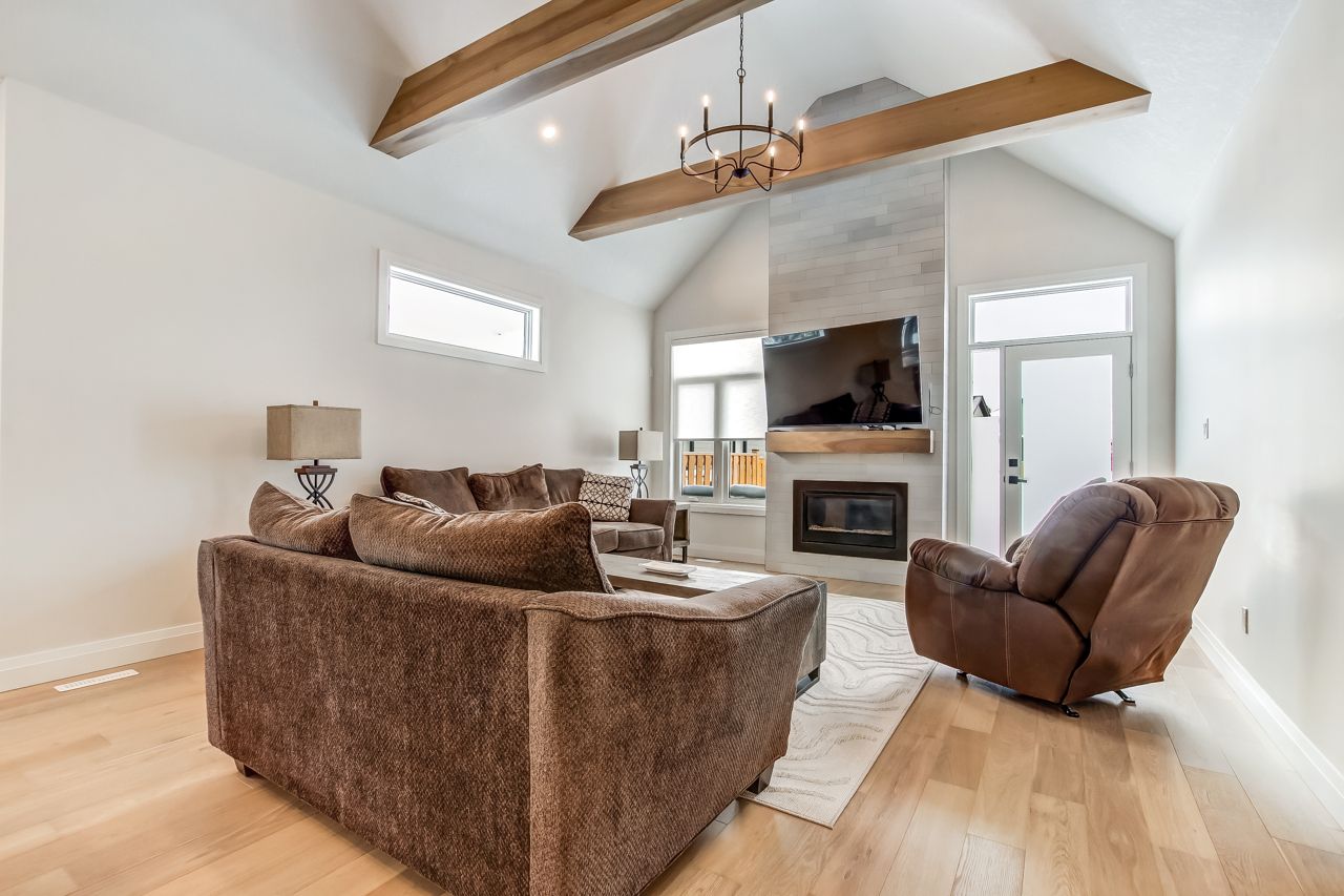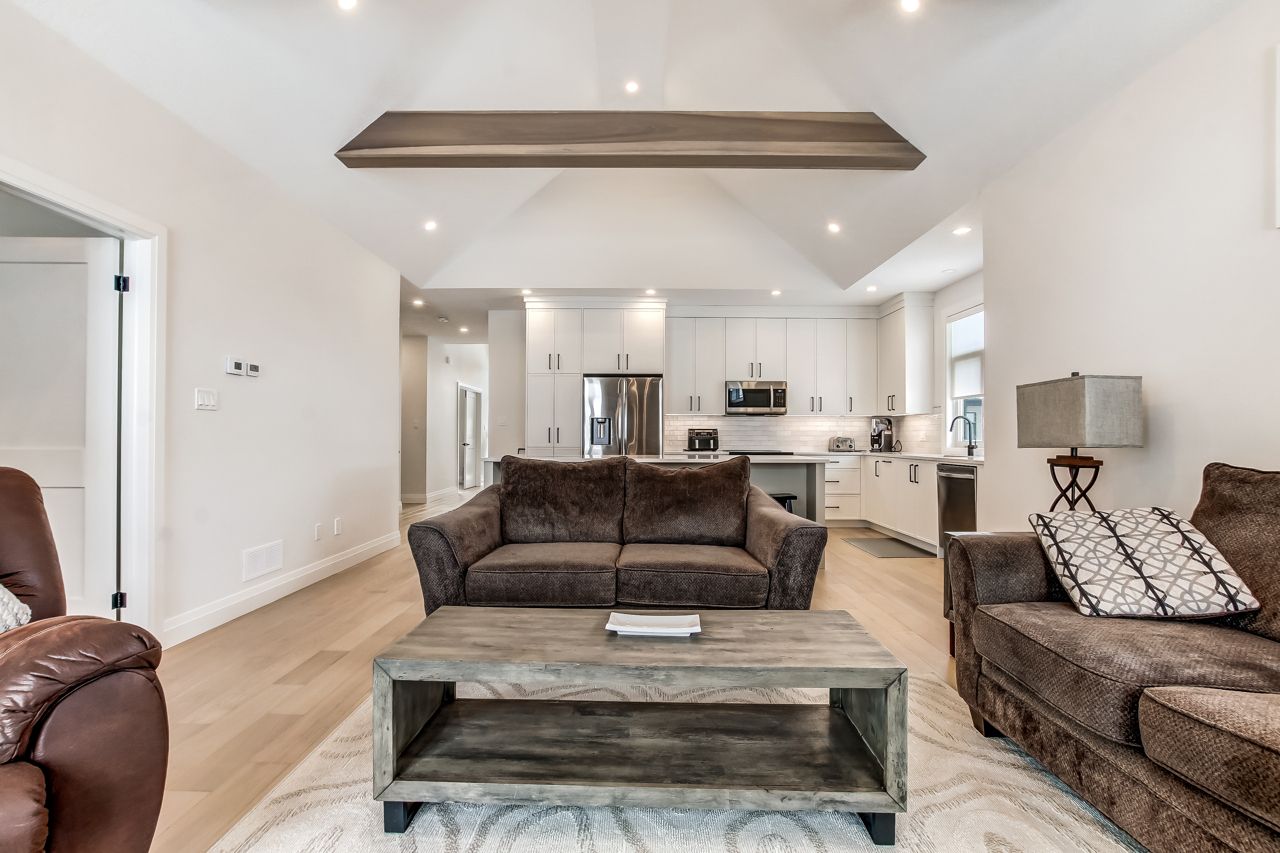 Welcome to 63 compass trail, unit 35, a newly completed condo development where you can move in immediately without the hassle or delays of construction. This sought-after location offers walking distance to the beach, downtown amenities, parks, and paved walking paths, making everyday living both convenient and enjoyable. A welcoming foyer sets the tone as you enter the home. Just off the entrance is a bright first bedroom or home office, highlighted by a large south-facing window. Continuing down the hallway, you'll find a 4-piece bathroom and direct access to the attached double-car garage. The heart of the home is a showstopper - an open-concept living space with vaulted ceilings and exposed beams, creating a bright and airy atmosphere. The oversized kitchen island with breakfast bar anchors the space and is ideal for hosting family and friends. The kitchen is finished with floor-to-ceiling cabinetry, quartz countertops, and ample prep and storage space. The adjoining living room includes a gas fireplace and opens to the back patio with a gas bbq hookup, extending your living space outdoors. The primary bedroom is conveniently located on the main floor, complete with a walk-in closet and a 4-piece ensuite bathroom. A main-floor laundry room adds everyday convenience, making this home especially appealing for those seeking main-floor living. The finished basement offers additional living space, including a third bedroom, 2-piece bathroom, and a recreation room perfect for relaxing or entertaining. There is also ample storage in the utility room, with the potential to create a fourth bedroom if desired. Step outside to enjoy your personal patio space, ideal for unwinding or entertaining. Residents of this well-maintained condo complex also enjoy access to an outdoor swimming pool and ample visitor parking. A bright, modern home in a fantastic location-move-in ready and waiting for you.