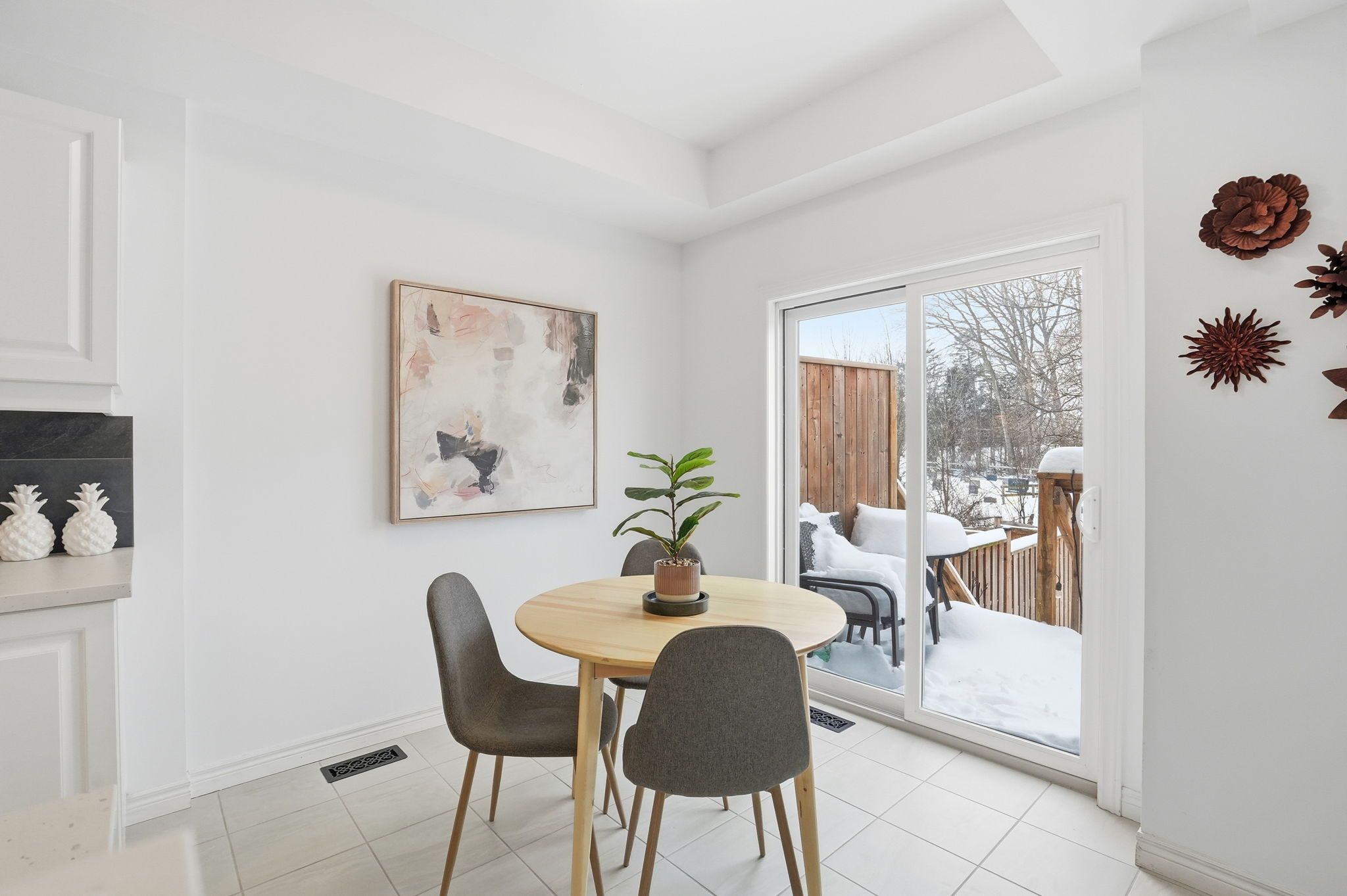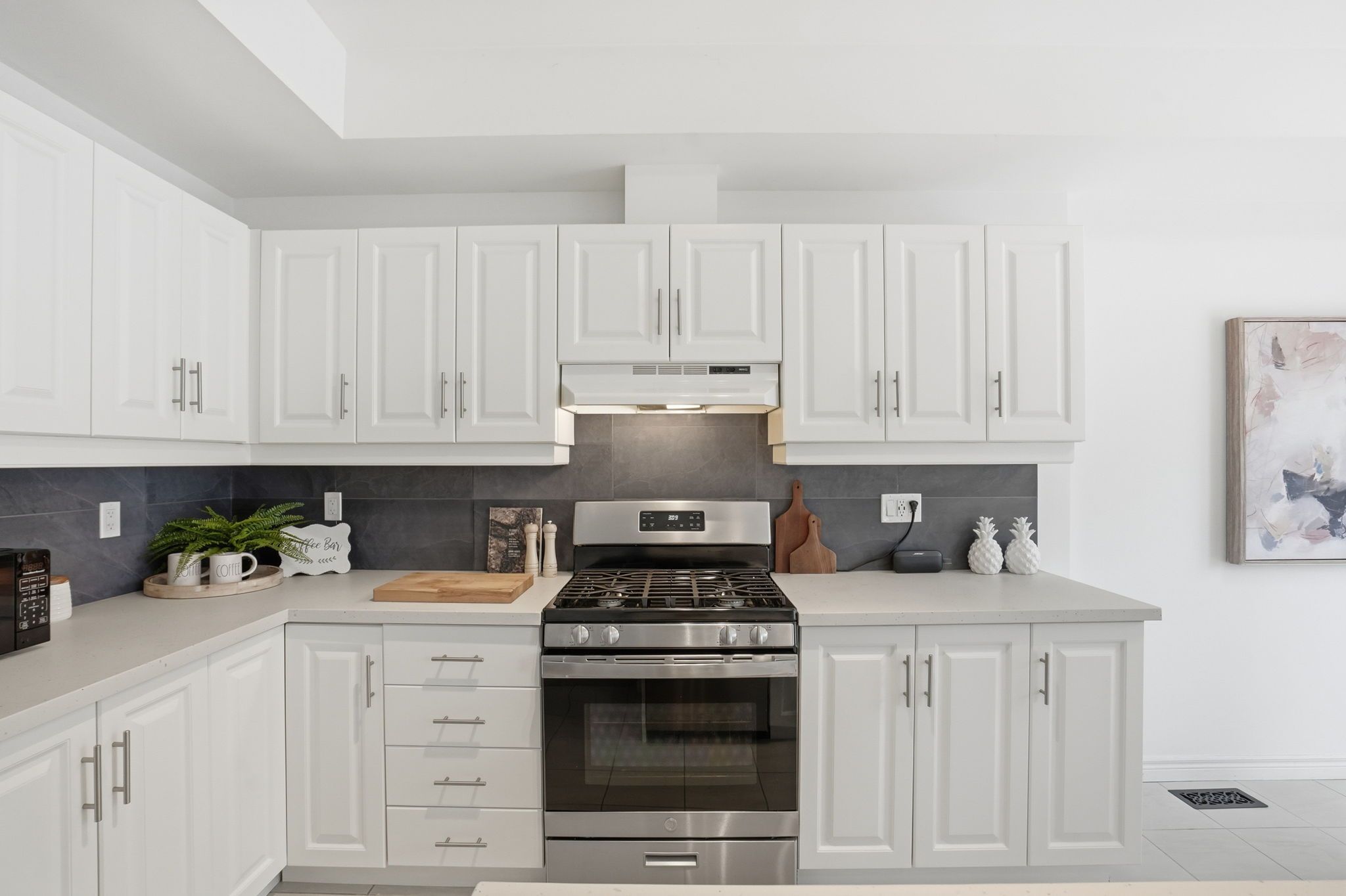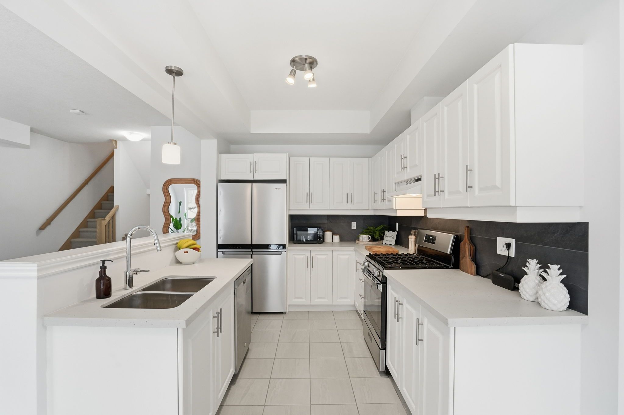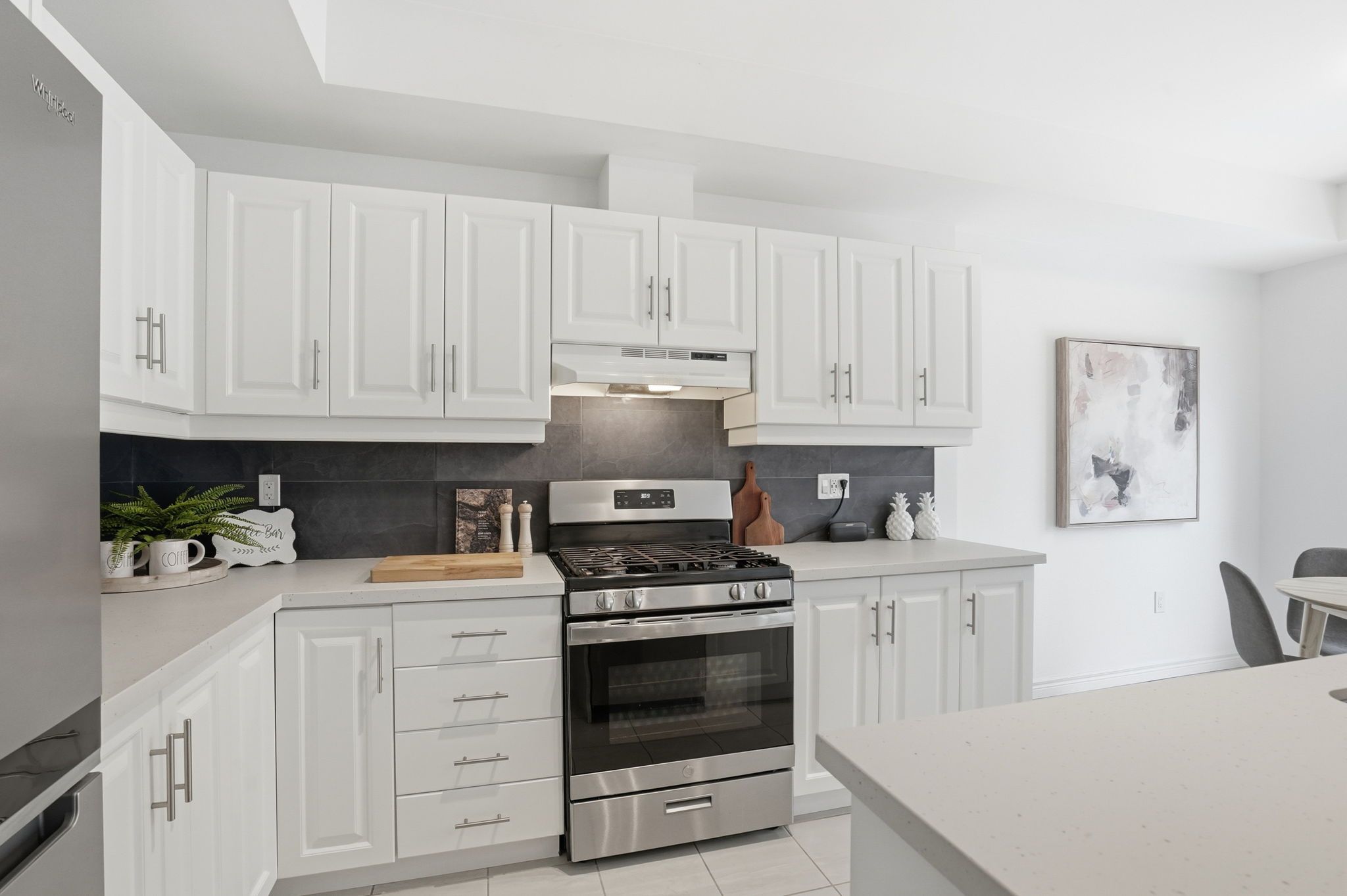 • Eat-in kitchen with quartz countertops, stainless steel appliances, and deck access.