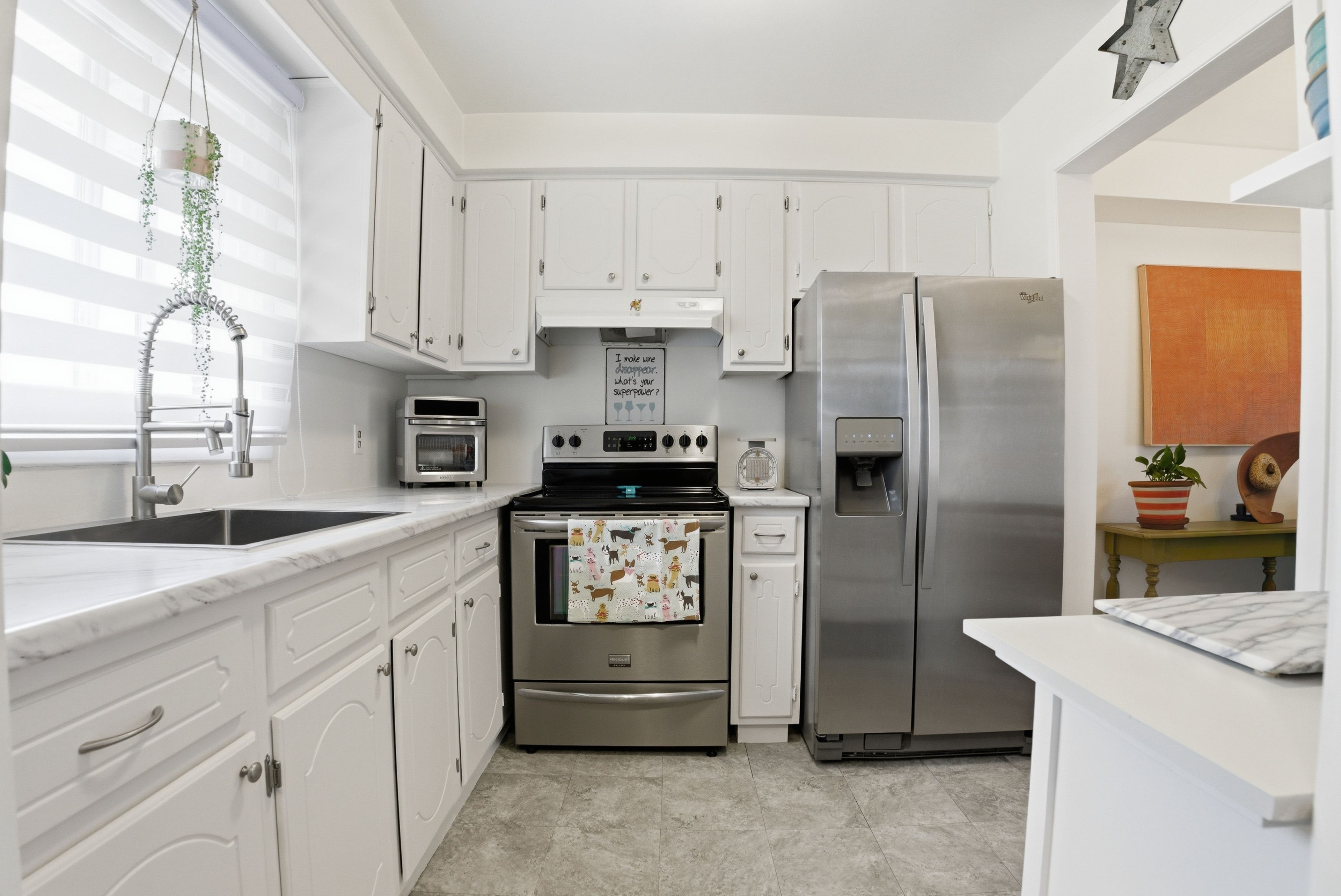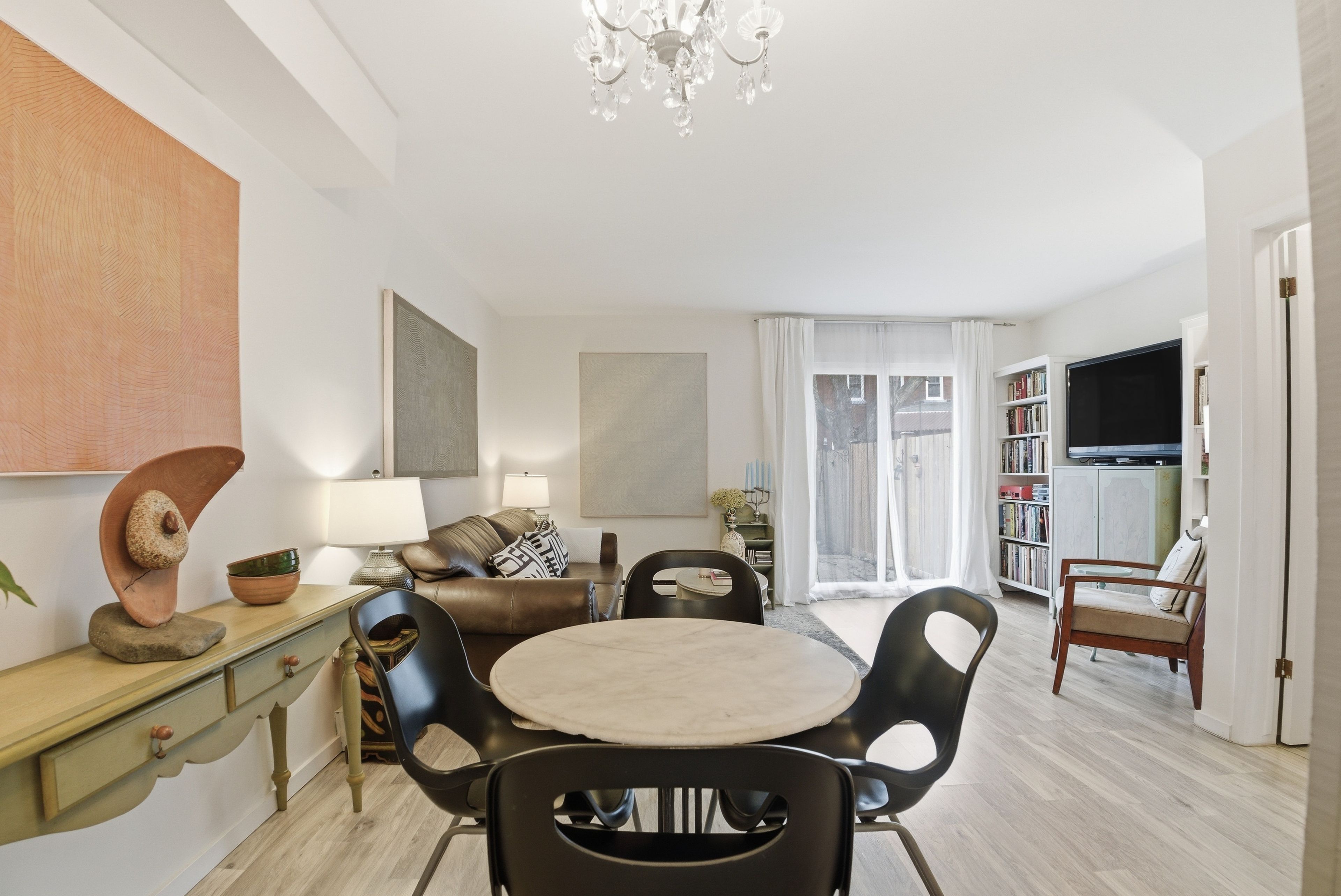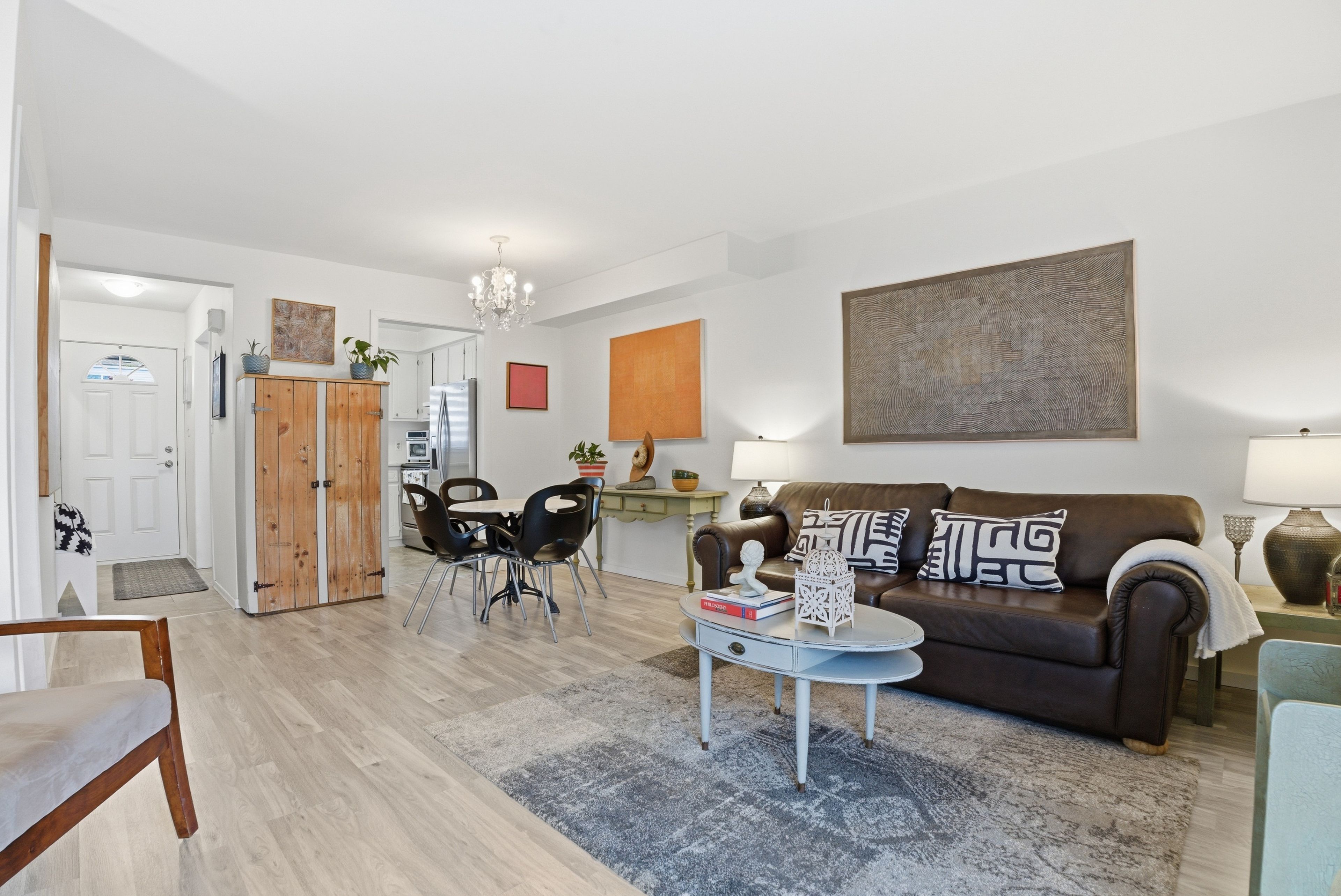 • Bright open-concept living and dining area with stainless steel appliances.