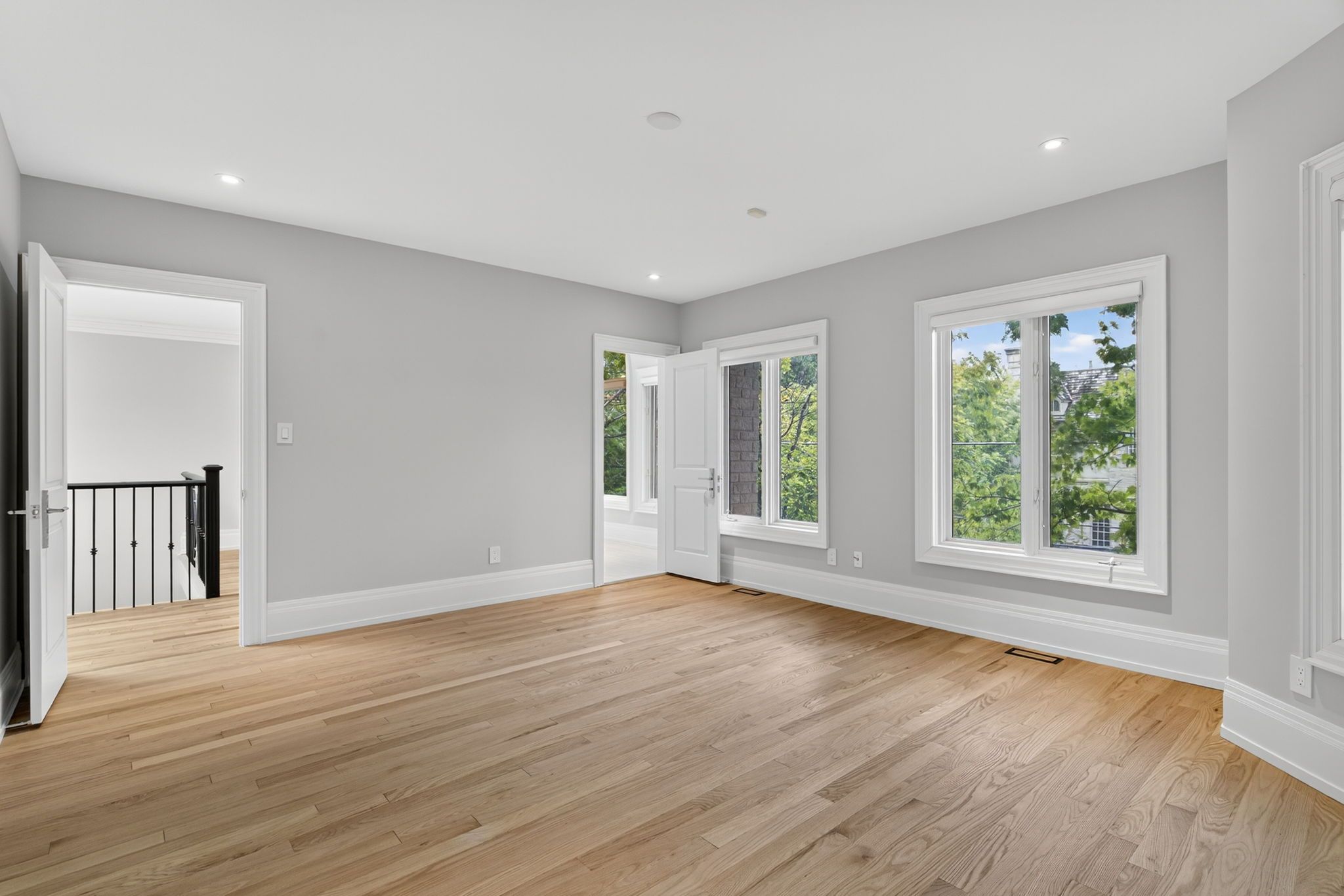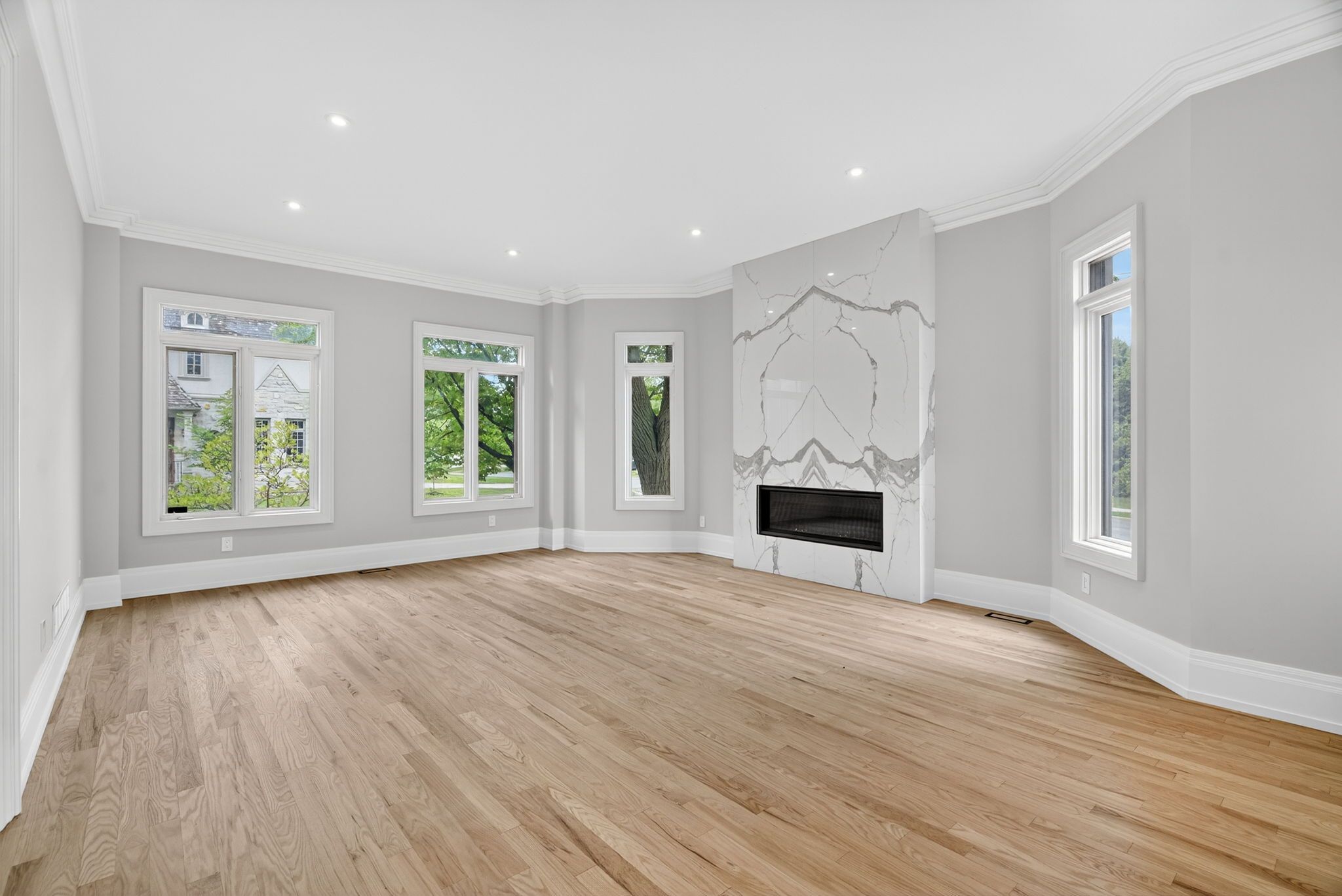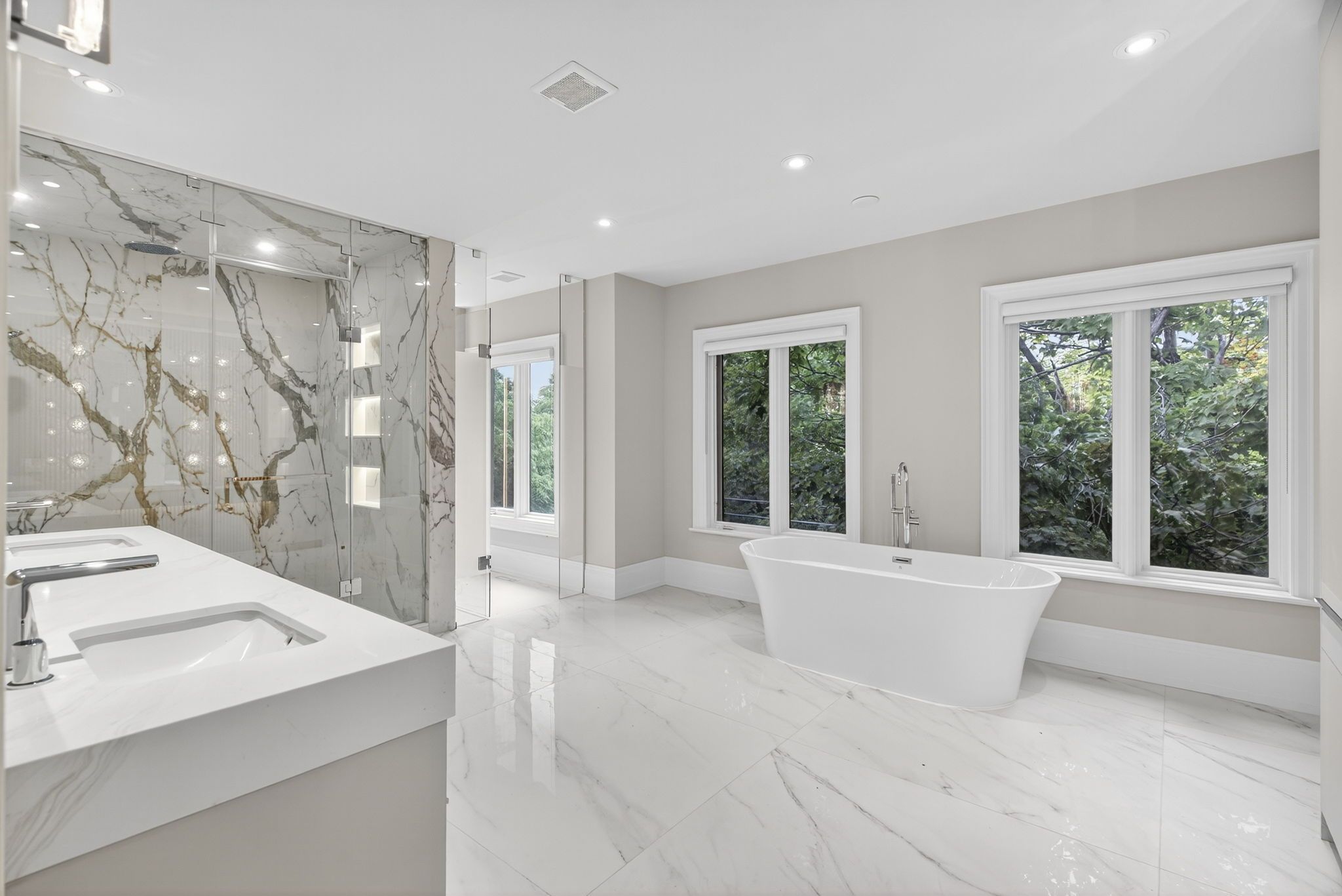 Stunningly renovated '25 luxe residence nestled on a coveted corner lot in one of st. Andrews most desirable enclaves with a rare 3 door garage. This extraordinary residence offers exceptional design, soaring ceilings, and modern finishes throughout. A grand foyer welcomes you with a sweeping staircase cascading in natural light from a skylight above. Designed for both elegance and functionality. The gourmet kitchen is a chefs dream, complete with a breakfast area and walkout to a deck that overlooks beautifully landscaped rear gardens. A sophisticated main floor library showcases custom wall-to-wall built-ins and rich paneling. The luxurious primary suite is a private retreat with a lavish dressing room offering both open and closed storage, a decadent 6-piece ensuite, and a secluded deck with serene garden views. Four additional bedrooms and three well-appointed bathrooms complete the upper level. The expansive lower level is designed for relaxation and versatility, featuring a nanny suite, recreation room with gas fireplace, an exercise room, cedar sauna, and a bright walk-up. Outdoor living is enhanced by a stone patio and an inground pool with waterfall, all surrounded by mature landscaping for ultimate privacy. Just steps to renowned schools, shops and eateries.