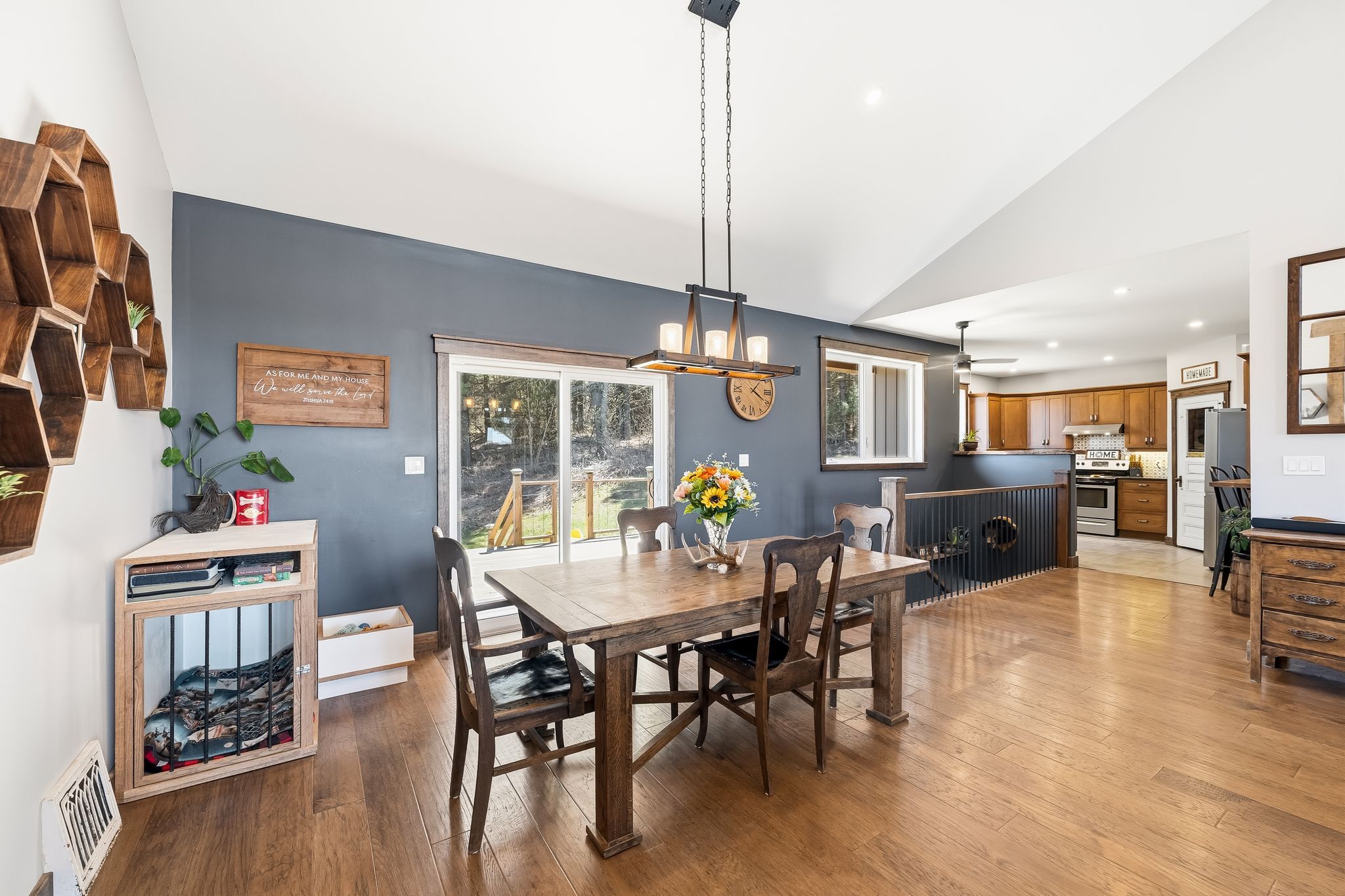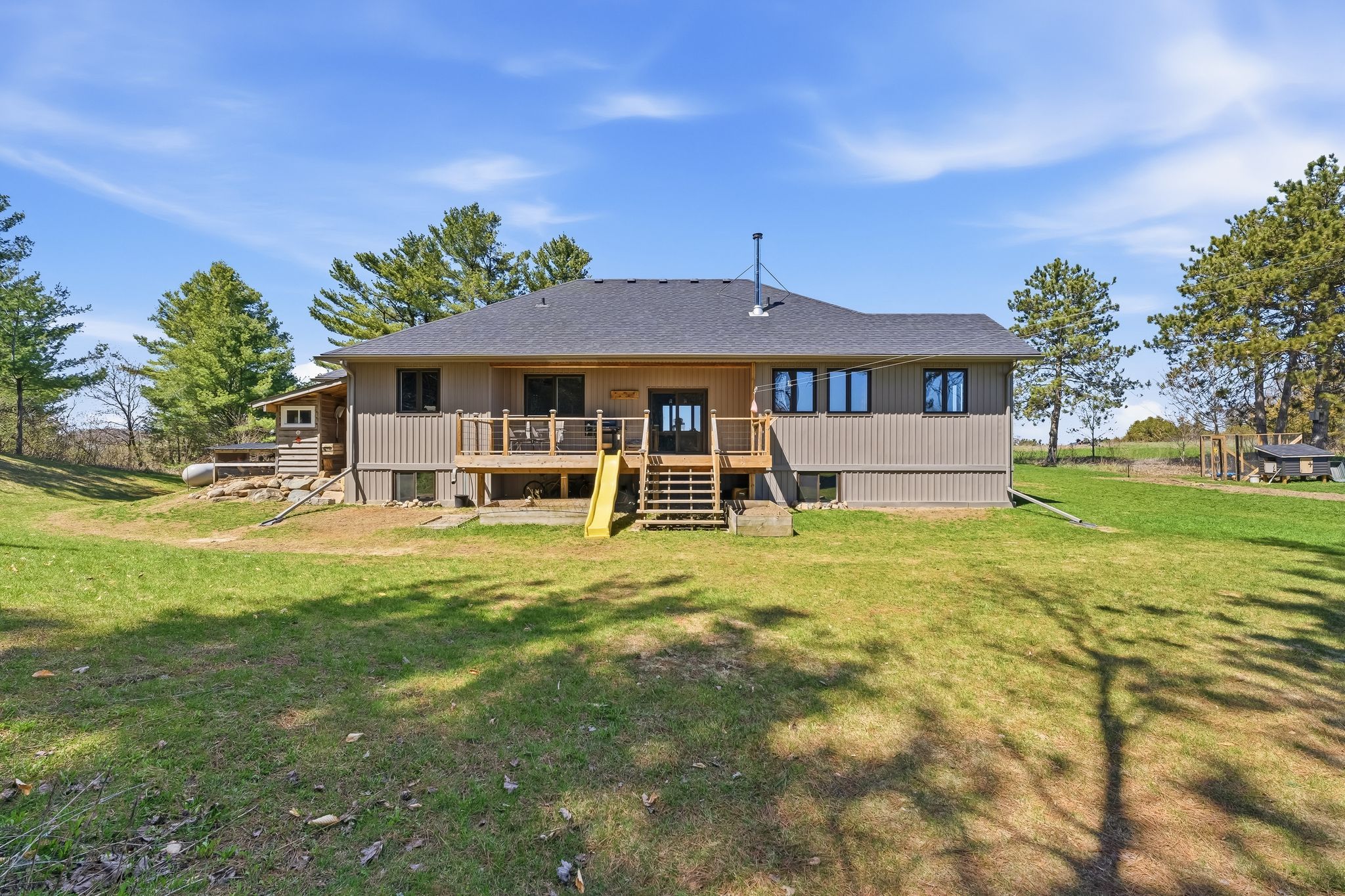Tucked away on a quiet country road just minutes north of highway 401, this beautiful home on 2. 13 private, treed acres is more than a home - it's where family memories are made and dreams of country living come to life. Watch breathtaking sunsets from the living room or primary bedroom, gather around the fire pit on cool evenings, and wake up each morning to the kind of peace and quiet that's becoming hard to find. The main floor is thoughtfully designed for family life, offering three bedrooms including an incredible primary retreat with vaulted ceiling, a walk-in closet, 3-piece ensuite, and a door to a private deck - the perfect spot for quiet reflection. The handsome kitchen offers plenty of space for cooking and the pantry keeps all your supplies tucked out of sight. A 4-piece guest bath, main floor laundry, and a mudroom with attached garage access keep busy family days running smoothly. The main floor living room with vaulted ceiling, flows seamlessly into the large dining area which opens through a patio door to the rear deck, ideal for summer dinners and celebrations that become your most treasured memories. The fully finished basement expands the living space beautifully, featuring an office, family room, recreation and exercise areas, a spacious 4th bedroom, and a sprawling 5-piece bath. A walk-up entry provides quick access to the garage. Outside, the expansive private yard offers endless possibility - tend your own vegetable garden, let the kids roam freely, and for those who dream of hobby farm life, there's plenty of room for backyard chickens, ducks, or other animals. Outbuildings provide great shelter or storage, and the acreage gives every family member space to grow, explore, and simply be together. Your family's next chapter starts here.