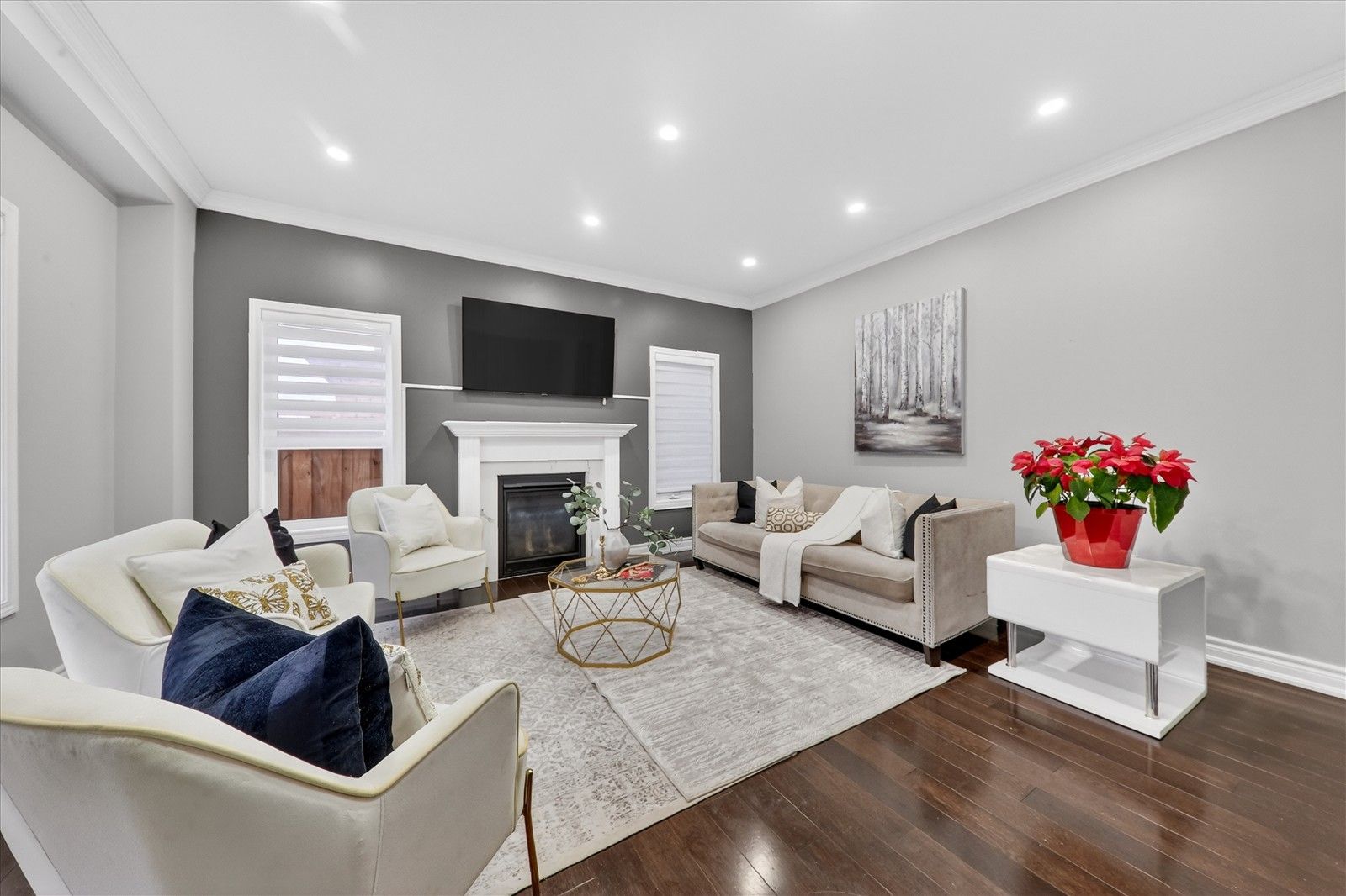 • Open-concept main floor with hardwood floors and gas fireplace.