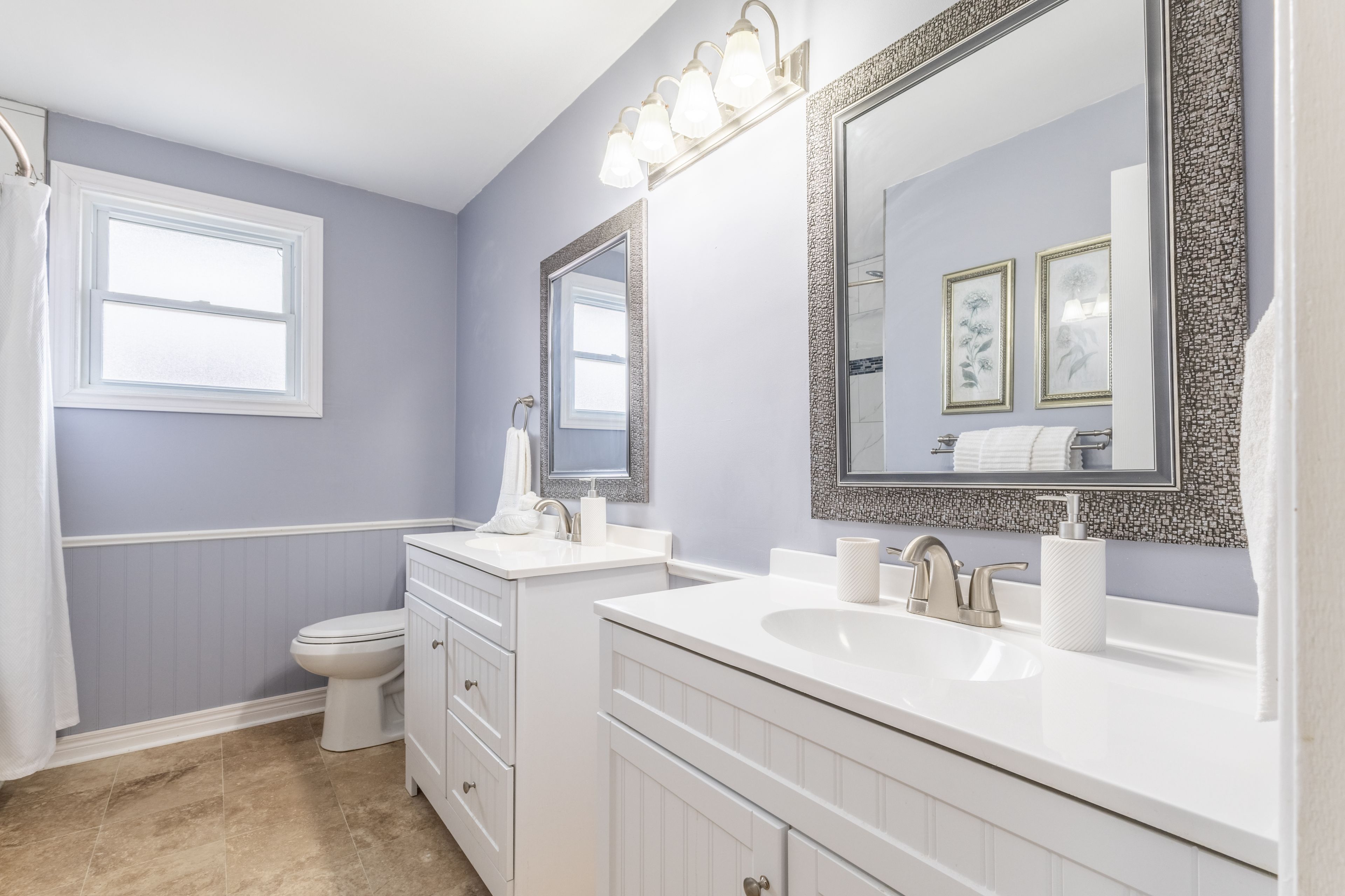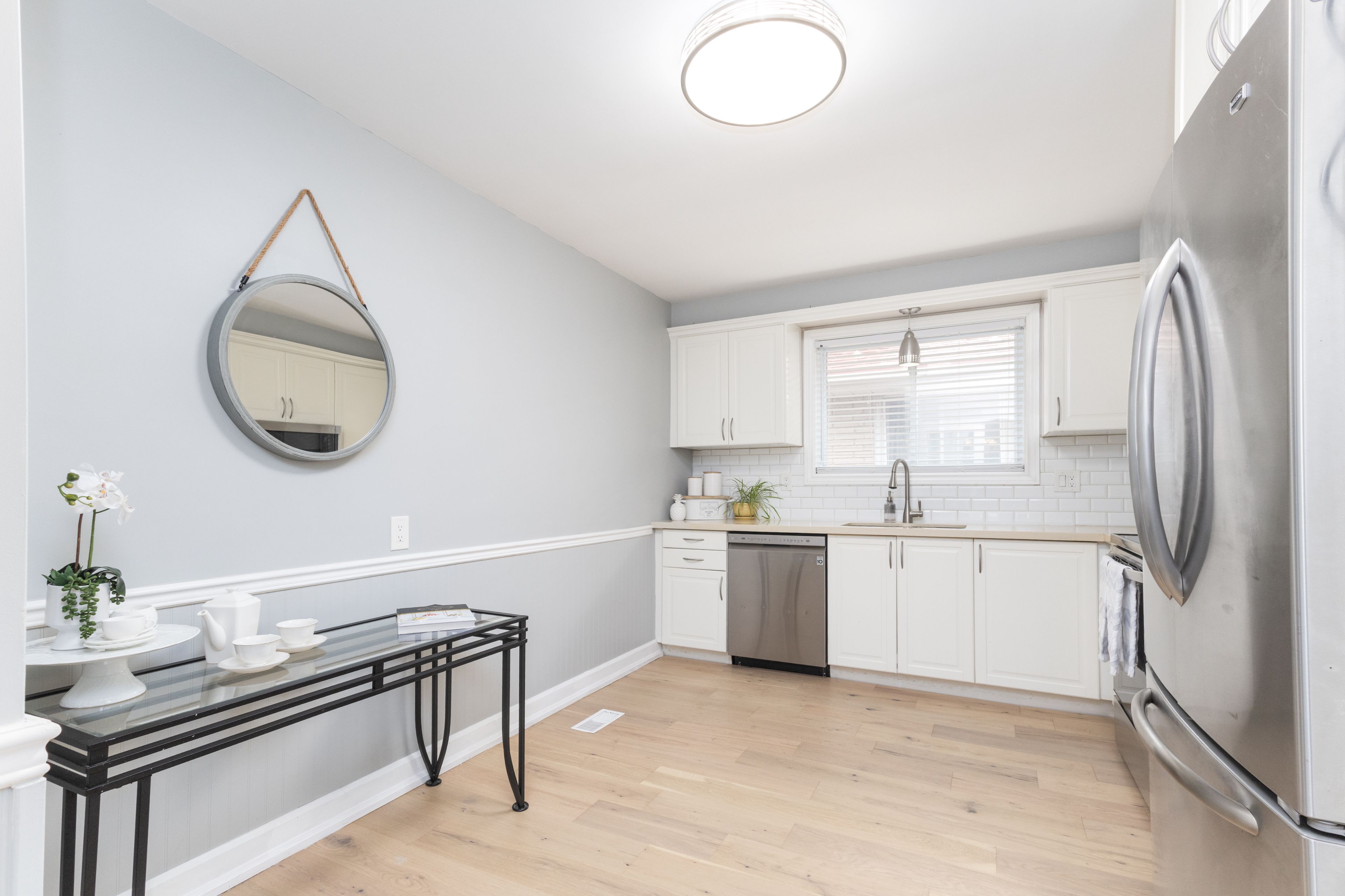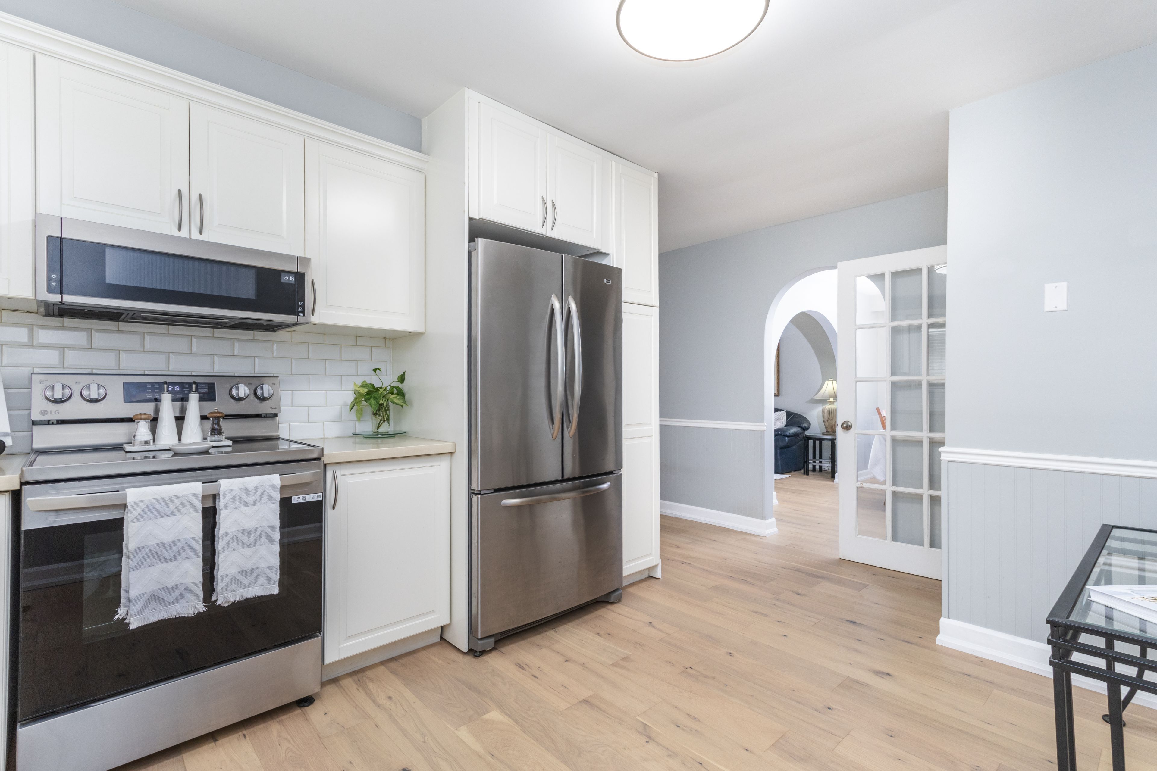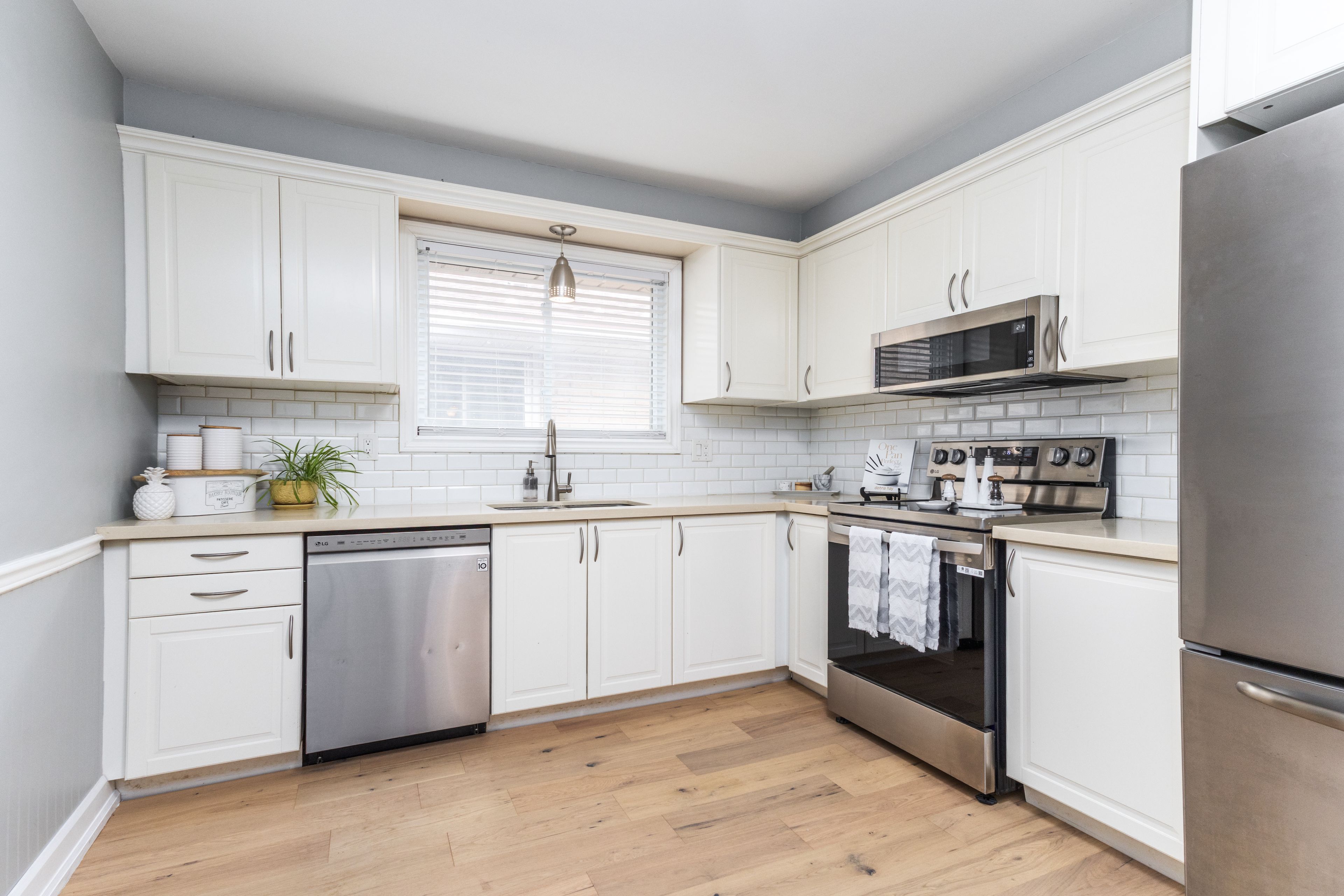 • Updated kitchen featuring white cabinetry and stainless steel appliances.