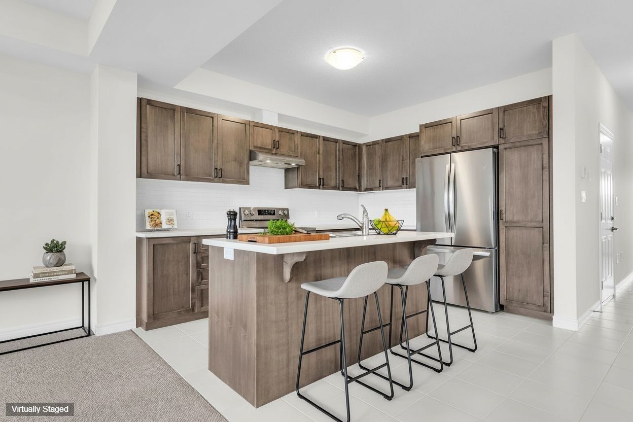 Welcome to this modern freehold end-unit townhouse backing onto greenspace by john bruce robinson! Only 2 years new and still under tarion warranty, this 1755 sq ft home offers a premium corner lot with no rear neighbours, making lawn maintenance a breeze, plus peaceful greenbelt views. Notably, the generous 1755 sq ft layout is larger than some detached homes in the neighbourhood, offering exceptional space for a townhouse. The main floor features a bright, open-concept layout with pot lights and a modern kitchen at its heart, complete with a large island, custom pantry wall, added pot drawers, and zebra blinds throughout-perfect for everyday living and entertaining. Large windows and sliding glass doors lead to a private deck and fully sodded yard, providing a serene outdoor retreat. Upstairs, the spacious primary suite boasts a massive l-shaped walk-in closet and upgraded ensuite with a glass stand-up shower. Two additional well-sized bedrooms and a full 4-piece bathroom complete the level. The unfinished basement includes laundry, a roughed-in 2-piece bathroom, and an expanded oversized window that brings in natural light, offering excellent future potential. Additional features include stainless steel appliances, fully paved driveway, and meticulous care throughout. With over $20k in interior upgrades plus builder premiums for the end-unit ($25,000) and lot ($12,500), this home truly stands out for its space, upgrades, and serene setting in a quiet, family-friendly neighbourhood close to parks, schools, and amenities.