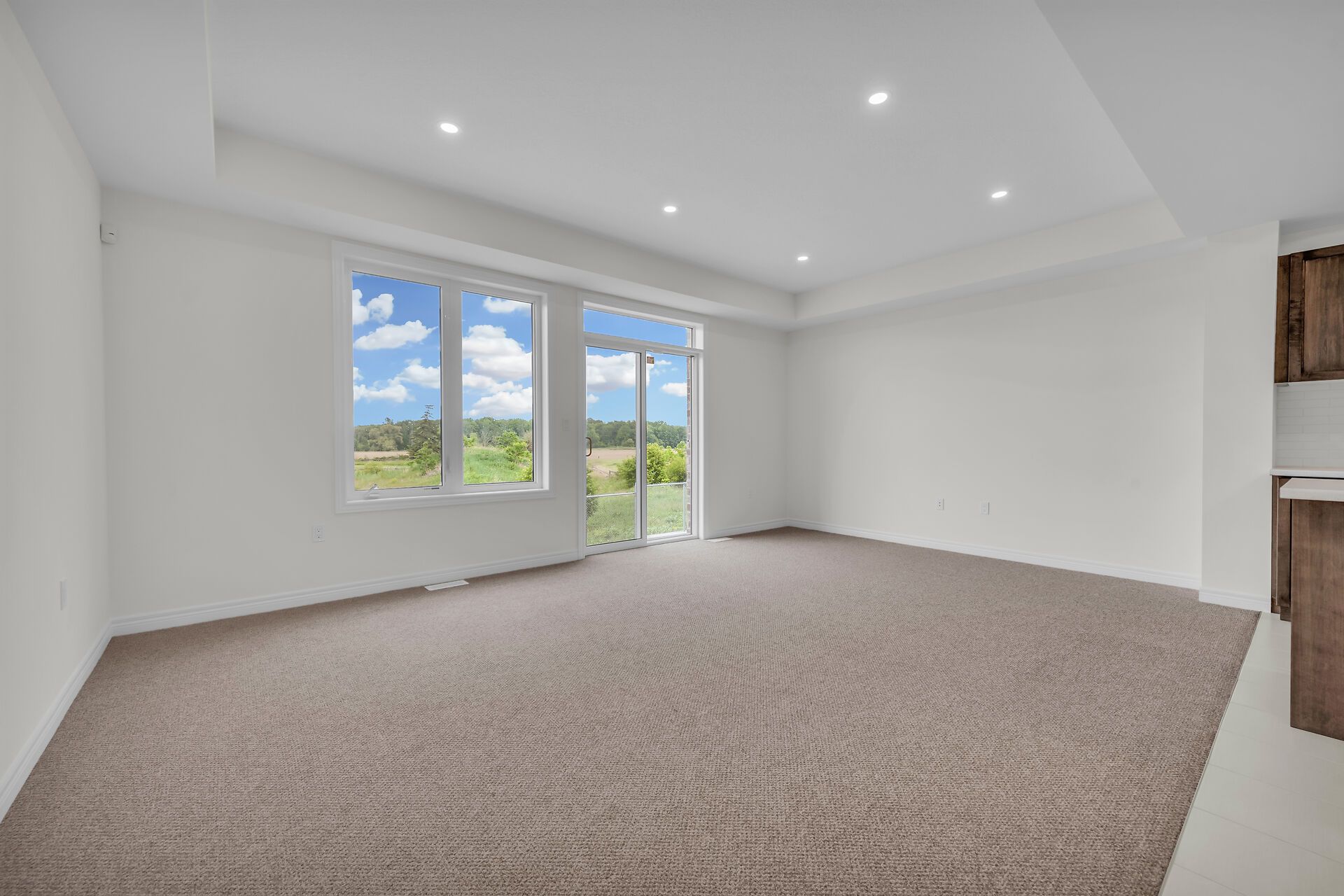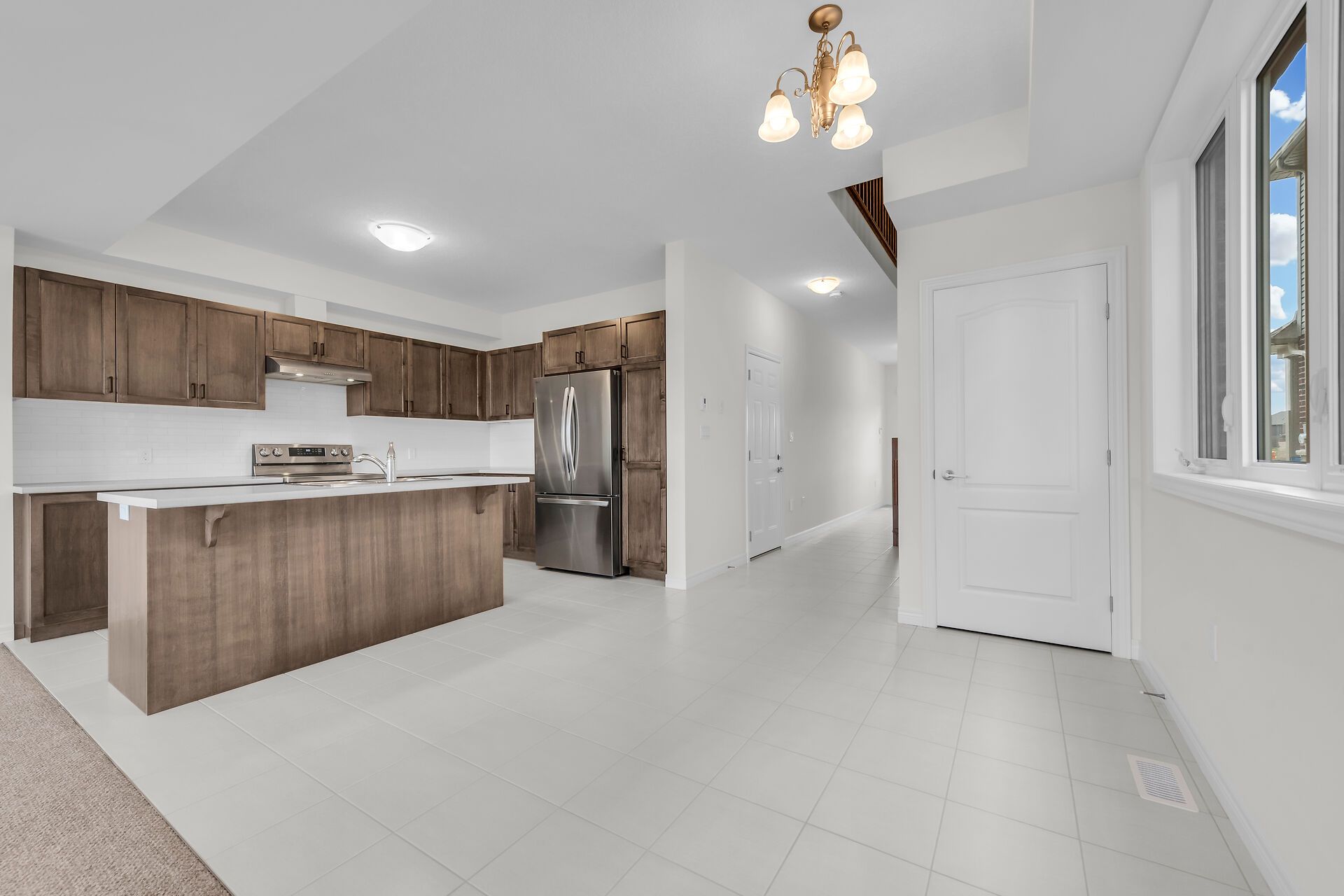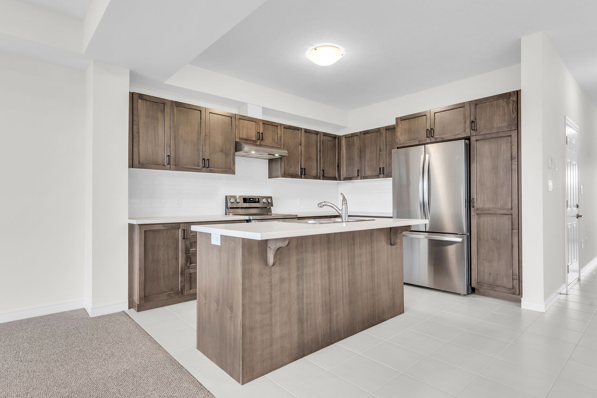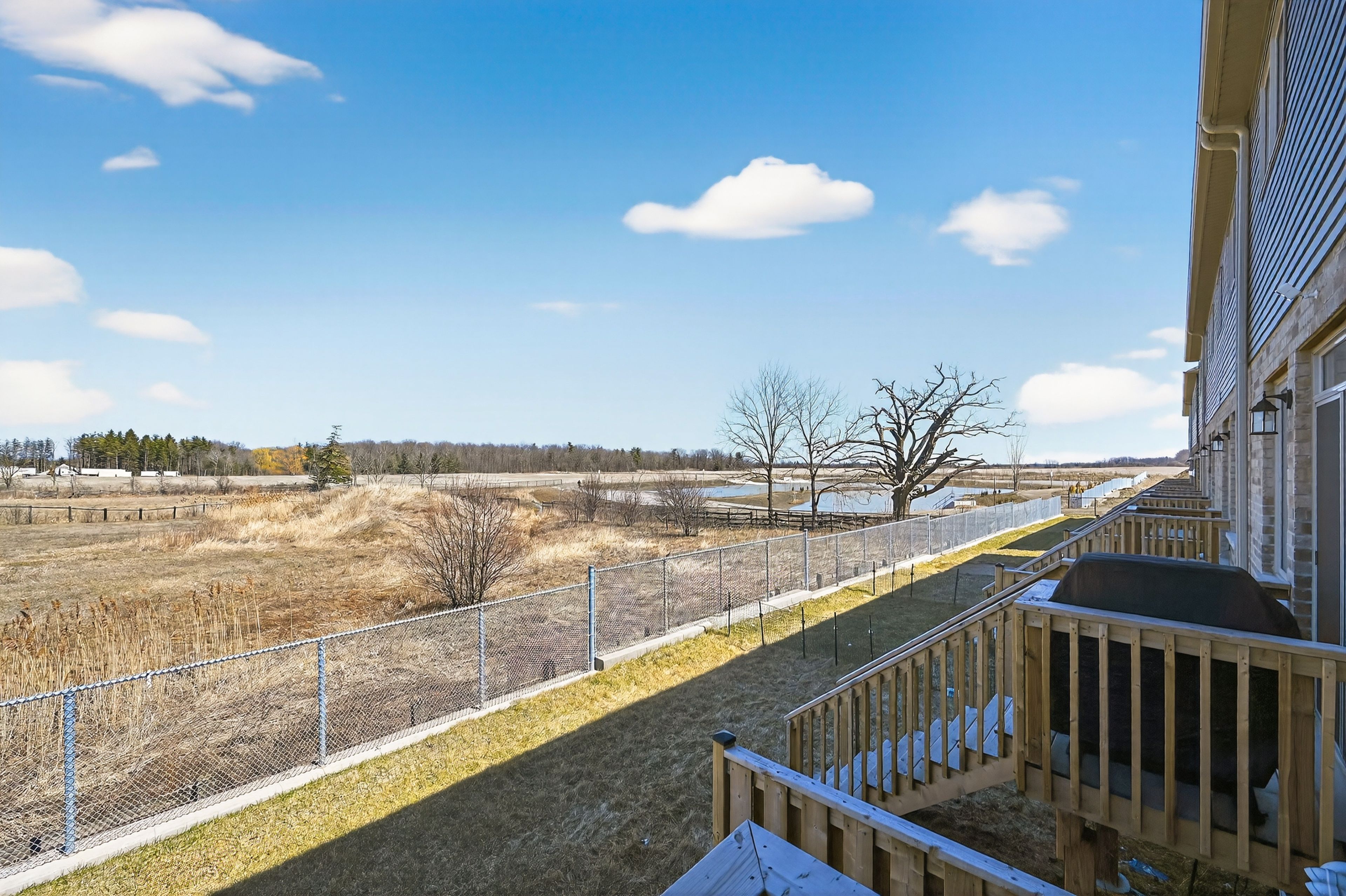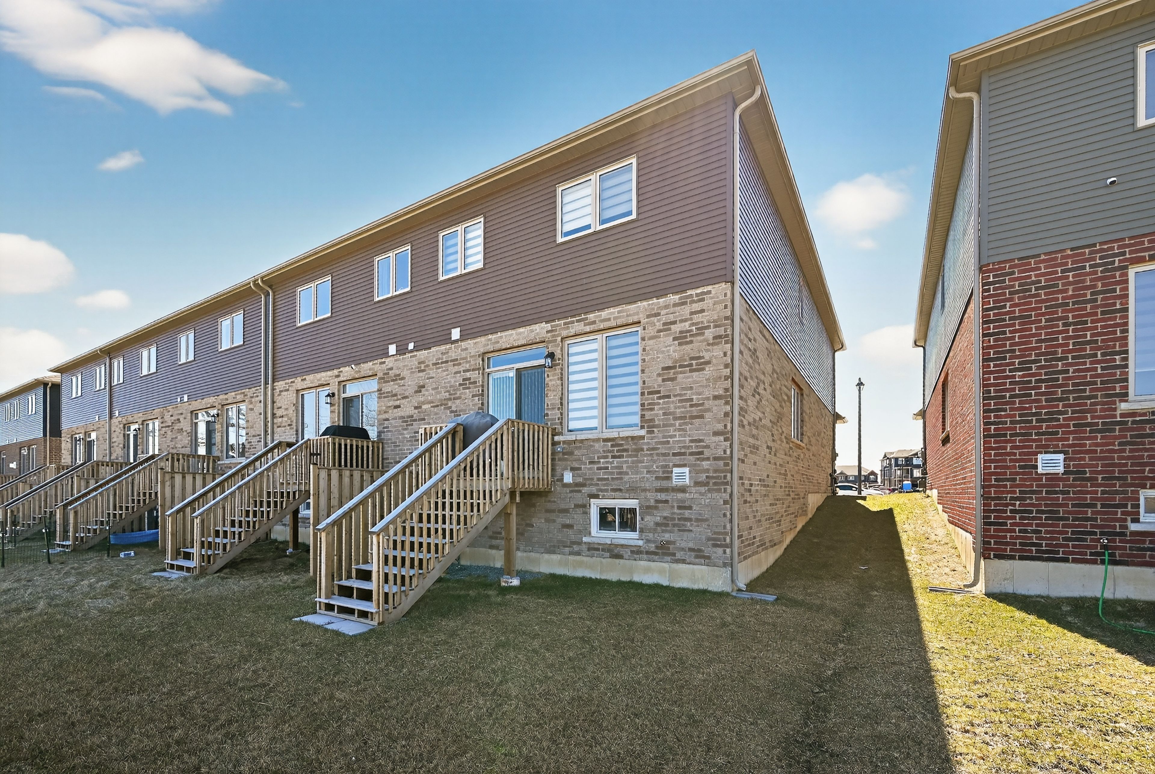 Welcome to this modern freehold end-unit townhouse backing onto greenspace by john bruce robinson! Only 2 years new and still under tarion warranty, this 1755 sq ft home offers a premium lot with no rear neighbours, making lawn maintenance a breeze, plus peaceful greenbelt views. Notably, the generous 1755 sq ft layout is larger than some detached homes in the neighbourhood, offering exceptional space for a townhouse. The main floor features a bright, open-concept layout with pot lights and a modern kitchen at its heart, complete with a large island, custom pantry wall, added pot drawers, and zebra blinds throughout-perfect for everyday living and entertaining. Large windows and sliding glass doors lead to a private deck and fully sodded yard, providing a serene outdoor retreat. Upstairs, the spacious primary suite boasts a massive l-shaped walk-in closet and upgraded ensuite with a glass stand-up shower. Two additional well-sized bedrooms and a full 4-piece bathroom complete the level. The unfinished basement includes laundry, a roughed-in 2-piece bathroom, and an expanded oversized window that brings in natural light, offering excellent future potential. Additional features include stainless steel appliances, fully paved driveway, and meticulous care throughout. With over $20k in interior upgrades plus builder premiums for the end-unit ($25,000) and lot ($12,500), this home truly stands out for its space, upgrades, and serene setting in a quiet, family-friendly neighbourhood close to parks, schools, and amenities.