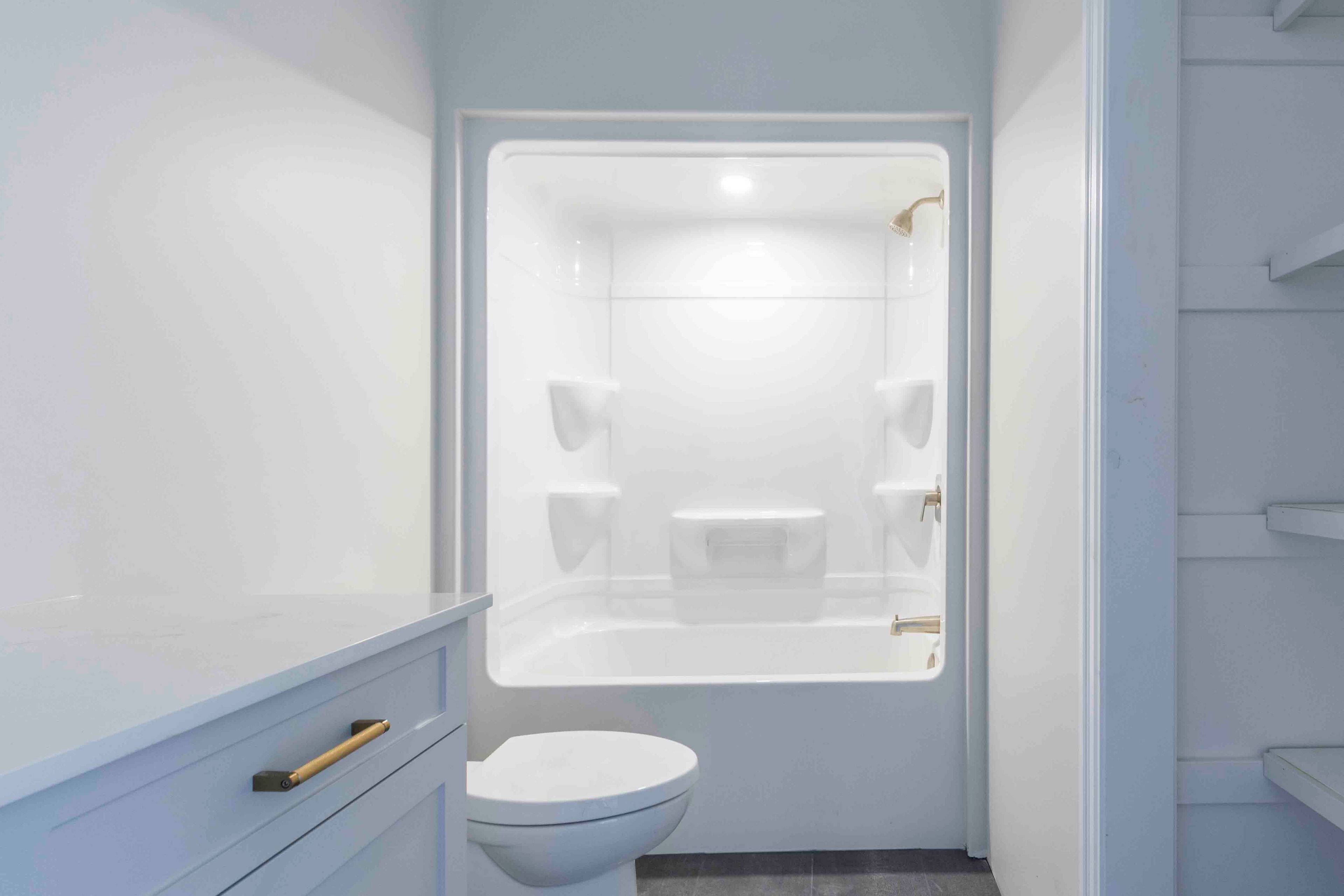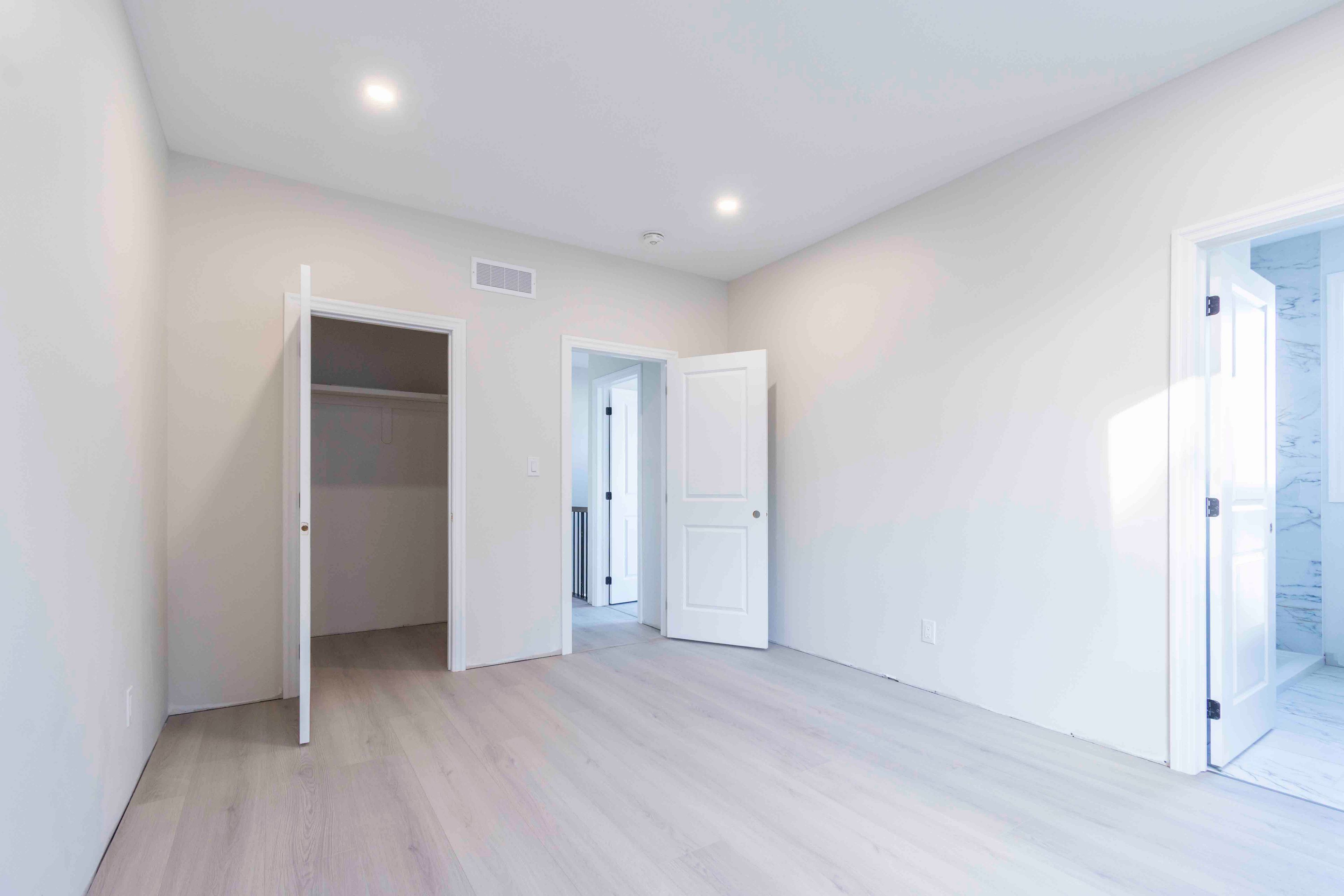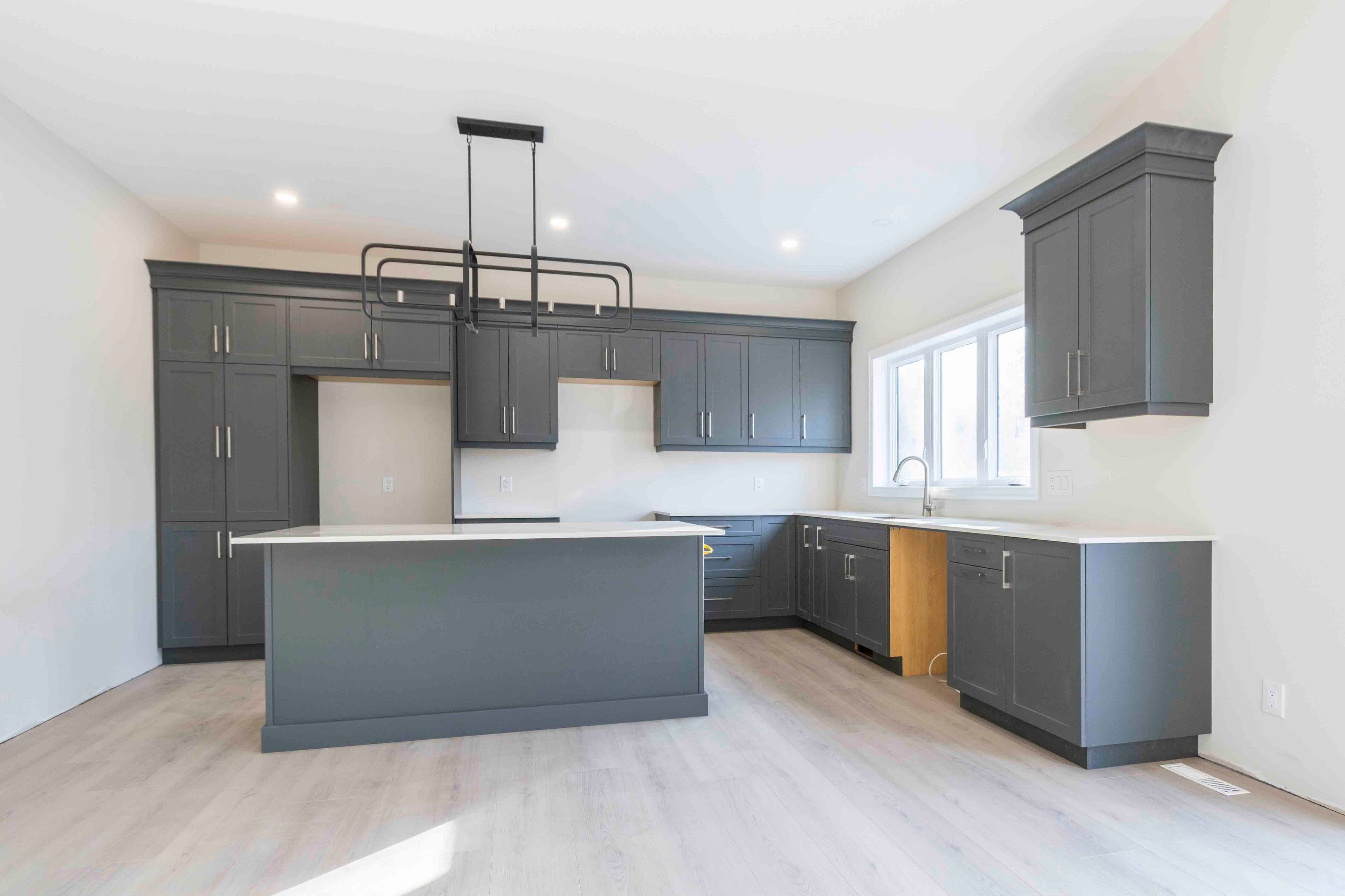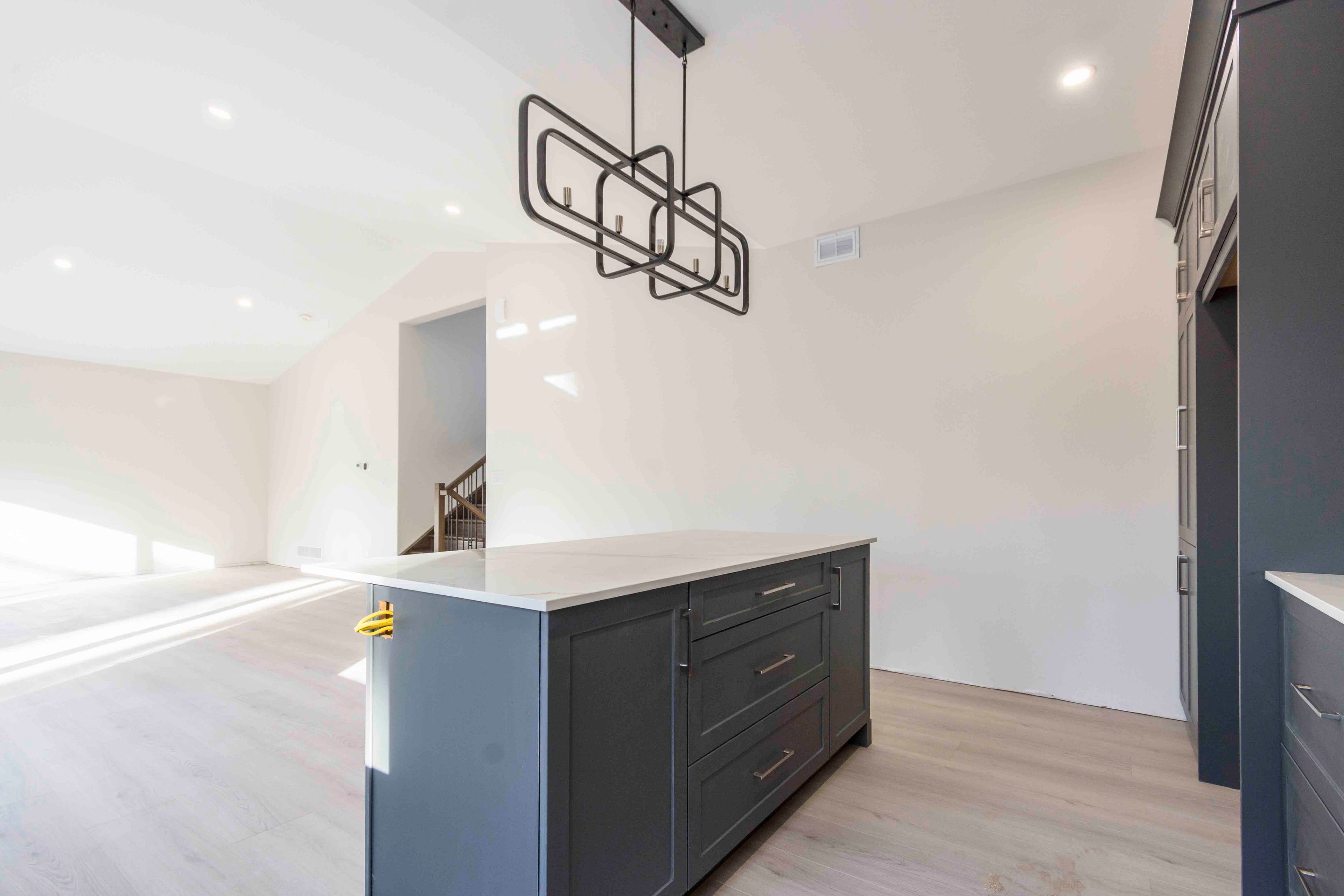 • Vaulted ceiling and modern kitchen with an island and pantry.
