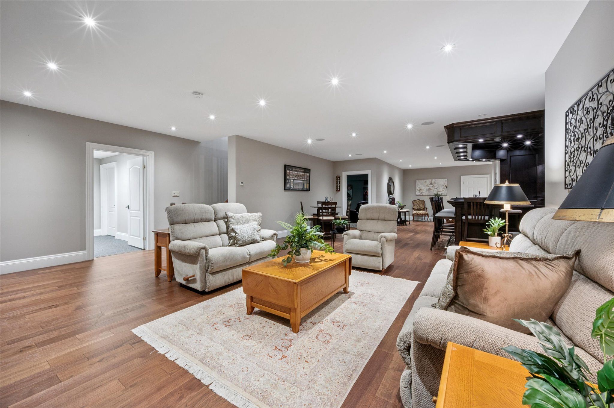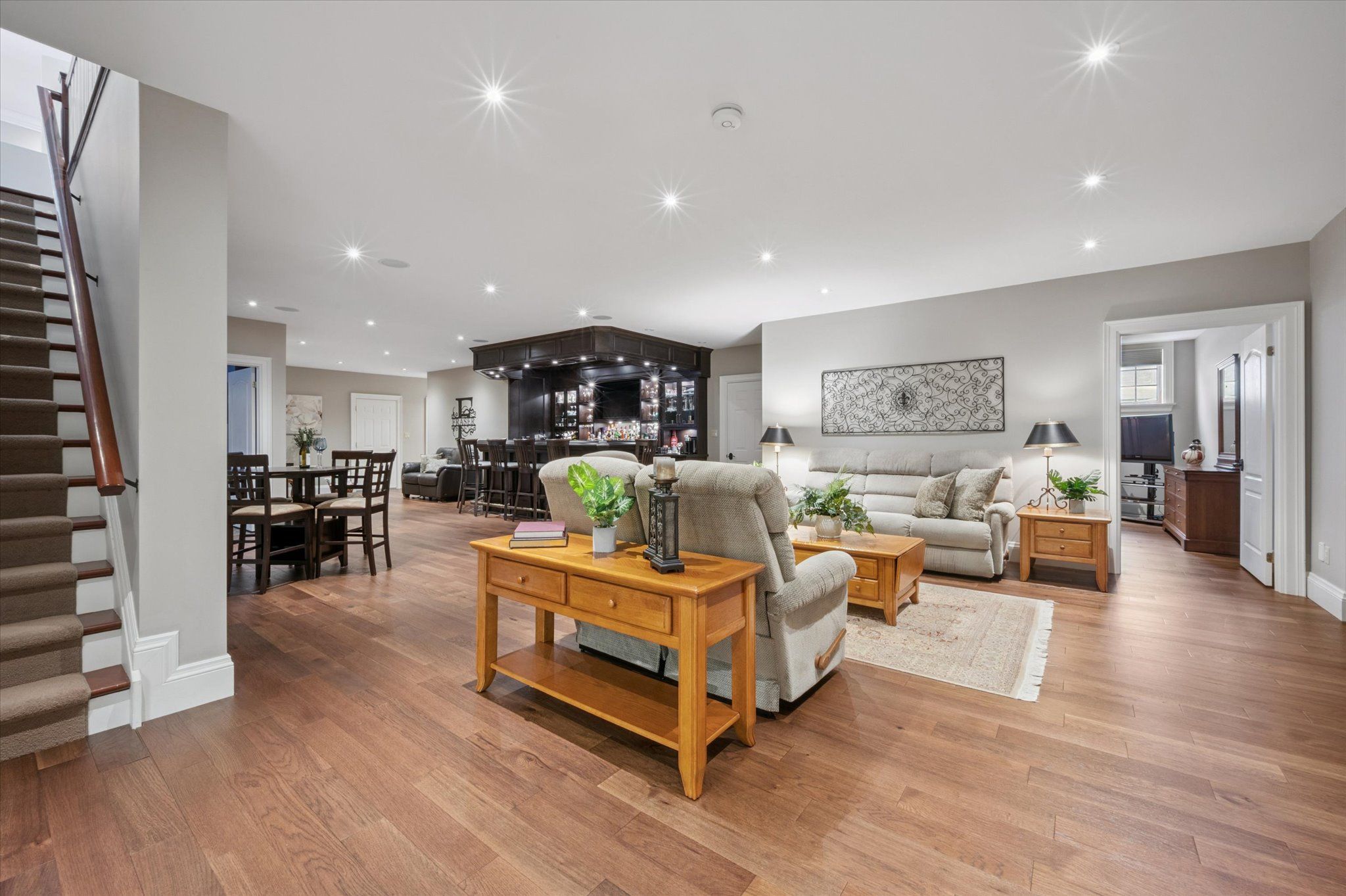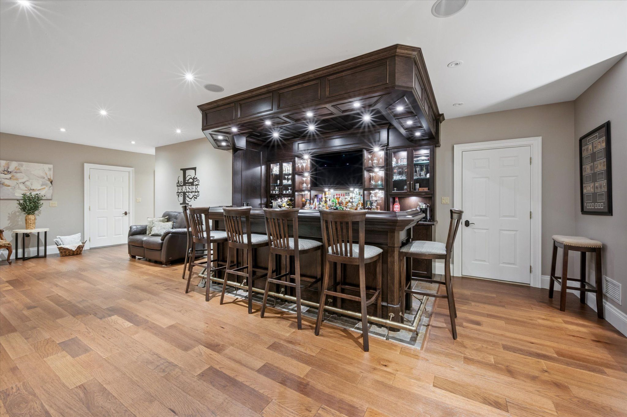 • Spacious lower level features bedroom, office, bar area, and home theatre.