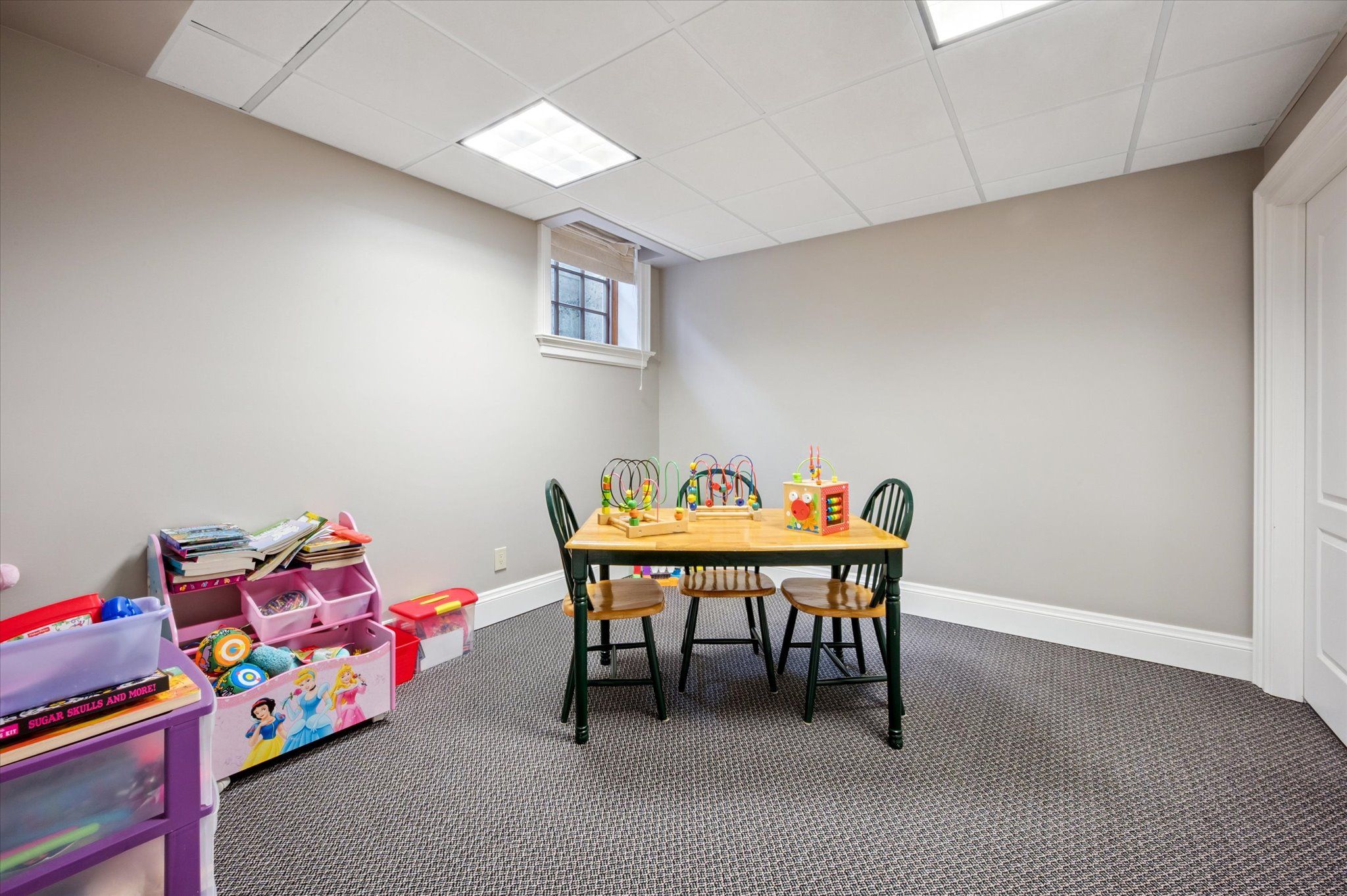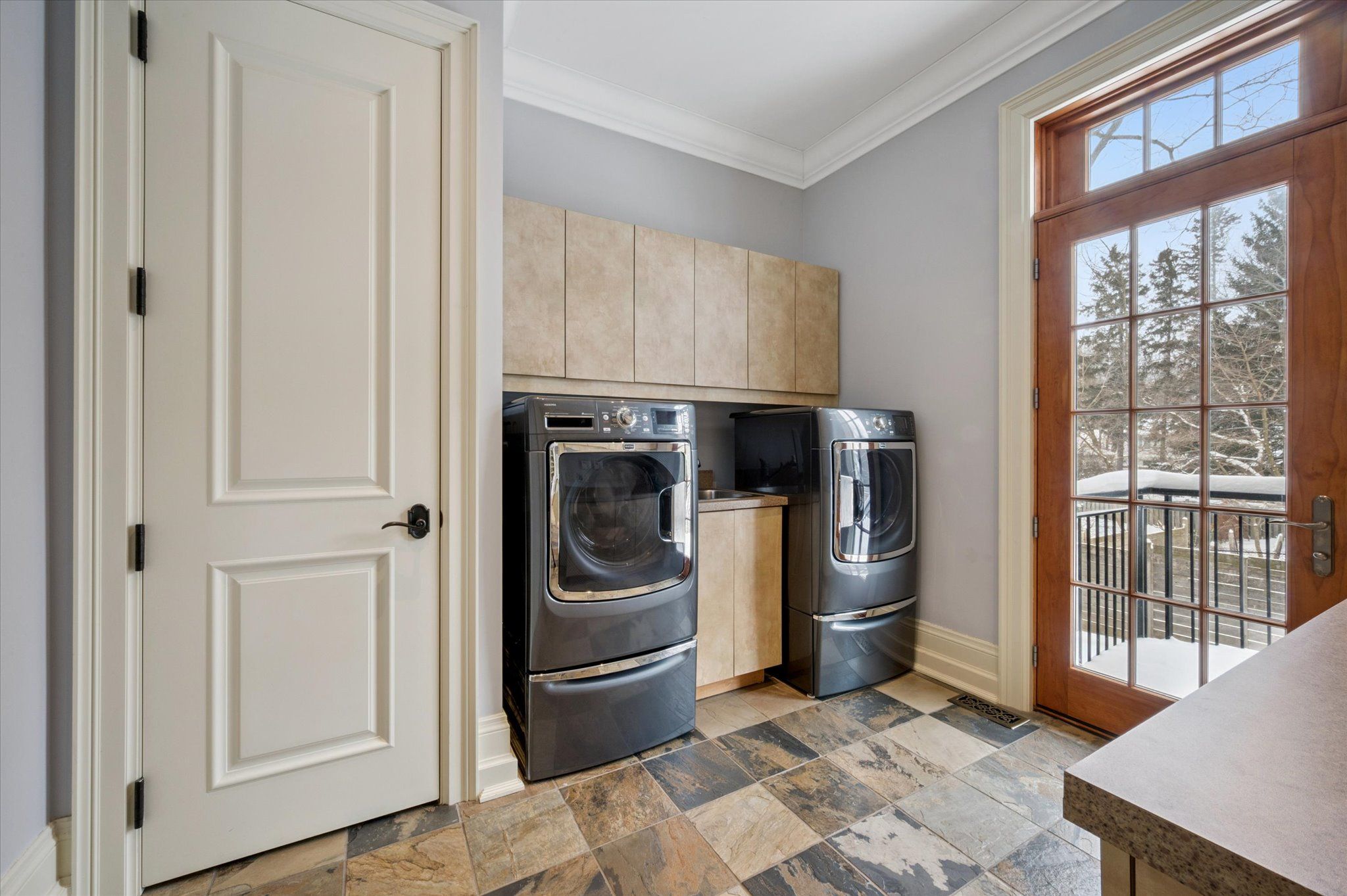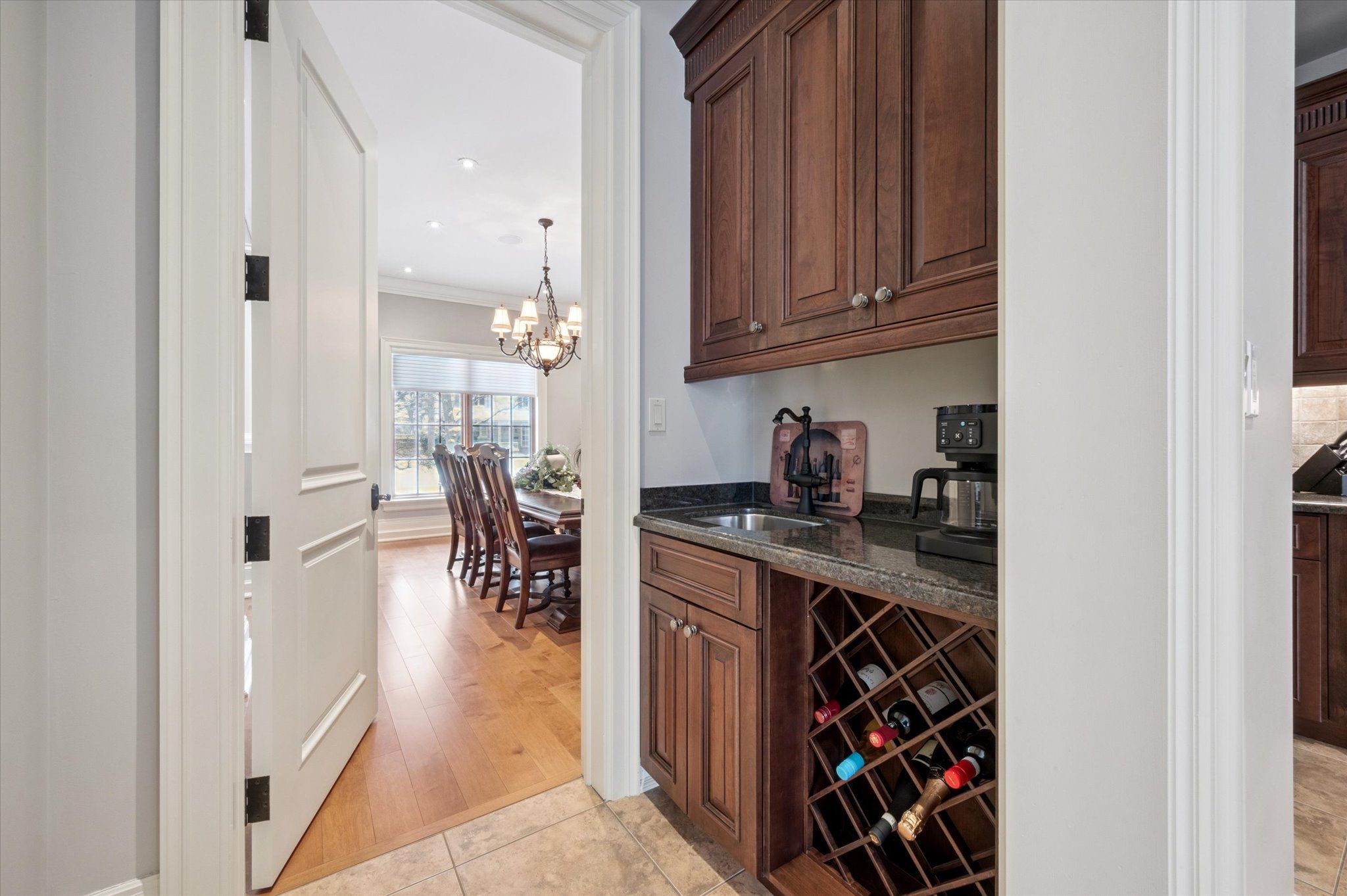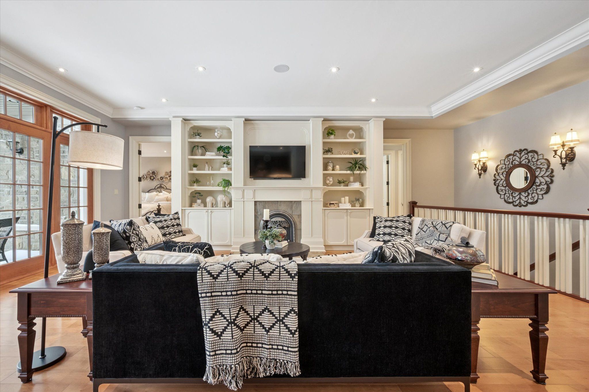 • Spacious lower level features bedroom, office, bar area, and home theatre.