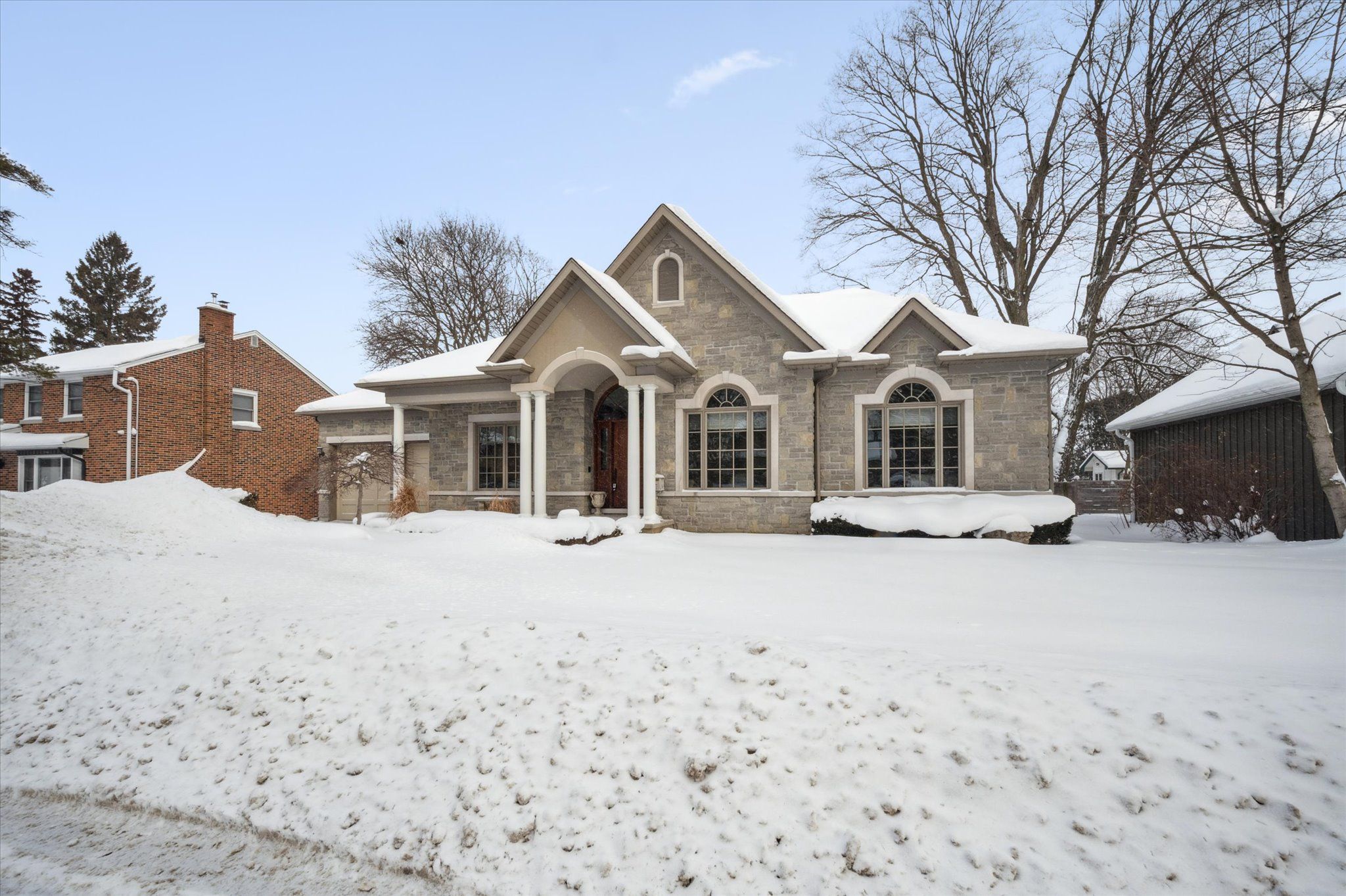 Rarely does a home offer both striking curb appeal and an exceptional location, and this one delivers on every front. Situated in one of guelph's most desirable family neighbourhoods, steps to st. George's park, this custom-built residence stands apart for its craftsmanship, thoughtful design, and timeless finishes. From the moment you arrive, the quality is unmistakable. The exterior is finished in arriscraft citadel stone, with limestone sills, arches, lintels, and door surrounds. Inside, 10' ceilings throughout the main floor, oversized crown moulding and baseboards, solid 8' interior doors, and a dramatic barrel-vaulted front entry set the tone. The open-concept kitchen is the heart of the home, featuring a large centre island, integrated office nook, and custom barzotti cabinetry carried through to the bathrooms. The adjoining family room features built-in custom cabinetry, a gas fireplace, and floor-to-ceiling windows overlooking the rear patio, creating a seamless indoor-outdoor connection. The primary bedroom offers a luxurious retreat with a walk-in closet and a stunning 5-piece ensuite featuring a glass shower and a soaker tub. Two additional bedrooms, a 4-piece bathroom, main-floor laundry, and a convenient powder room complete this level. In-floor heating provides exceptional comfort throughout both the main floor and basement, as well as the concrete flooring in the garage. The lower level, alternatively accessed by a separate staircase from the garage, is extraordinarily spacious due to 9' foundation walls, no bulkheads, and clear spans with no support columns. This level includes an additional bedroom, an office, a full bathroom, an incredible bar area, and a home theatre with surround sound, ideal for entertaining or enjoying your favourite sporting events. Don't miss this rare opportunity to own a meticulously constructed home in one of guelph's most coveted locations, where exceptional craftsmanship and refined living come together seamlessly.