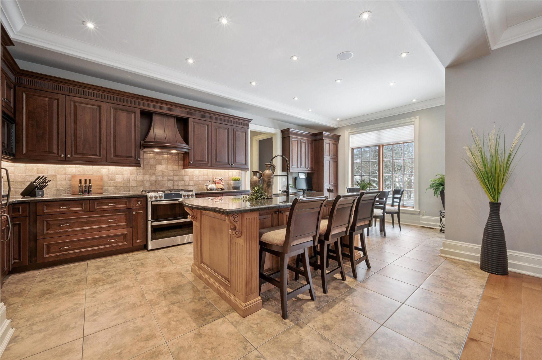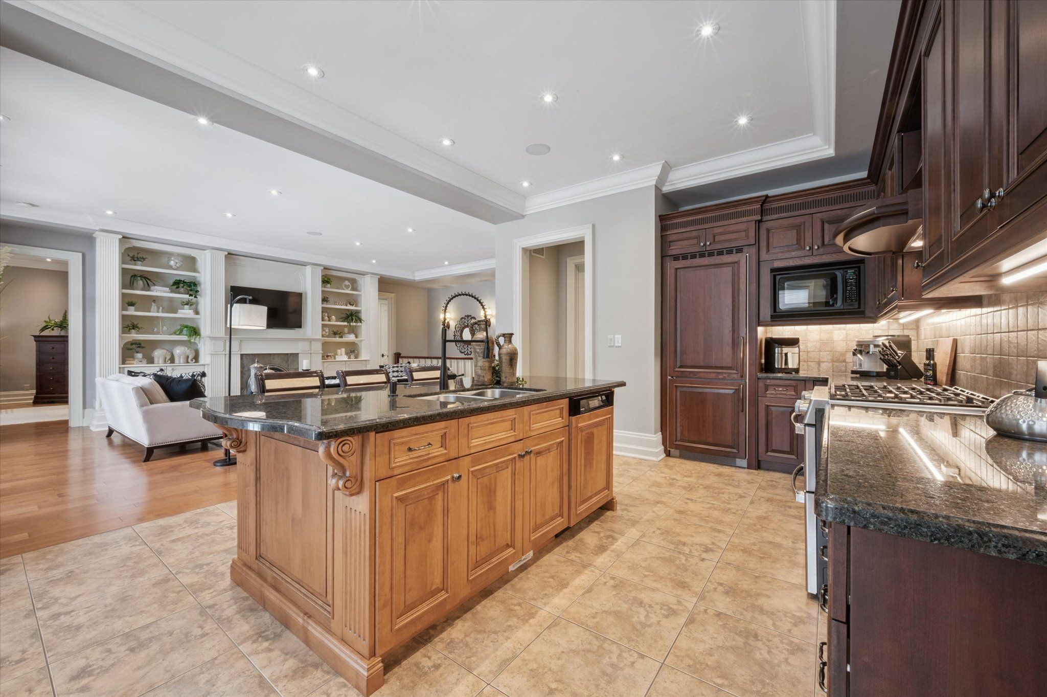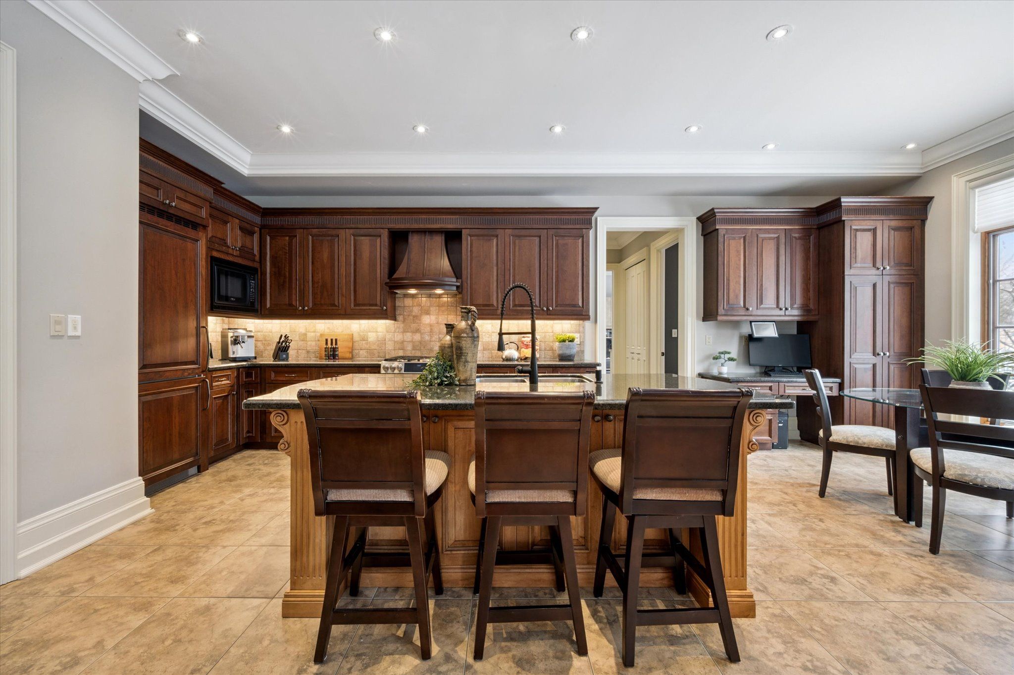 • Open-concept kitchen with large island and integrated office nook.