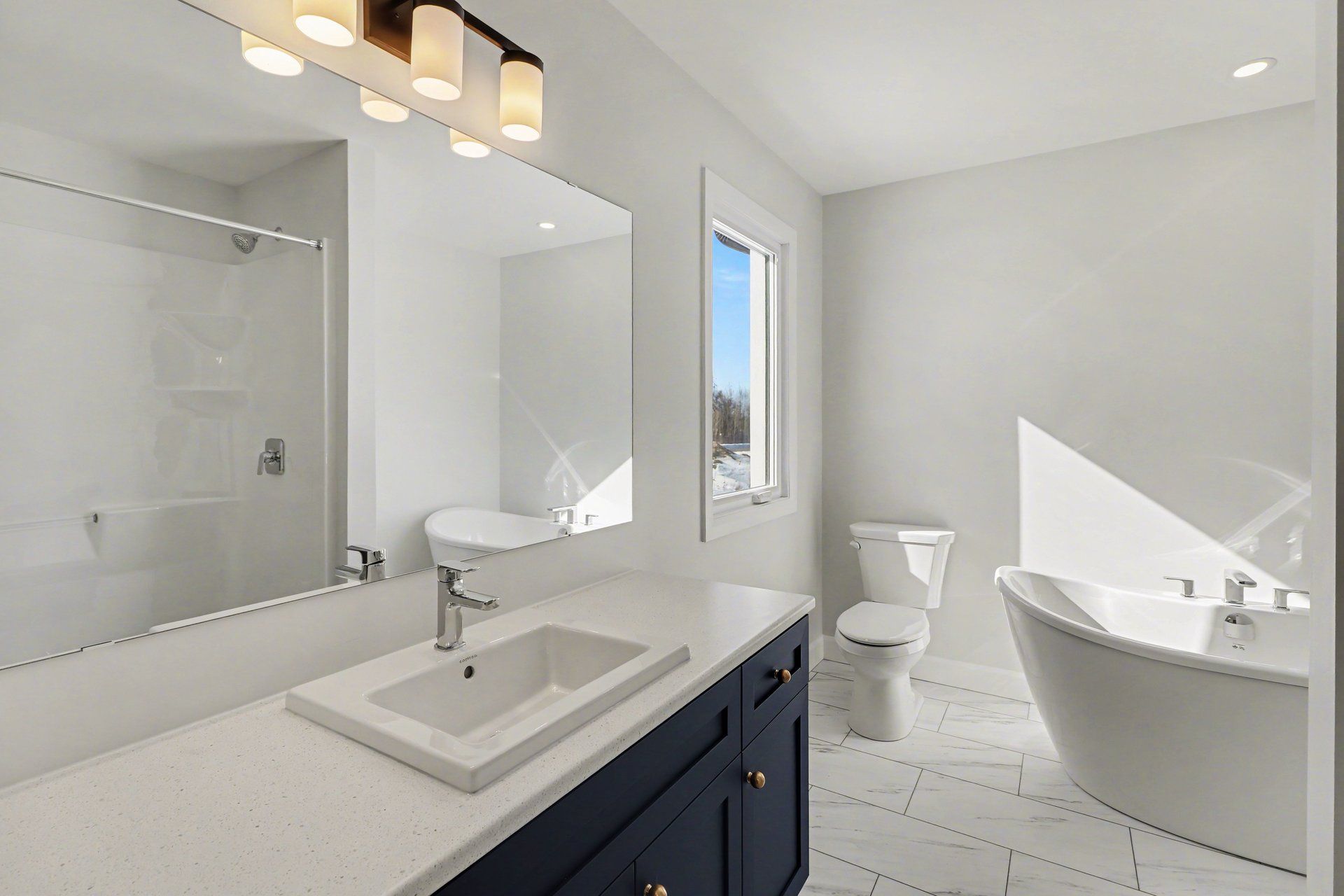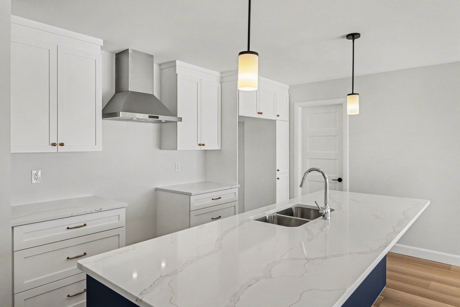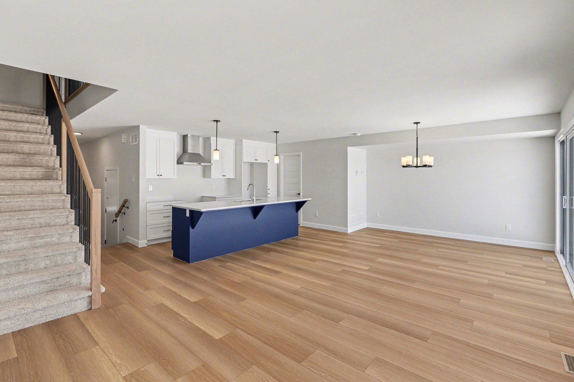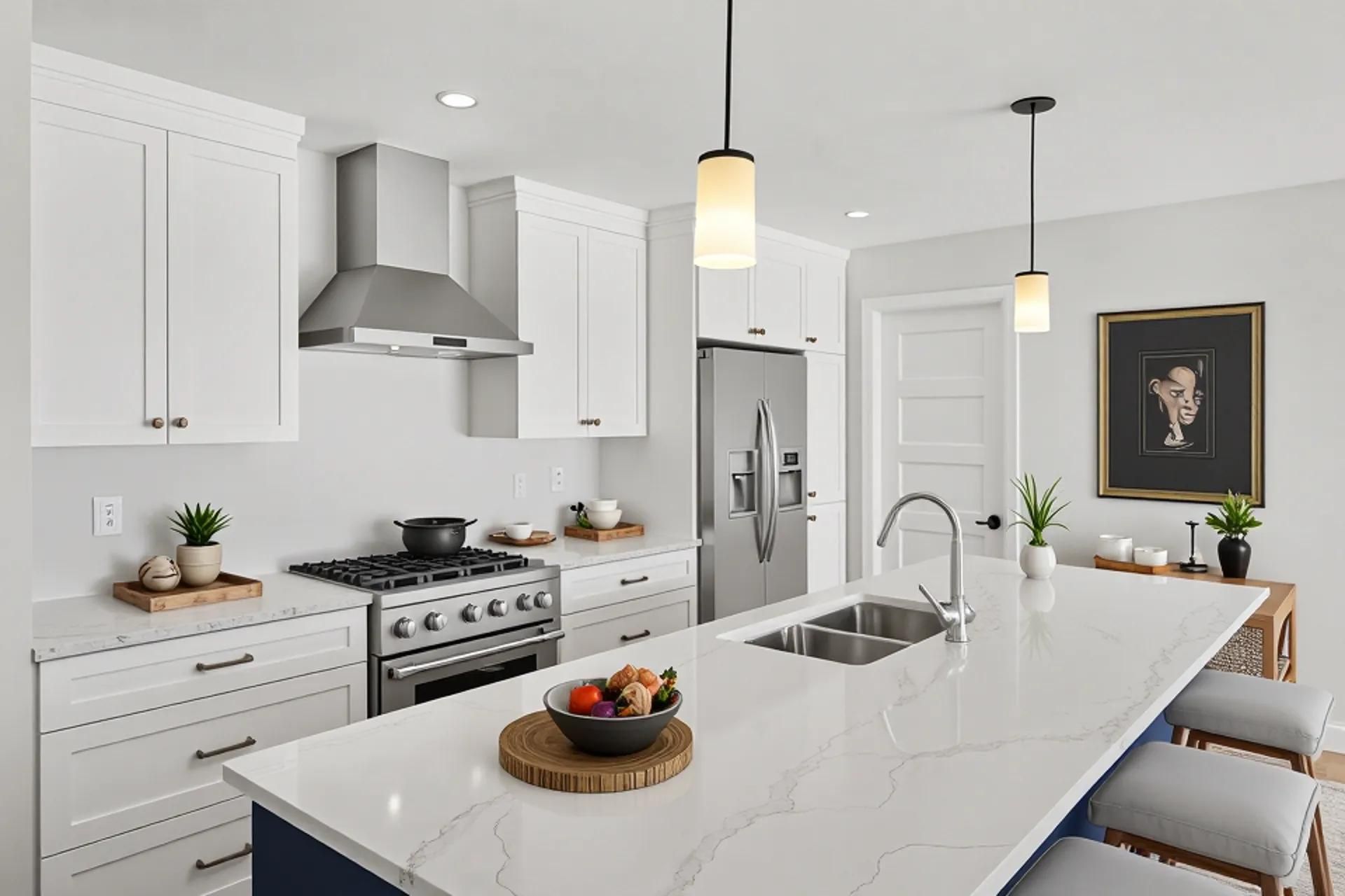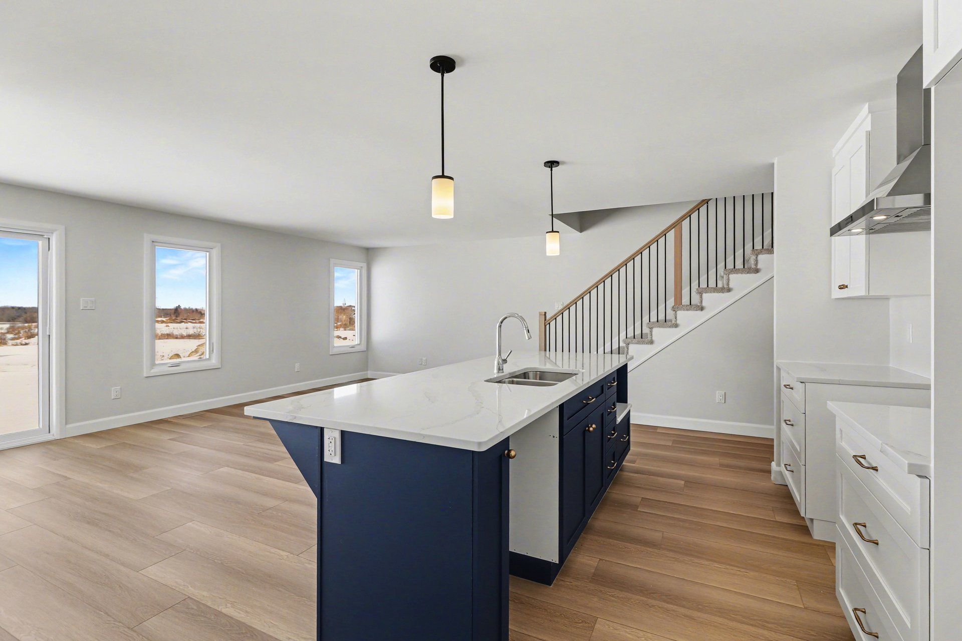 • Open concept main floor with quartz counters and large kitchen island.