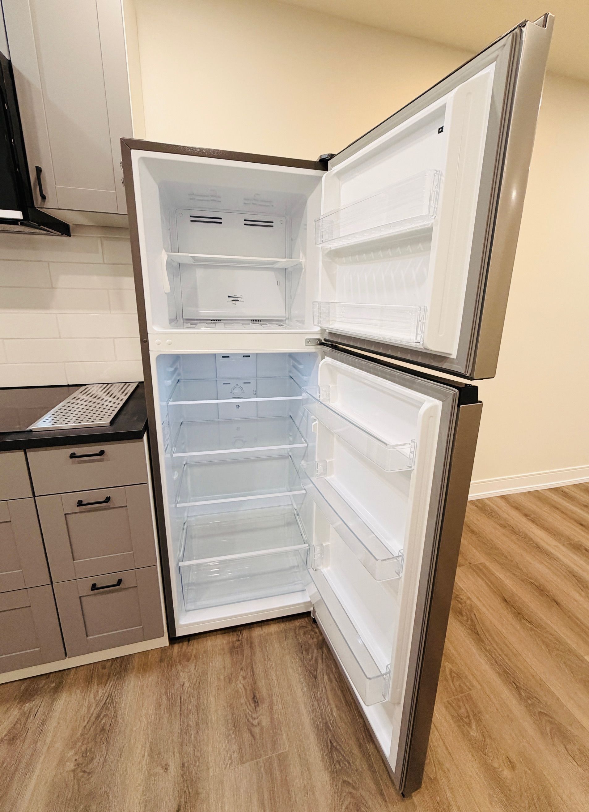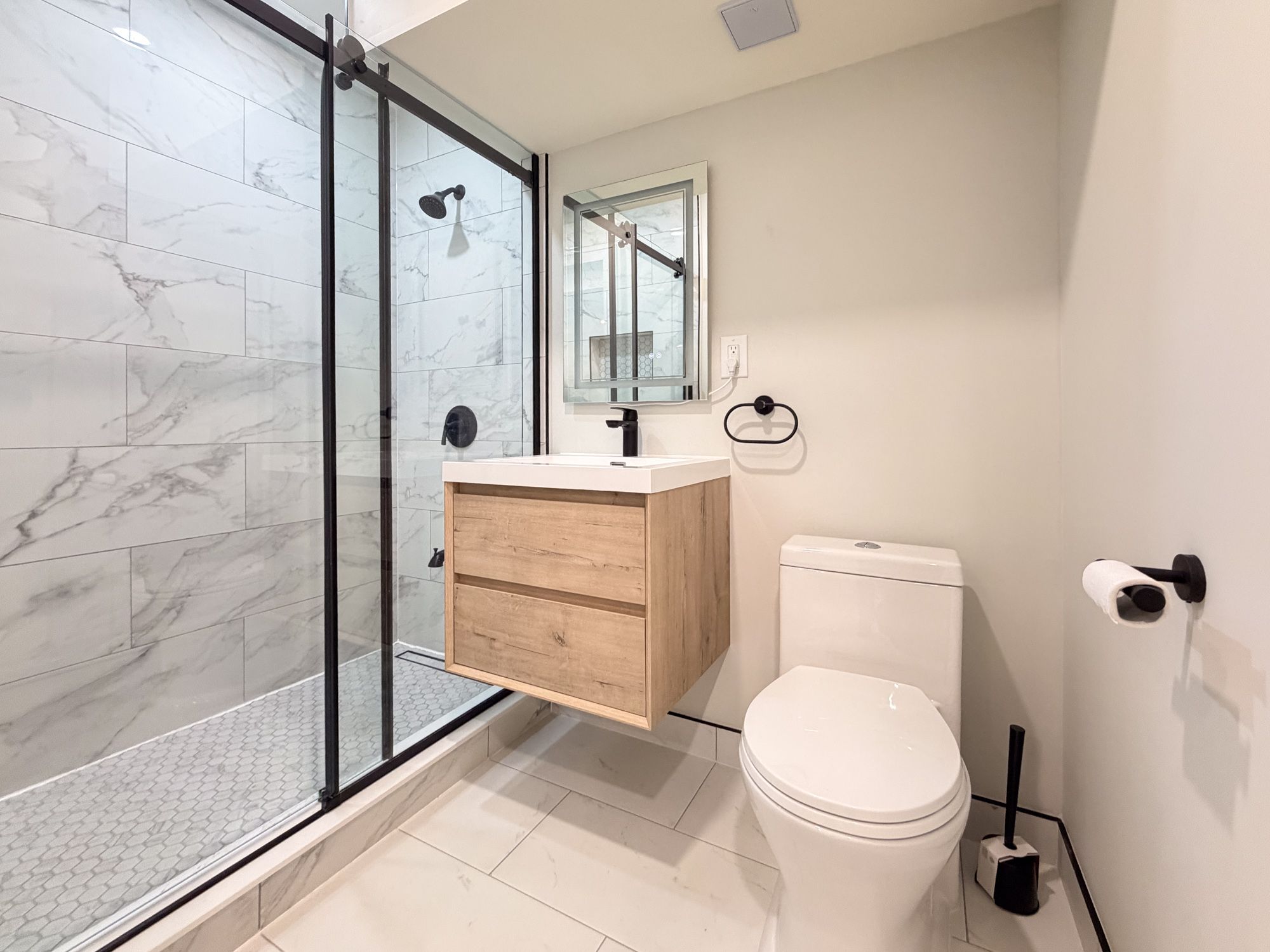 • Modern finishes include luxury vinyl flooring and an oversized tile shower.