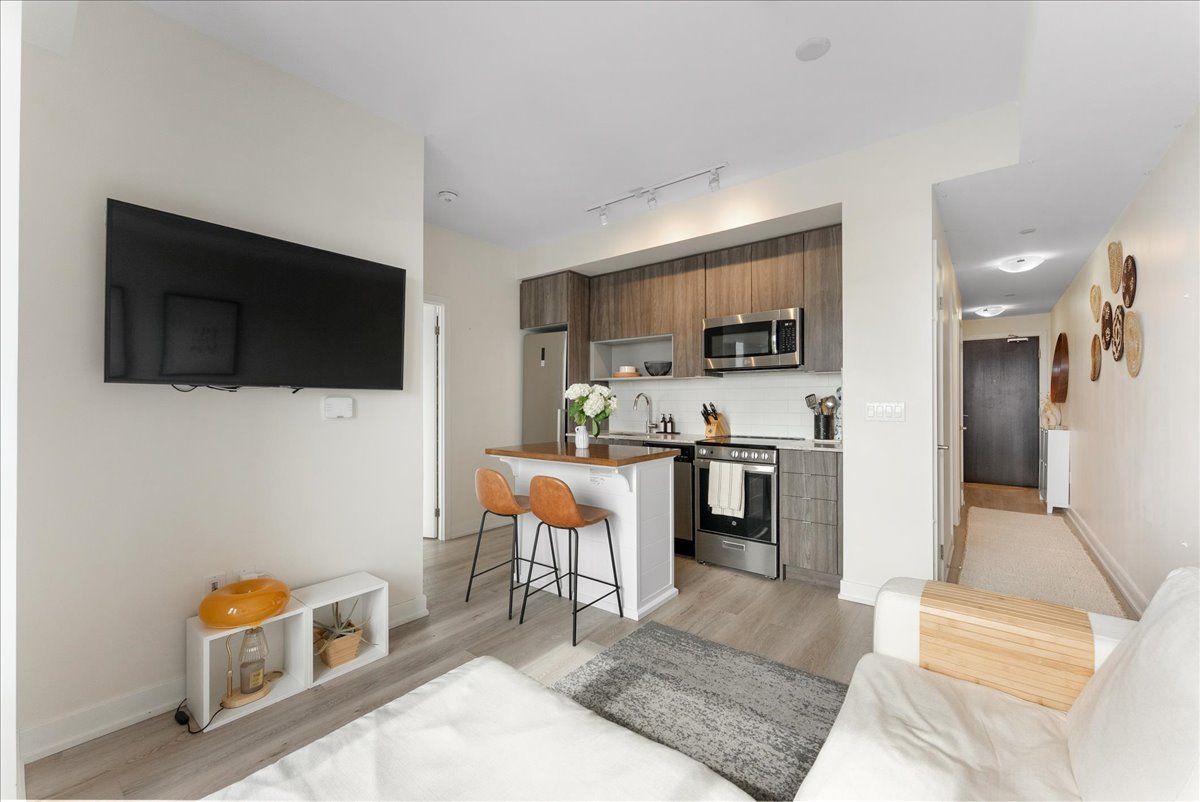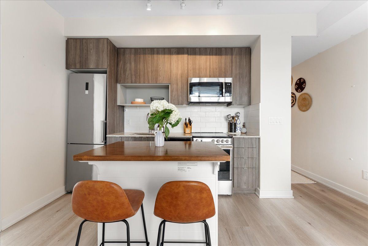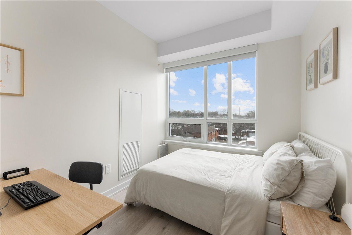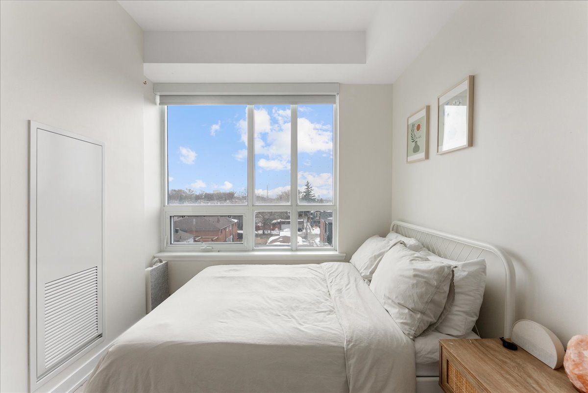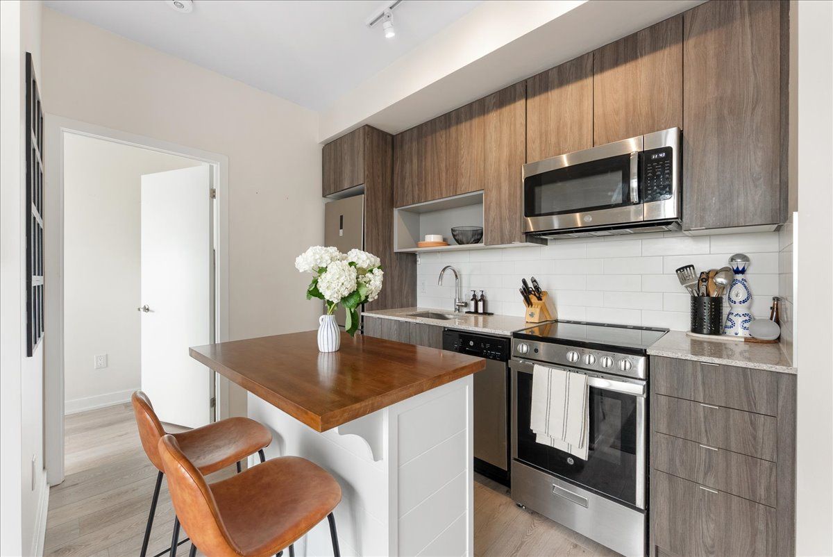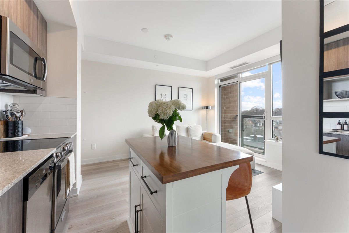 Live just steps from the danforth in this bright and thoughtfully designed south-facing one-bedroom condo. Only a four-minute walk to greenwood subway, the location places you in the heart of one of toronto's most loved east-end neighbourhoods, surrounded by an eclectic mix of locally owned cafés, bakeries, butchers, restaurants, and boutique shops. Inside, the suite offers just under 600 sq. Ft. Of well-utilized space with 9-foot ceilings and an open layout that feels airy, efficient, and filled with natural light. The kitchen features warm wood cabinetry, quartz countertops, stainless steel appliances, and a generous island that anchors the space and doubles as both prep and gathering area. The overall palette is light, calm, and welcoming, creating a home that feels both comfortable and easy to live in. The bedroom enjoys large windows and a peaceful outlook, while the clean, contemporary bathroom features stone counters and ample storage. A long entry hallway offers additional wall space for storage or artwork. Residents enjoy access to top-floor amenities including a well-equipped gym, yoga studio, games room, and a large rooftop terrace with bbqs and seating areas - the perfect spot to relax, catch some sun, or spend time with friends in the warmer months. Step outside and the best of the danforth is at your doorstep. Greenwood station is just around the corner for an easy commute, while parks, neighbourhood grocers, and everyday conveniences are all within walking distance. A bright, easygoing space in a neighbourhood that's hard not to love.