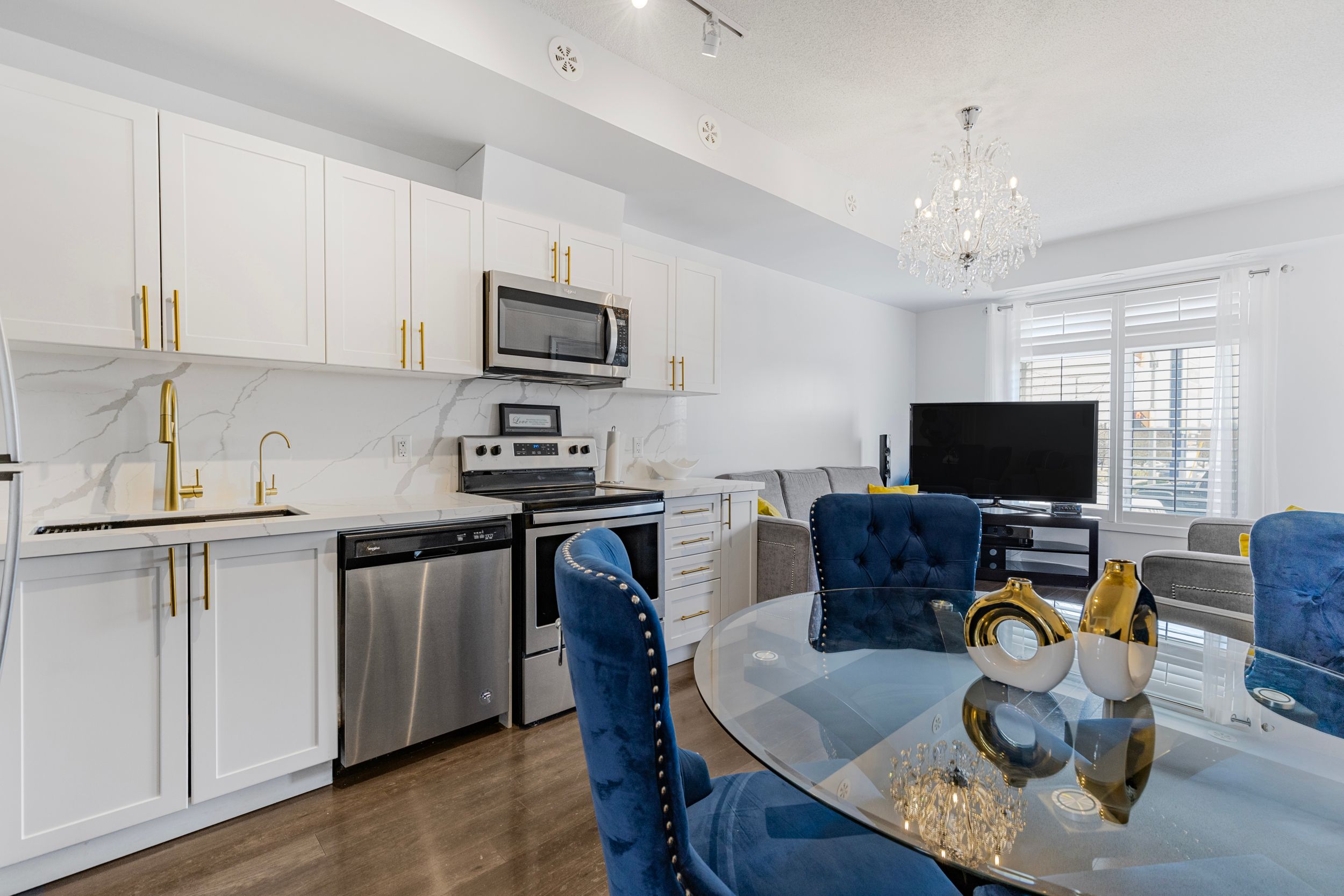 Ready for your first home without the stress of renovations? This one is move-in ready. From the moment you walk through the door, 630 rogers road, unit 21 feels like a place you can finally call your own. Bright, welcoming, and easy to live in, this beautifully maintained 2-bedroom, 1-bath main-floor townhouse is perfect for first-time buyers looking for a smart and manageable step into homeownership. Built in 2019 and thoughtfully cared for by its original owner, the open-concept layout is filled with natural light, creating a warm and comfortable space that just works for everyday living. Recently updated with brand new flooring throughout, this carpet-free home feels fresh, clean, and completely move-in ready - no projects, no extra costs, and no surprises. The kitchen is modern and functional, featuring quartz countertops, gold accents, stainless steel appliances, and a new stove added in 2025. Full-size in-unit laundry adds everyday convenience, while the second bedroom gives you flexibility for a home office, guest room, or future plans. With one owned parking space, visitor parking, and a location just steps from transit, shops, parks, and major highways, getting around is simple and efficient. It's a home designed for real life - easy to maintain, easy to budget, and easy to enjoy. If you've been waiting for something that feels realistic, well-kept, and ready for you to move in without the stress, this is a home that makes that first step feel simple - and a decision that just makes sense.