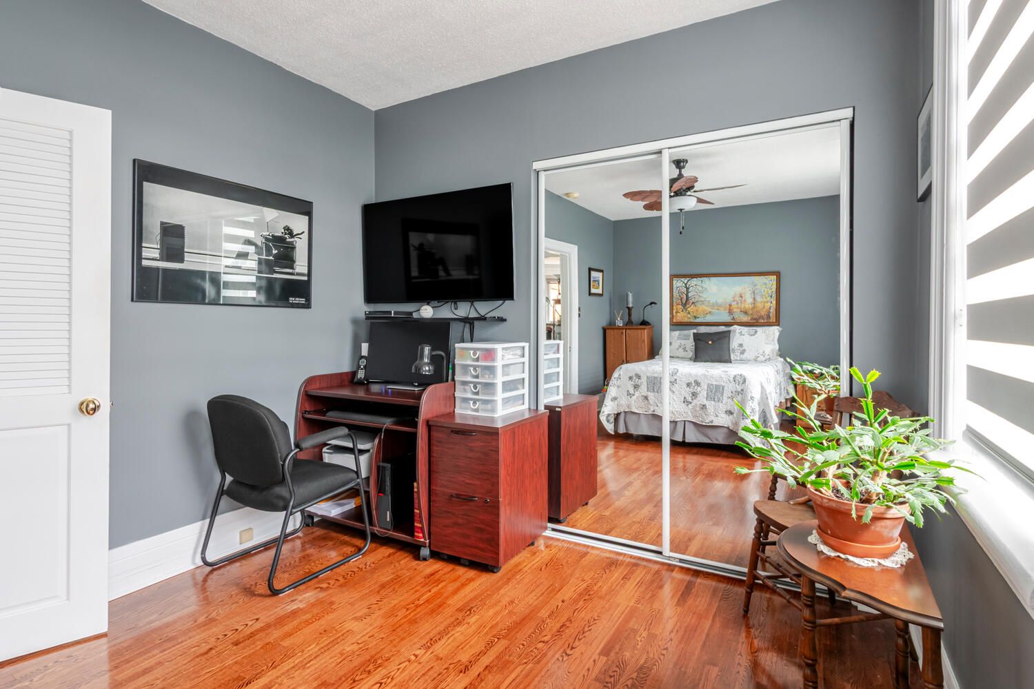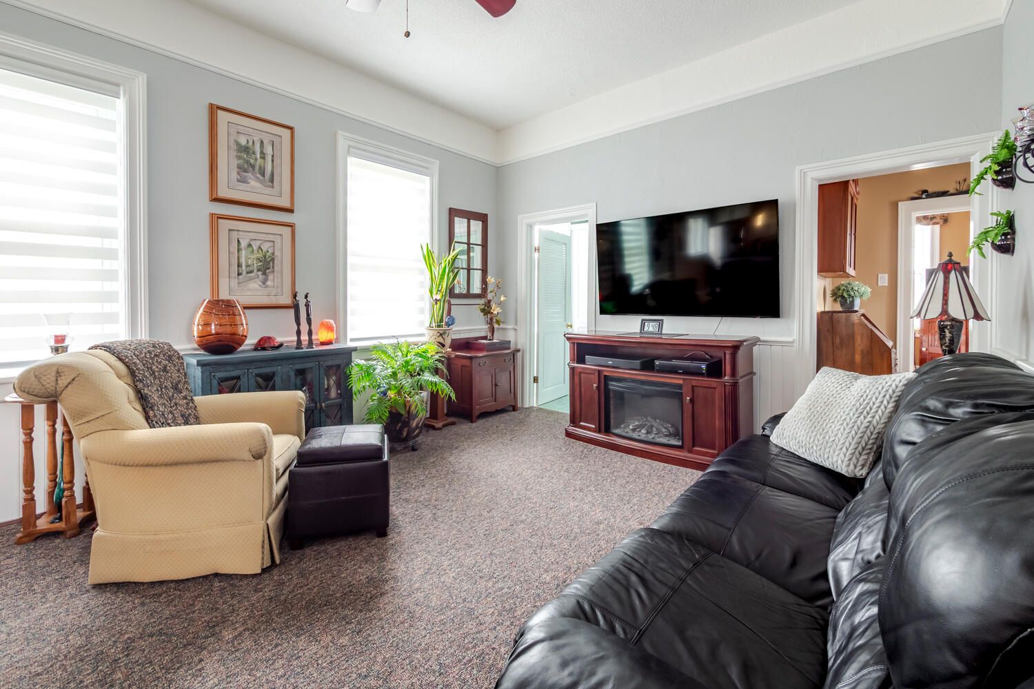 • Spacious living room with 10-foot ceilings and hardwood floors.