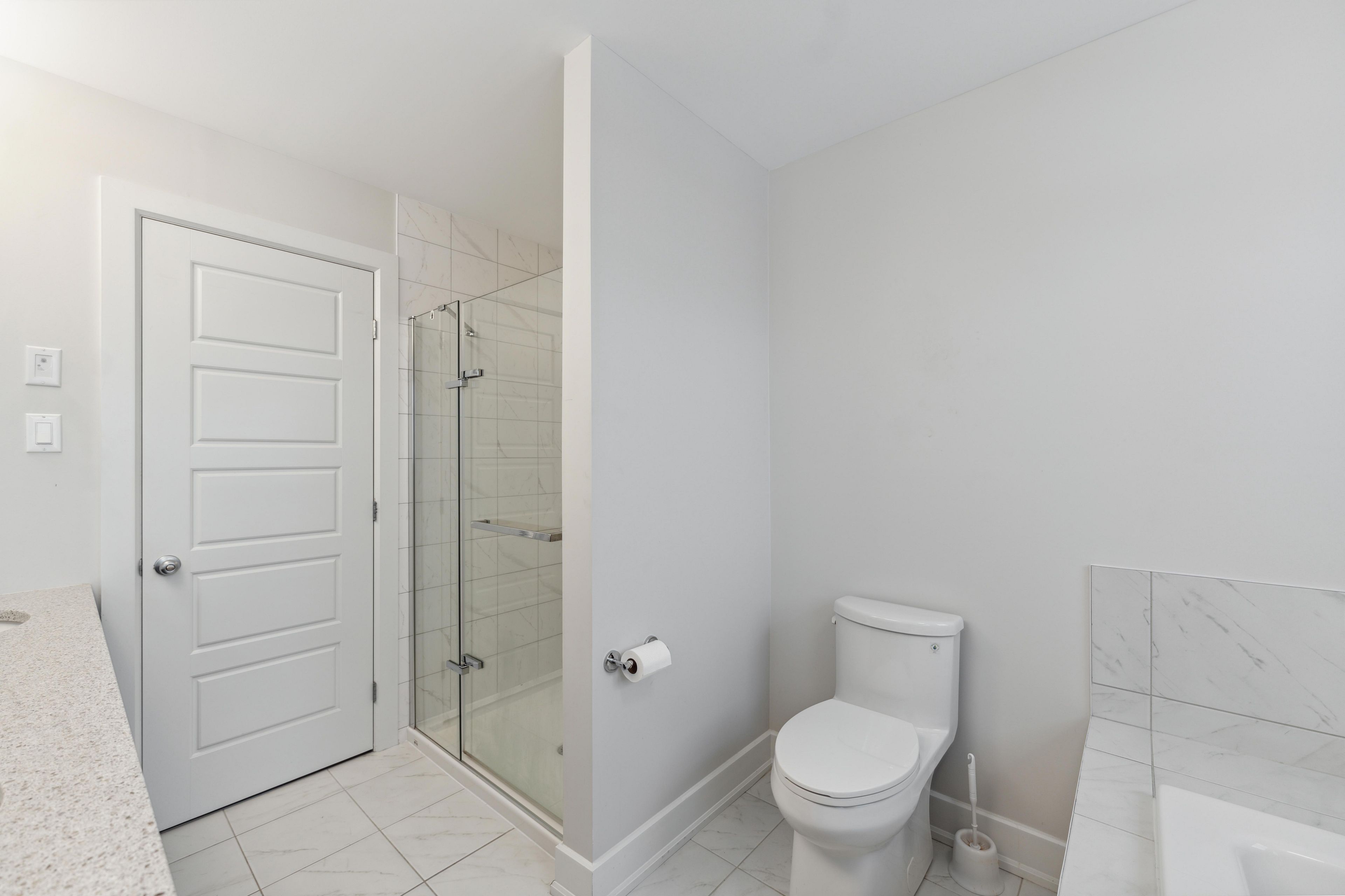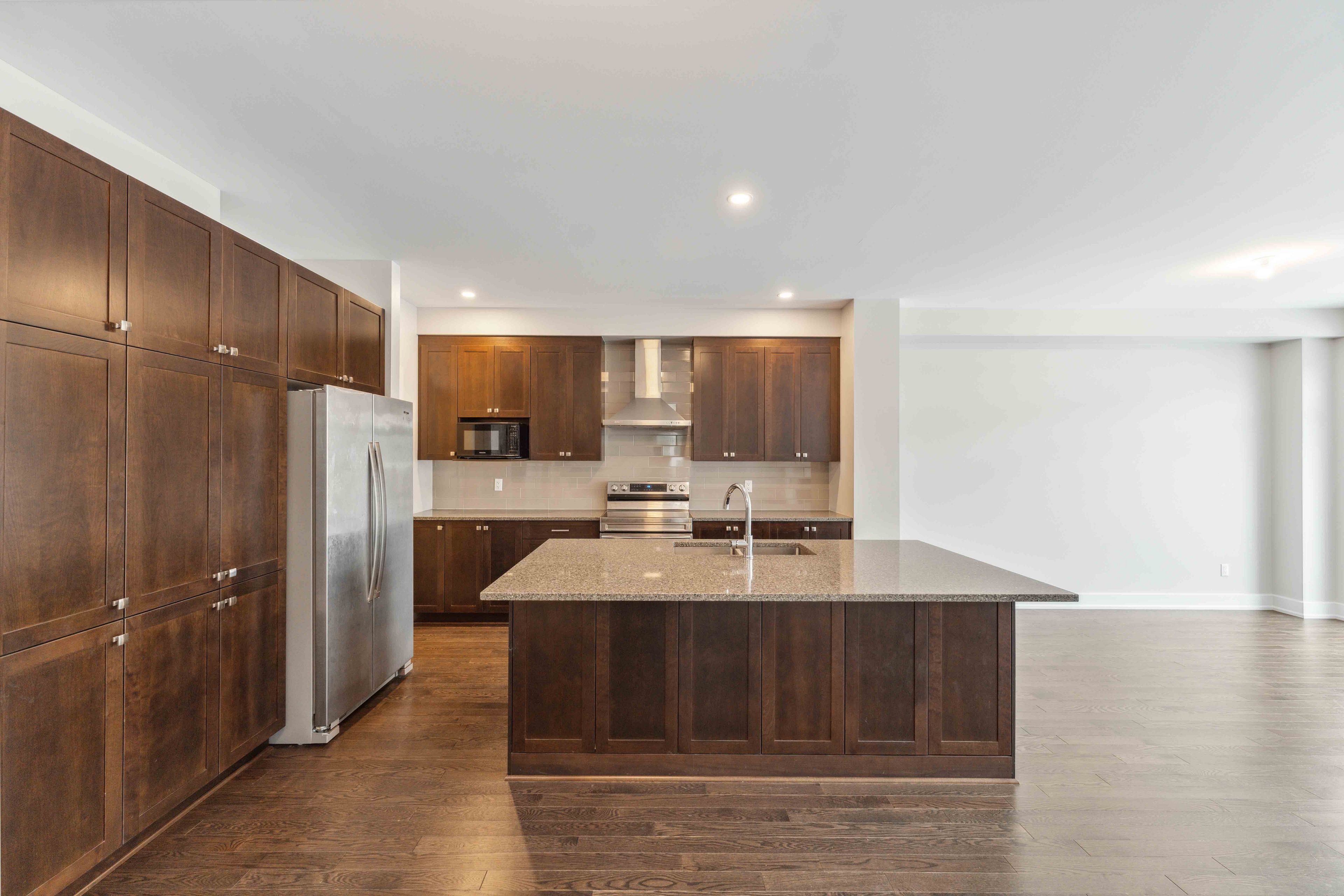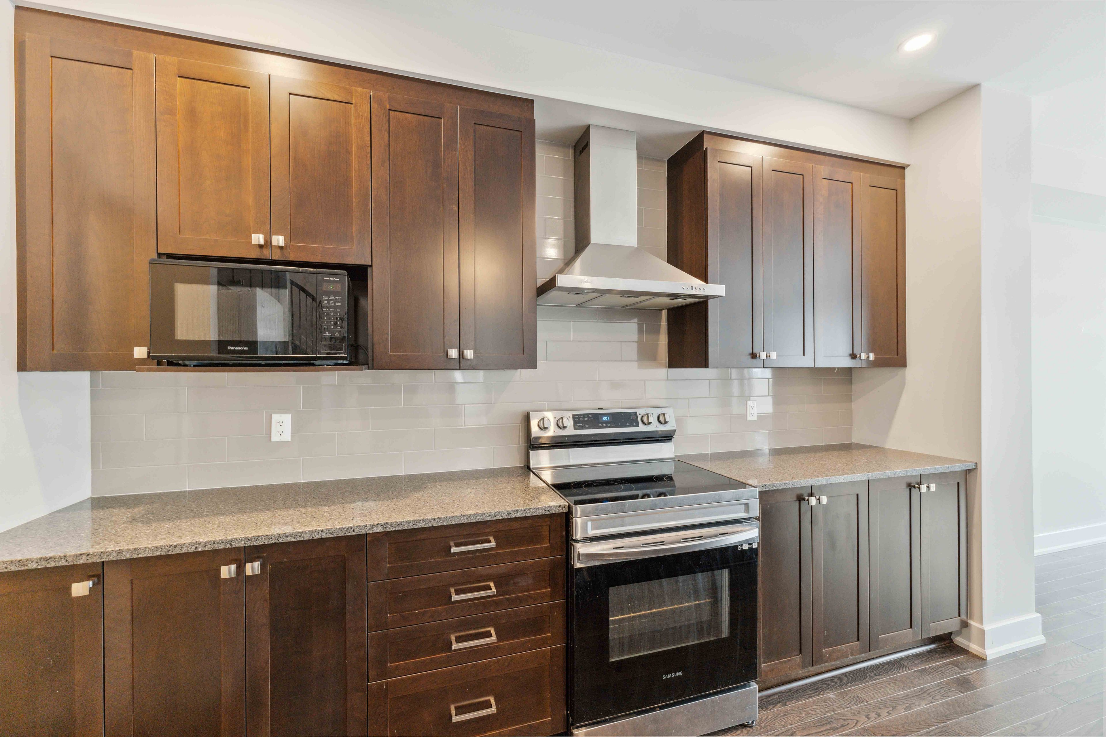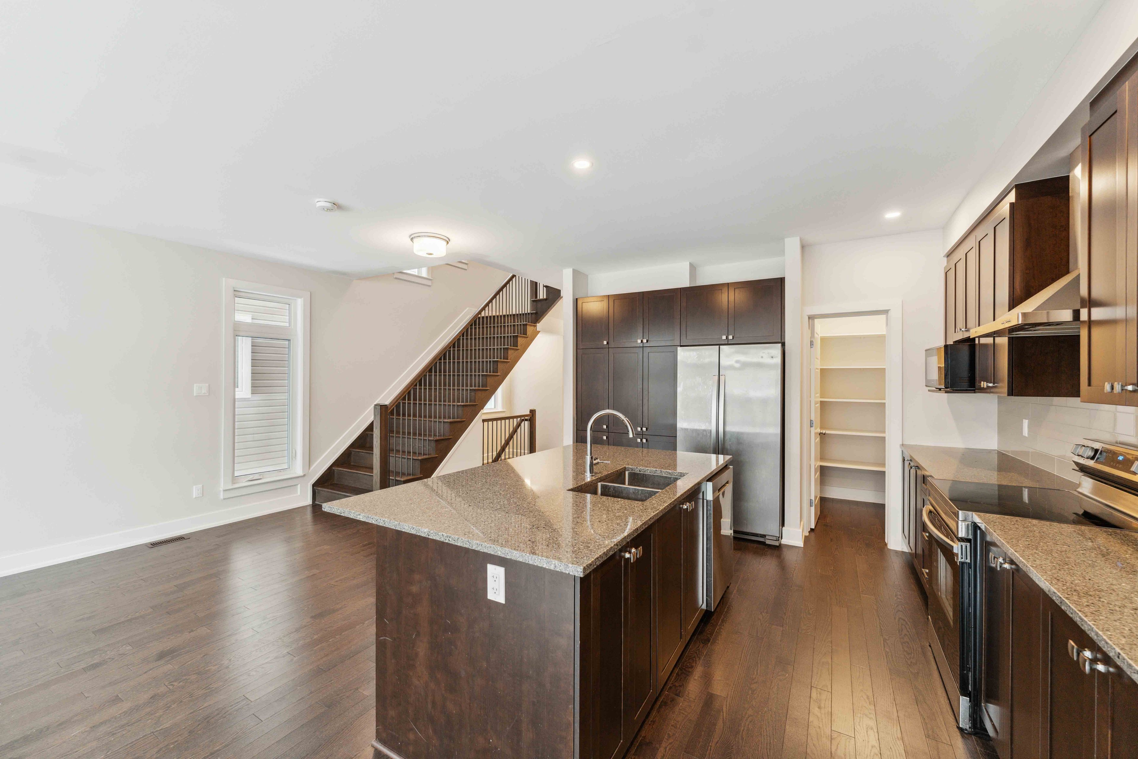 • Chef's kitchen features stainless steel appliances and quartz countertops.