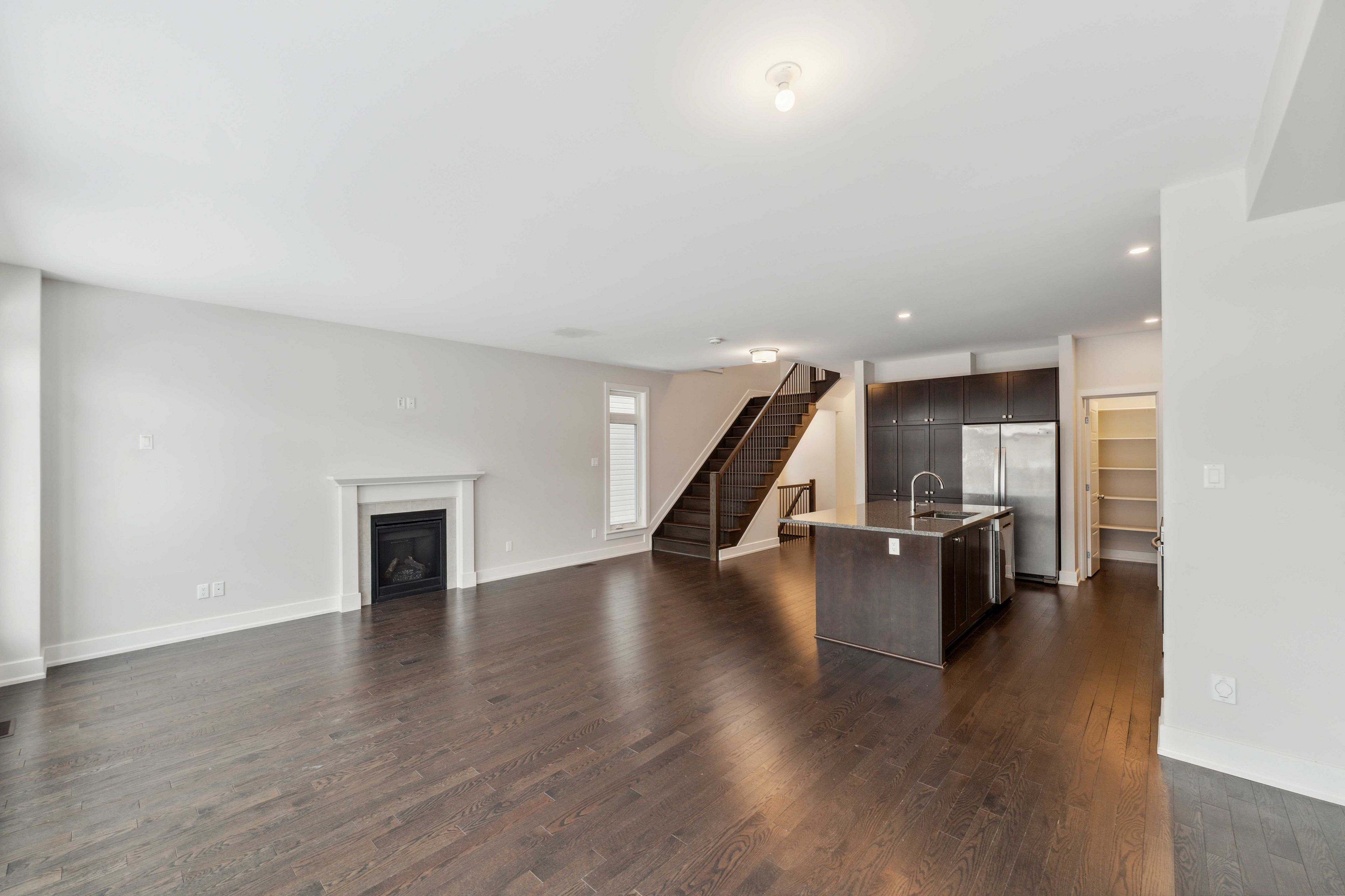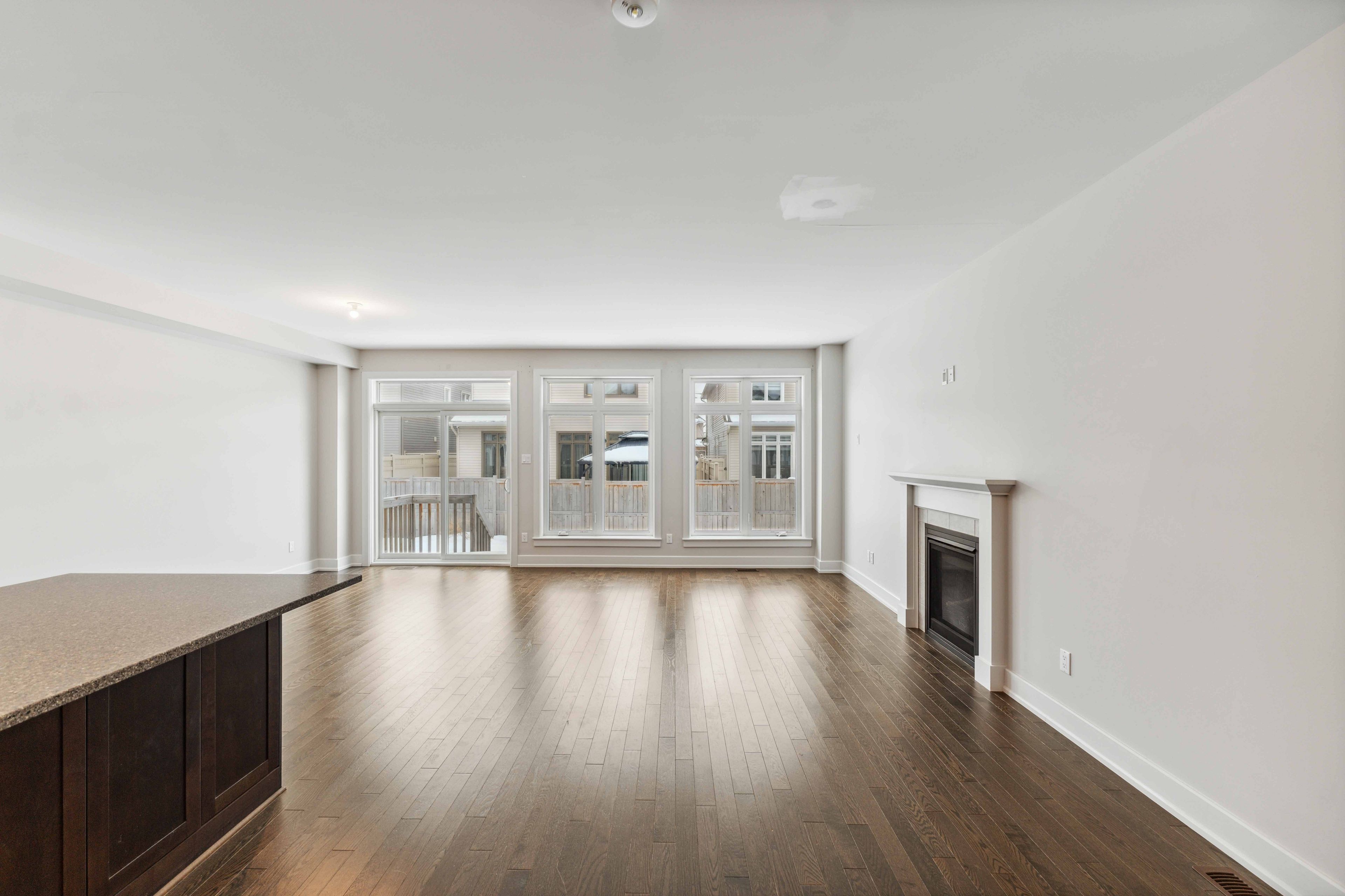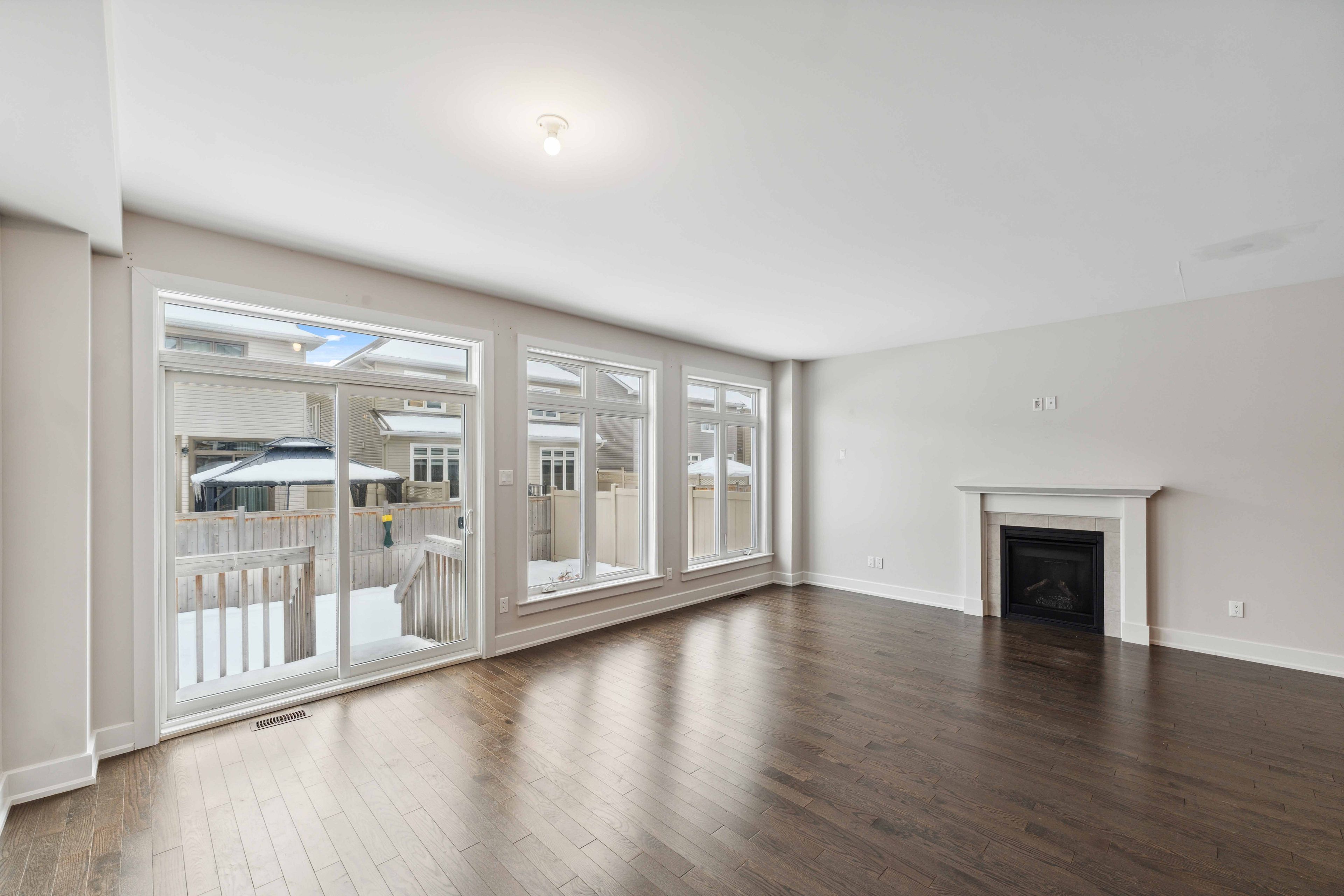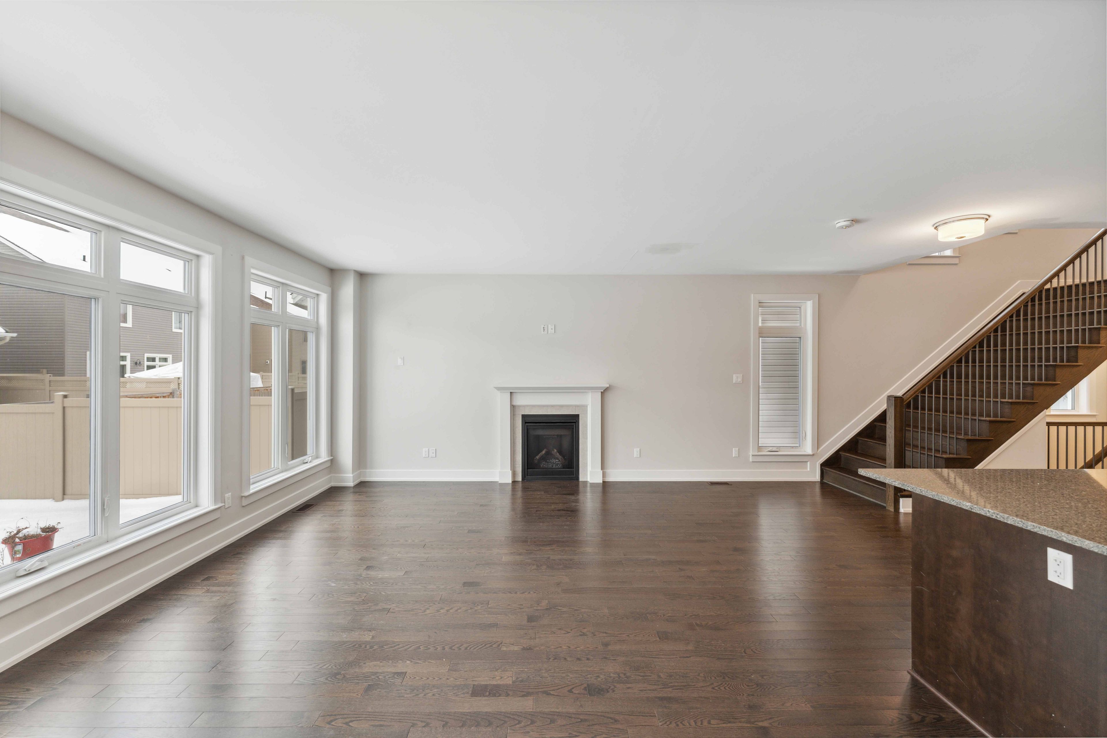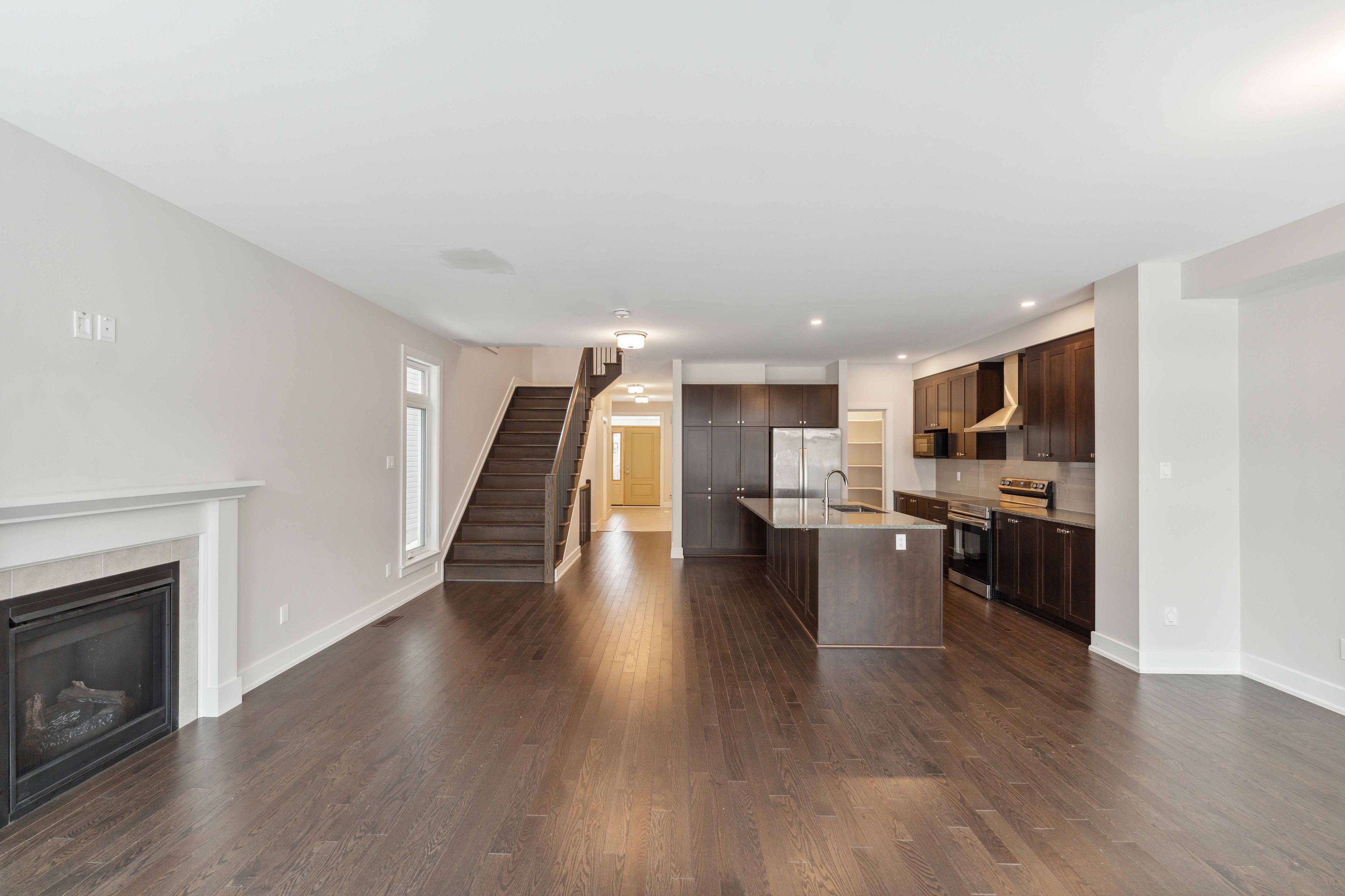 • Open-concept main floor with hardwood flooring and a gas fireplace.
