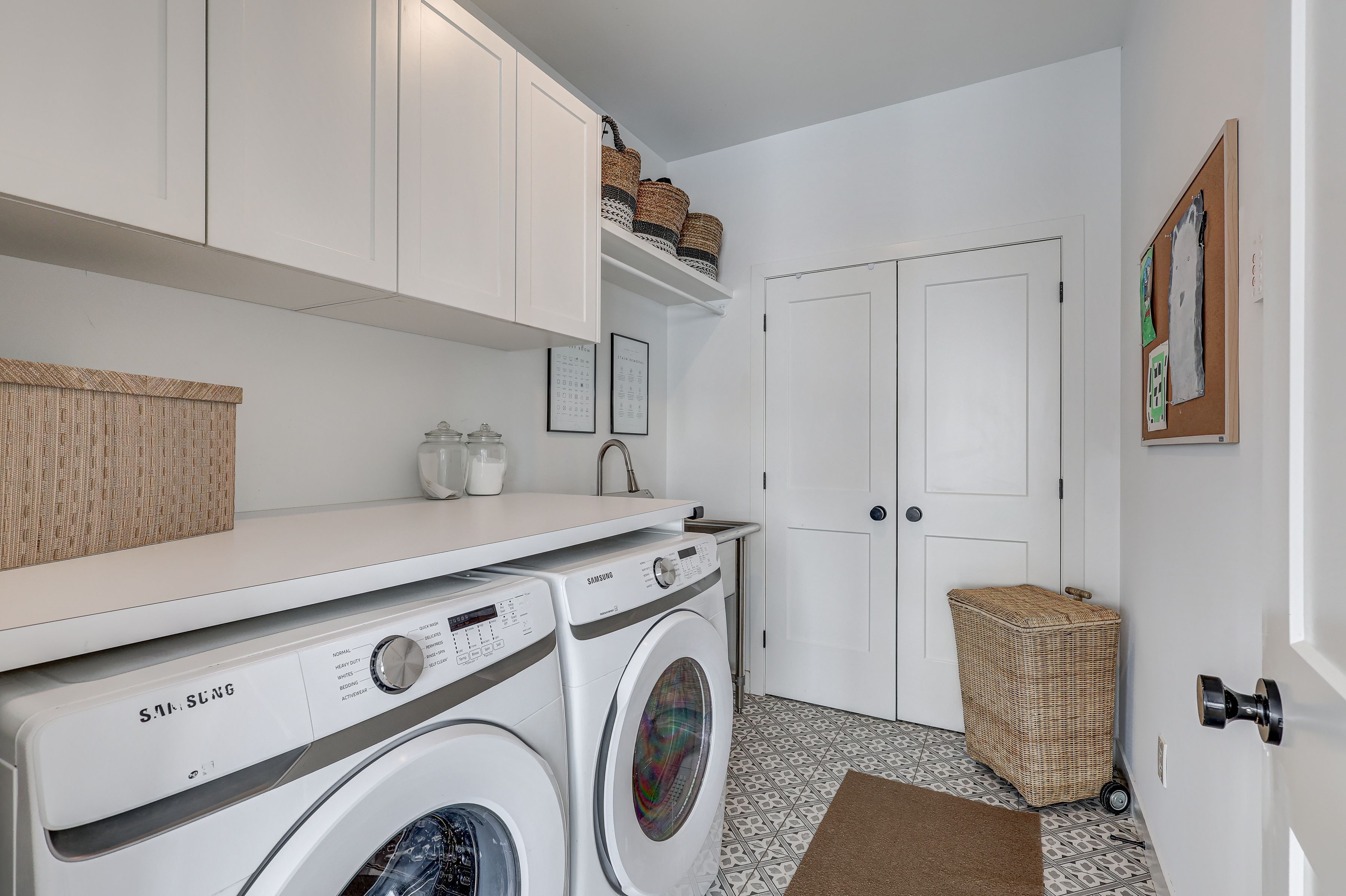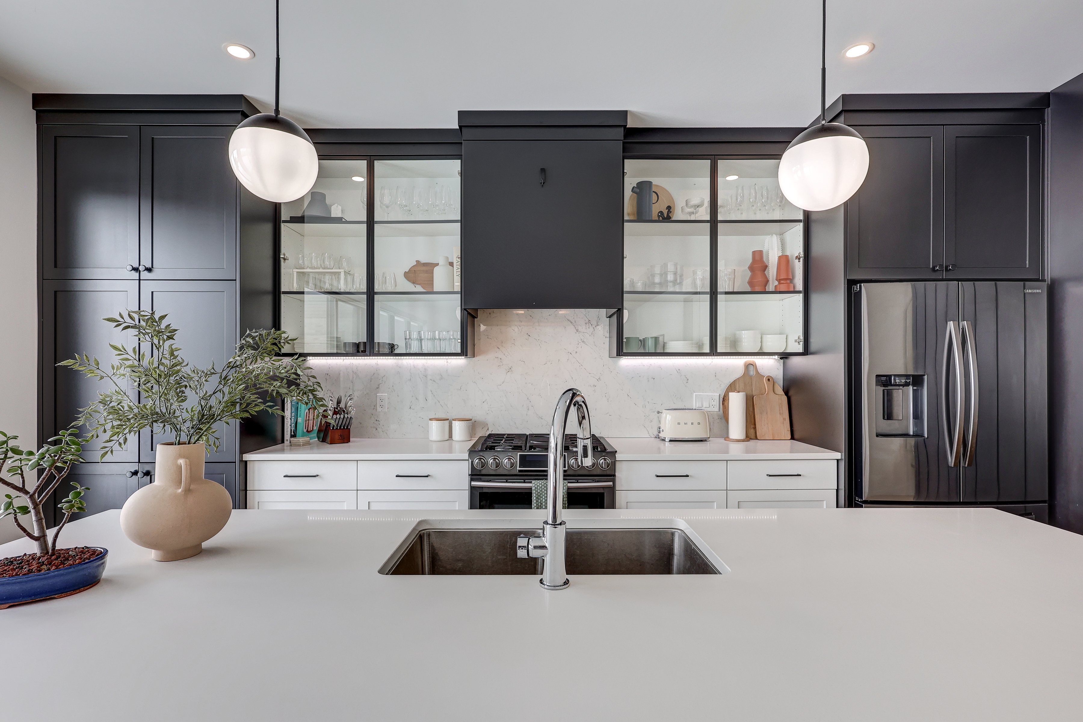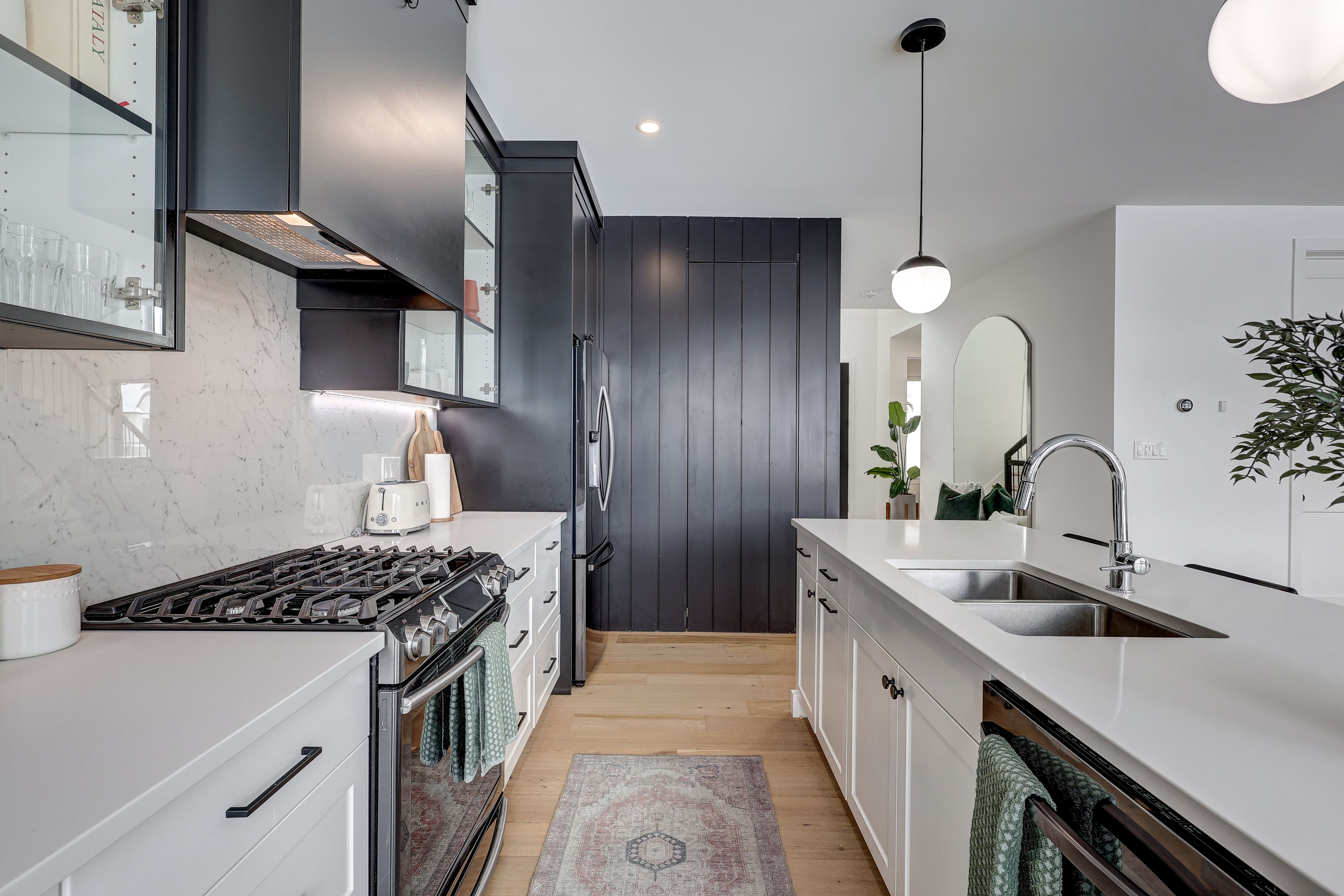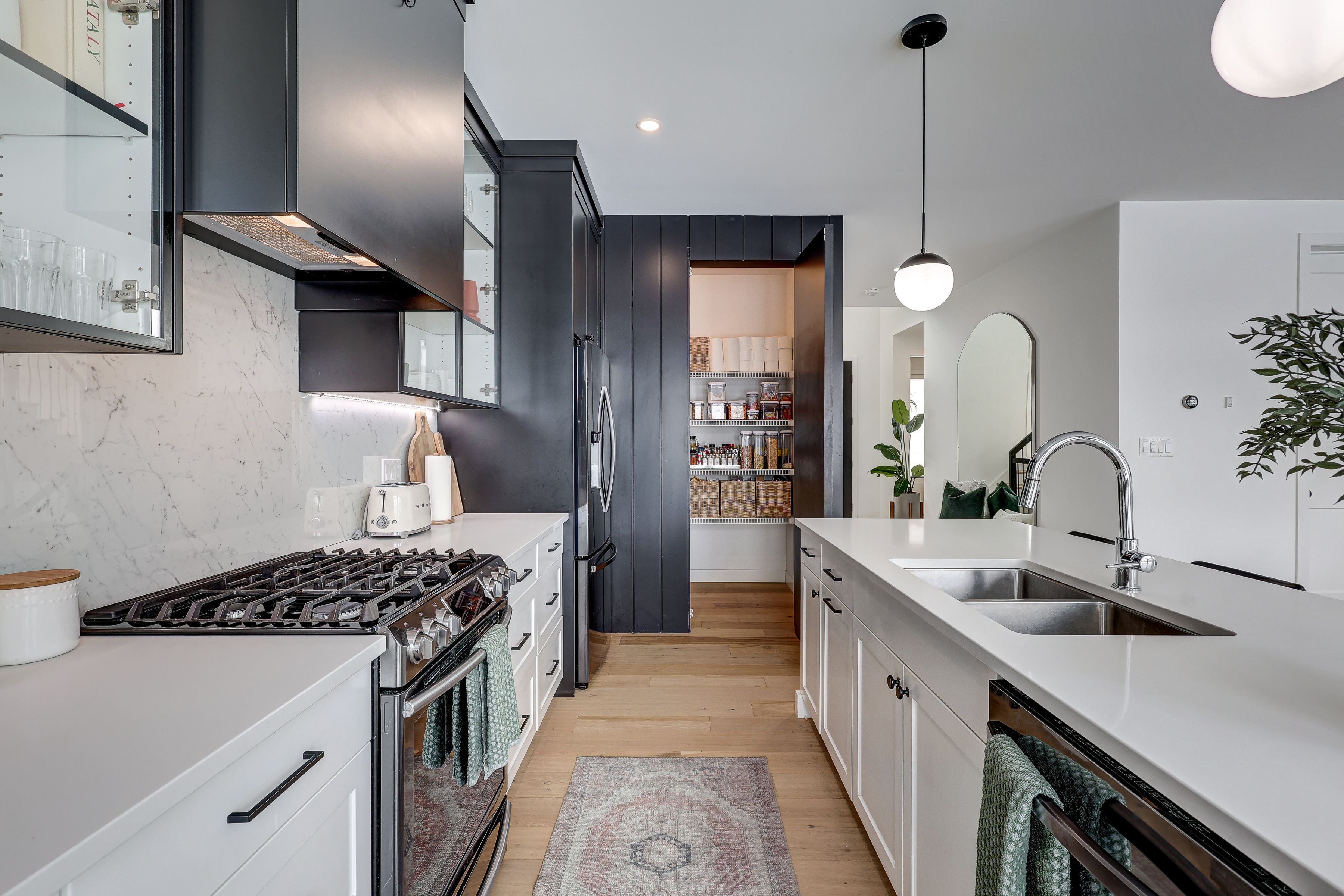 • Chef-inspired kitchen features a sophisticated hidden pantry and stone backsplash.