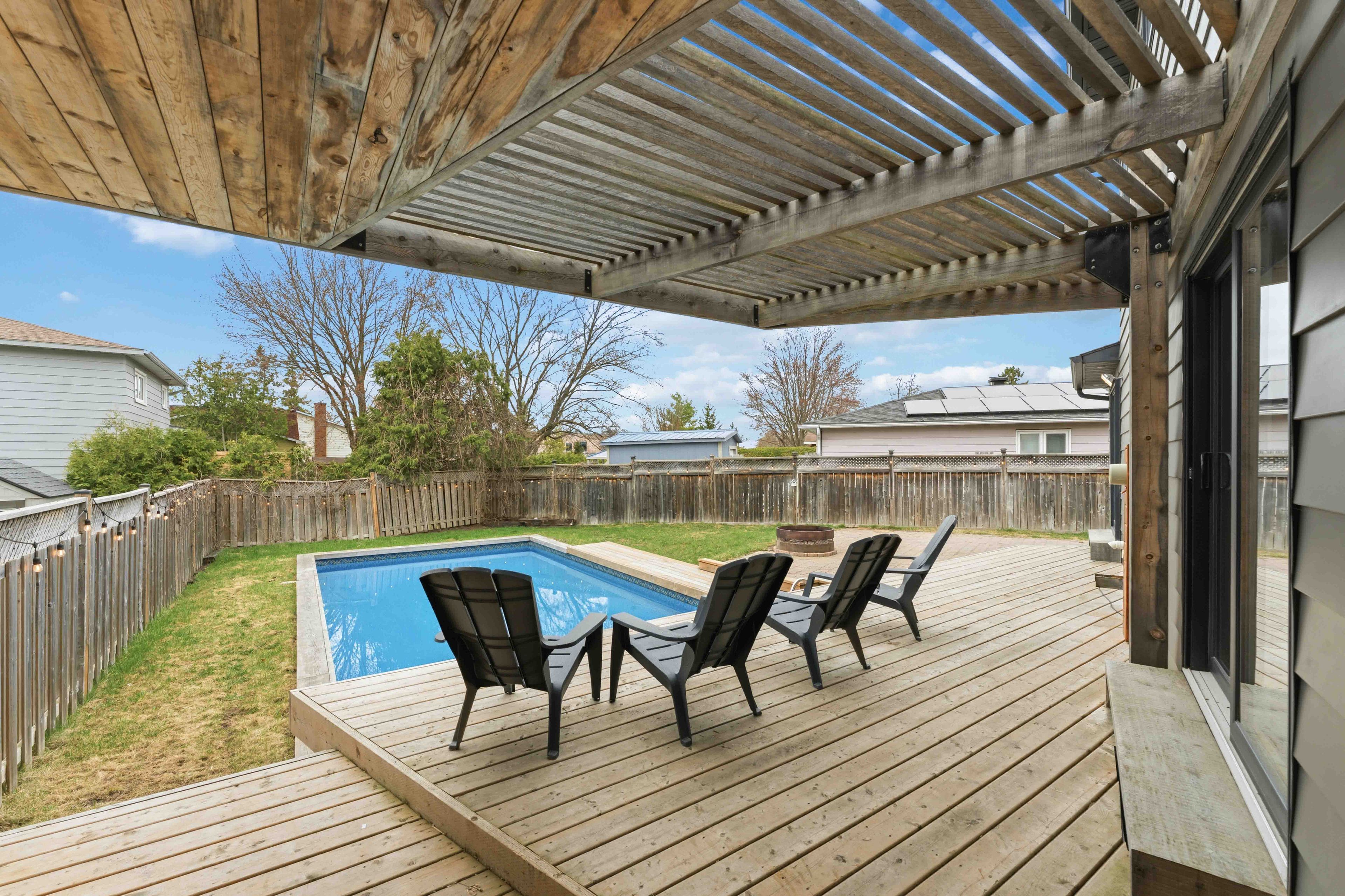 • Large pie-shaped backyard features an inground pool for summer fun.
