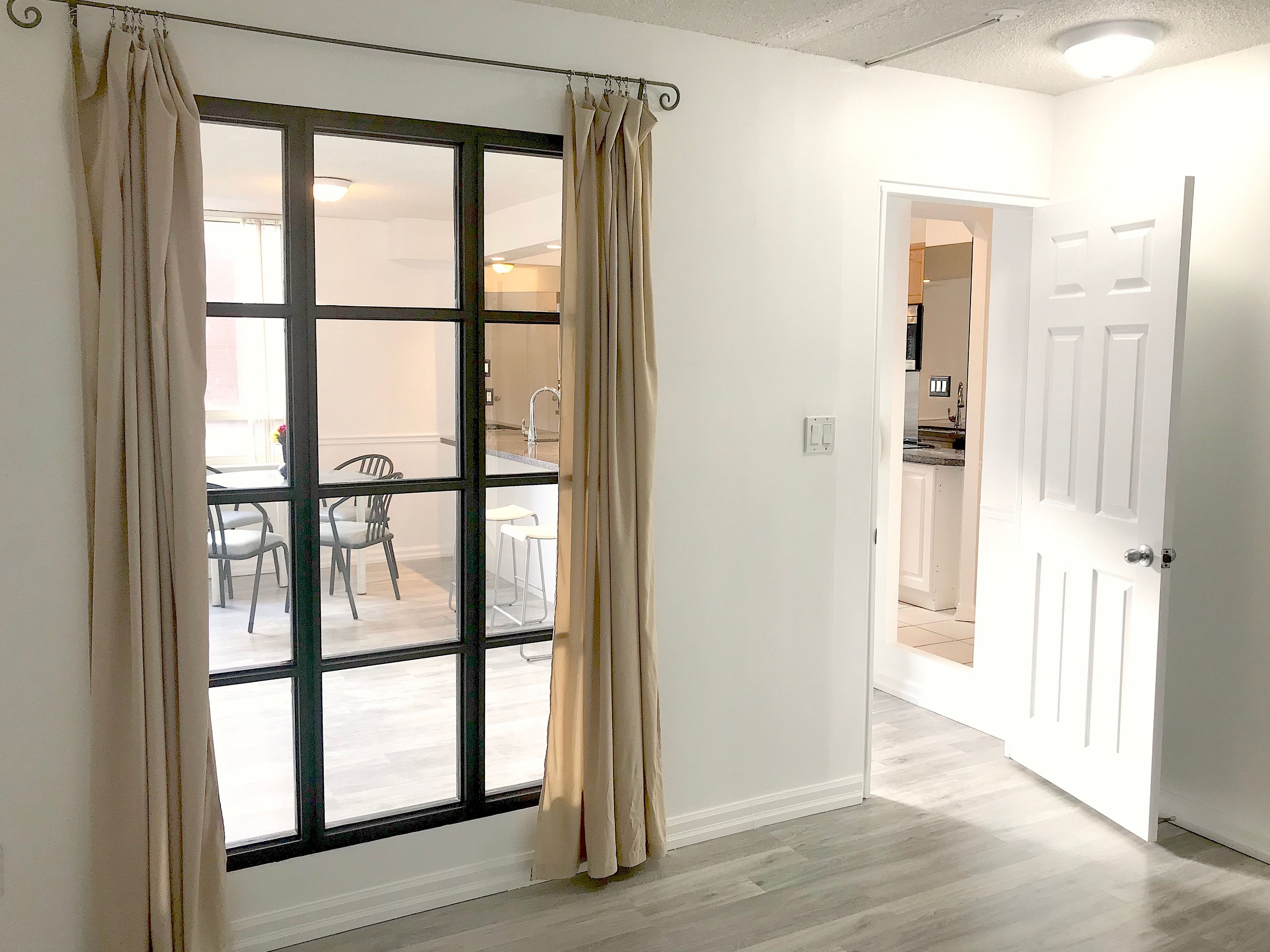Only one of 4 units in the building of this size, open plan with absolutely no wasted space. The great room is 27 6 x 15 10 with south and west windows, is very bright and pleasant. The large den is rare and offers many uses. The large open kitchen with bronze mirror, stainless steel backsplash and breakfast bar are excellent for cooking and entertaining. The location is ideal for downtown convenience, and is truly a rare find. Recently installed laminate flooring, granite counter in kitchen, freshly painted throughout, renovated large 1 bedroom + very large sun-room. Corner unit, unique layout, very spacious, lots of windows, 882 sq ft of space, unit located at yonge and dundas. Steps to hospitals, subway, eaton centre, tmu and u of t.