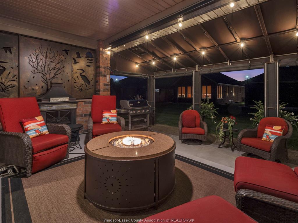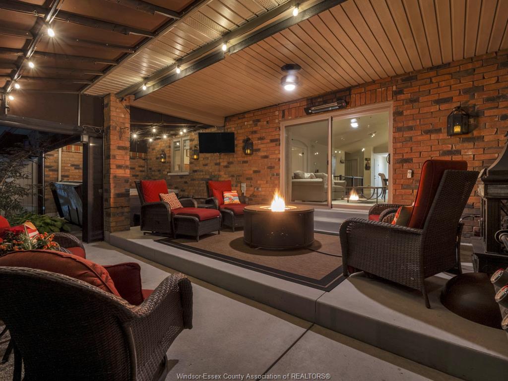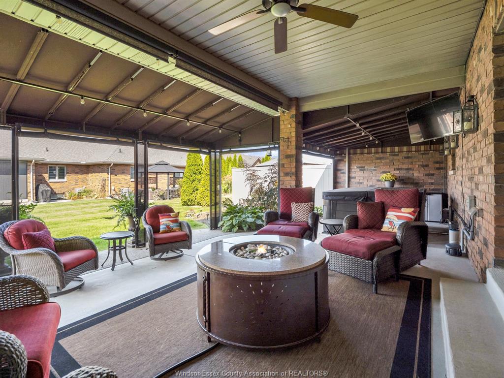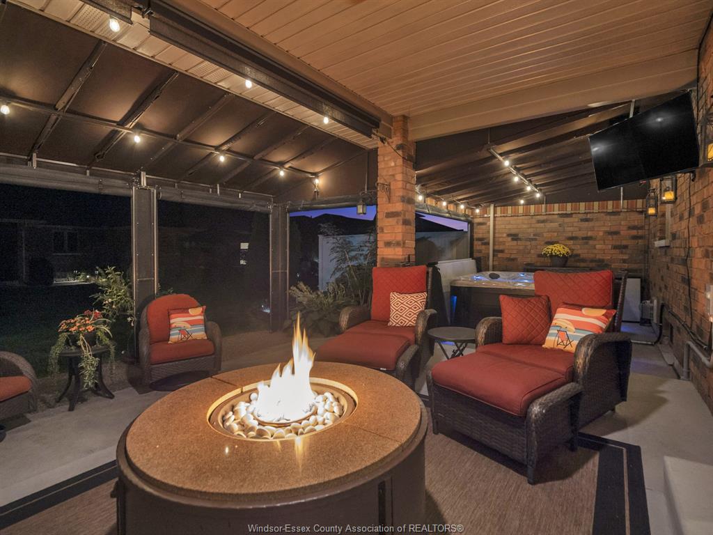 • Backyard oasis featuring a hot tub, outdoor TV, and living space.