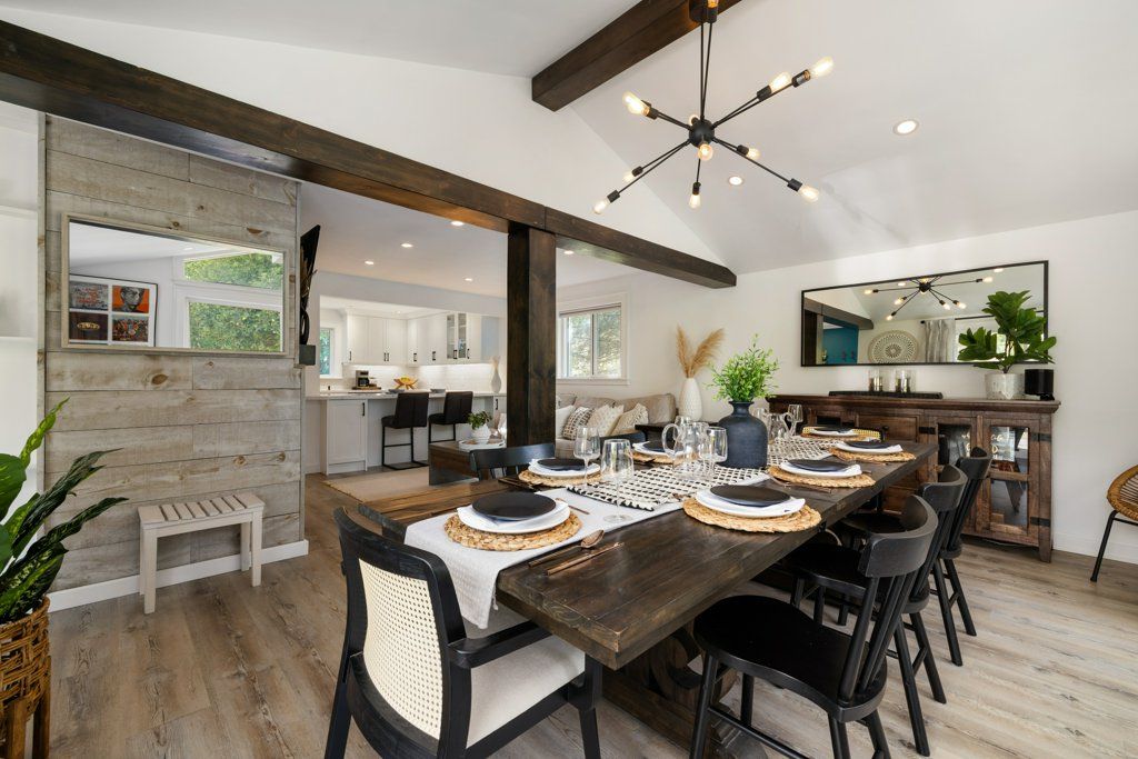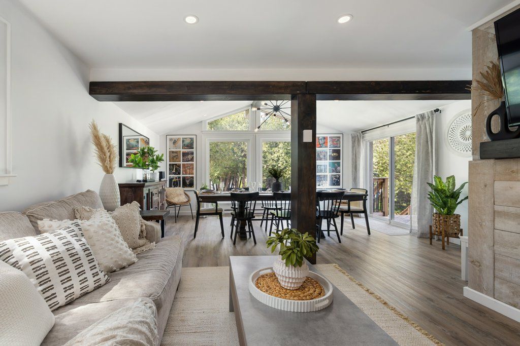 • Spacious living area with dramatic A-frame window, leading to upper deck.