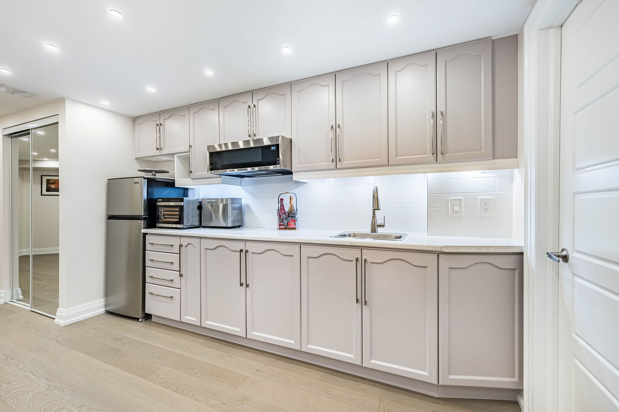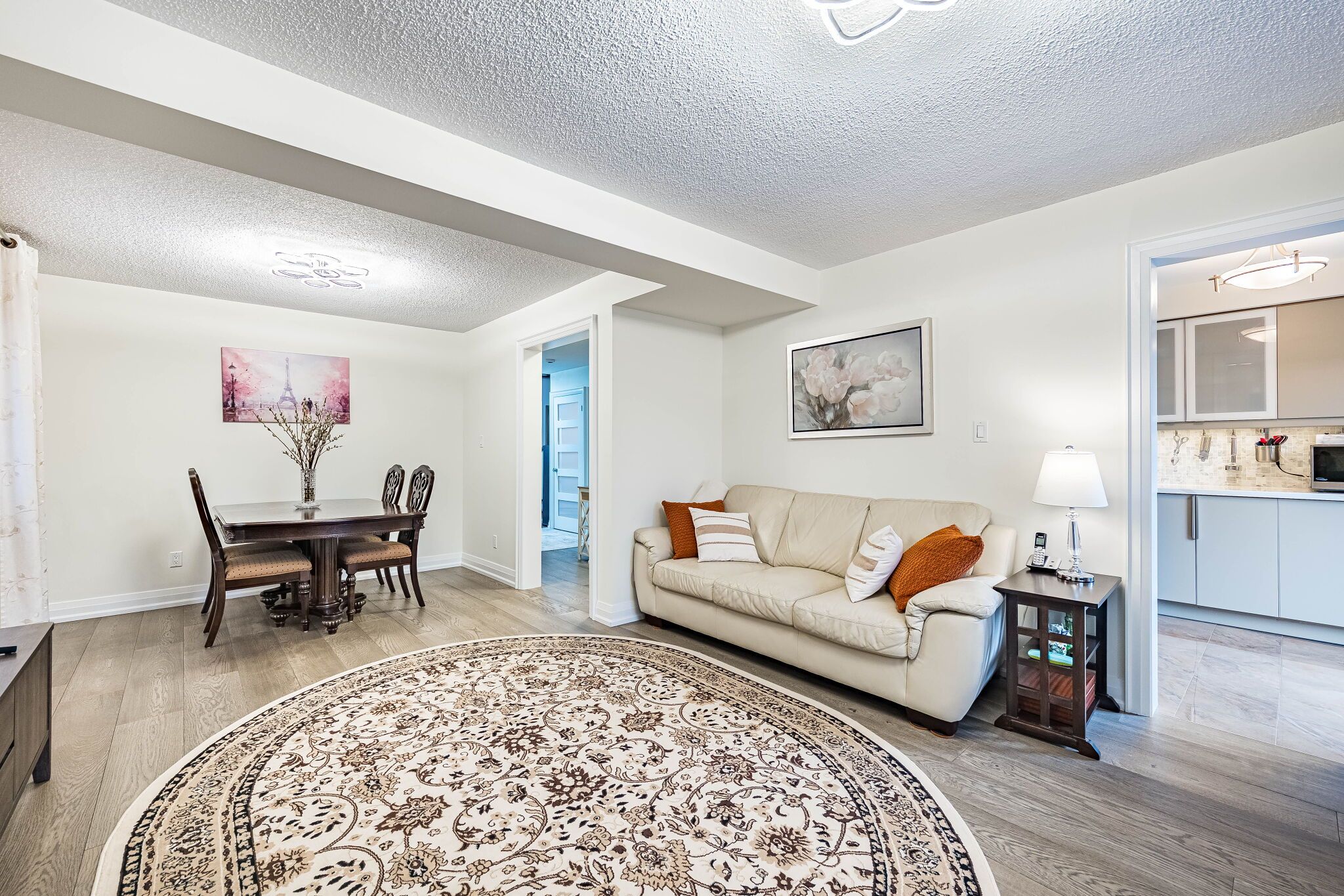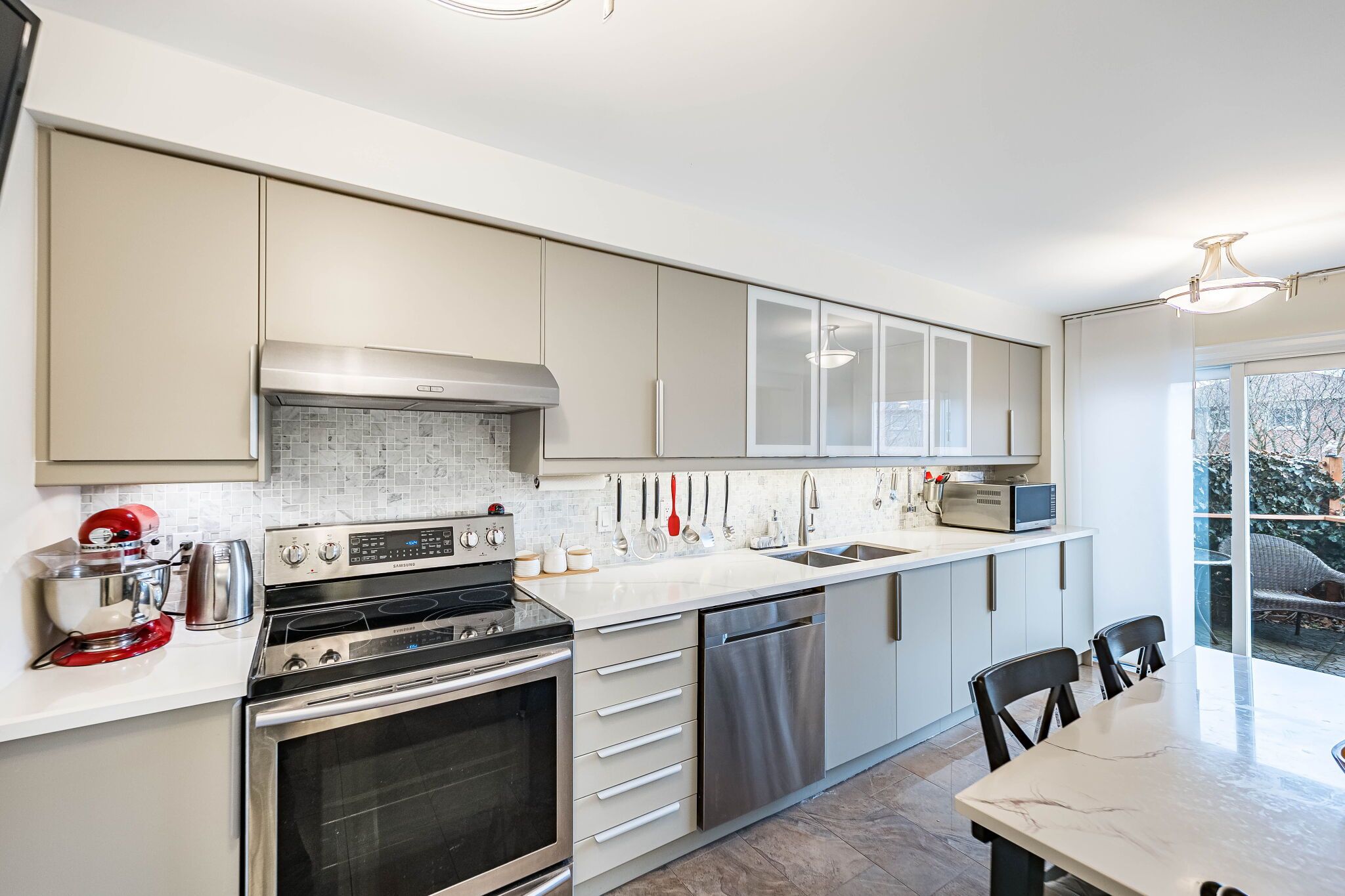 • Custom eat-in kitchen with stainless steel appliances and quartz countertops.