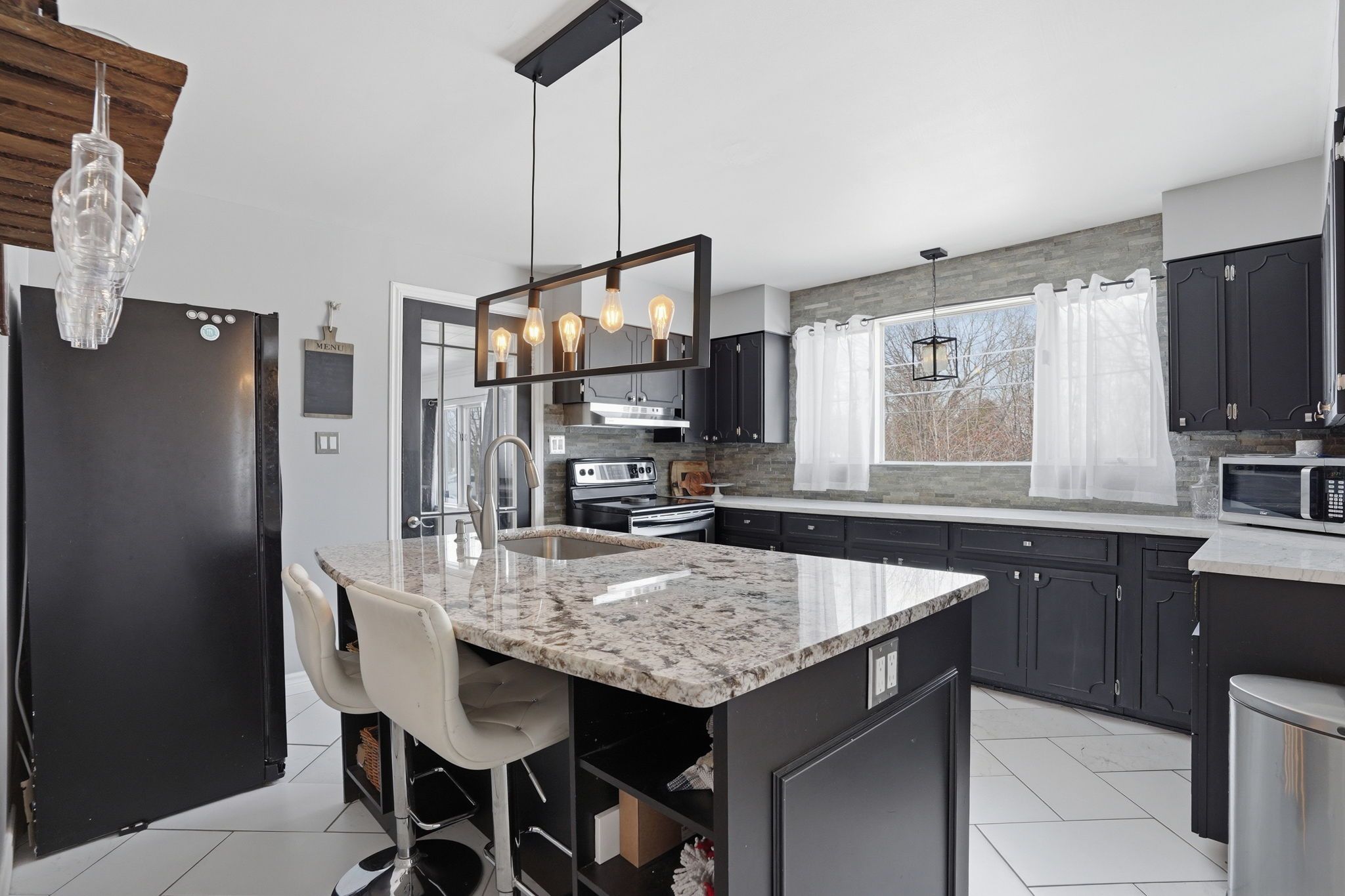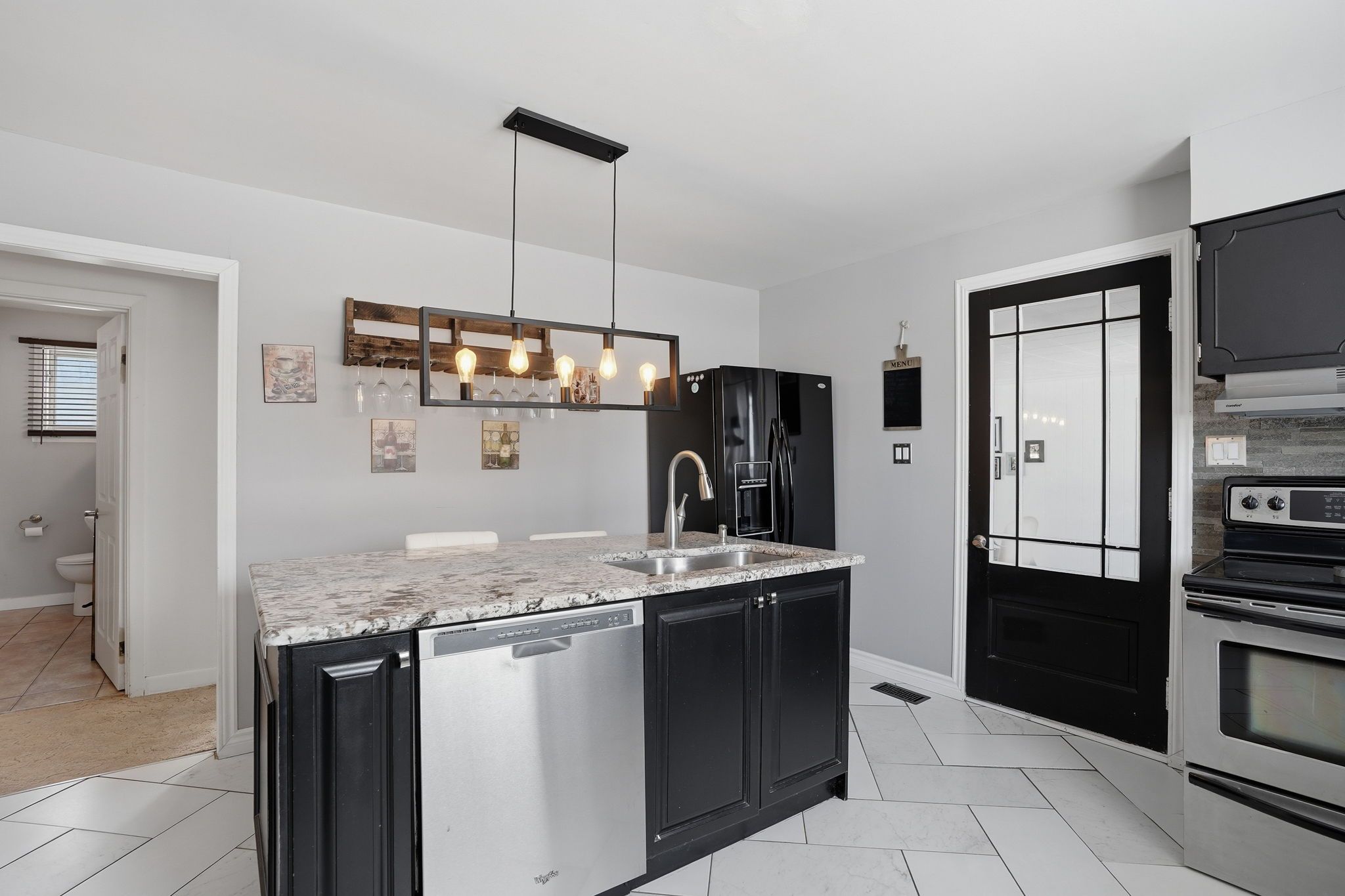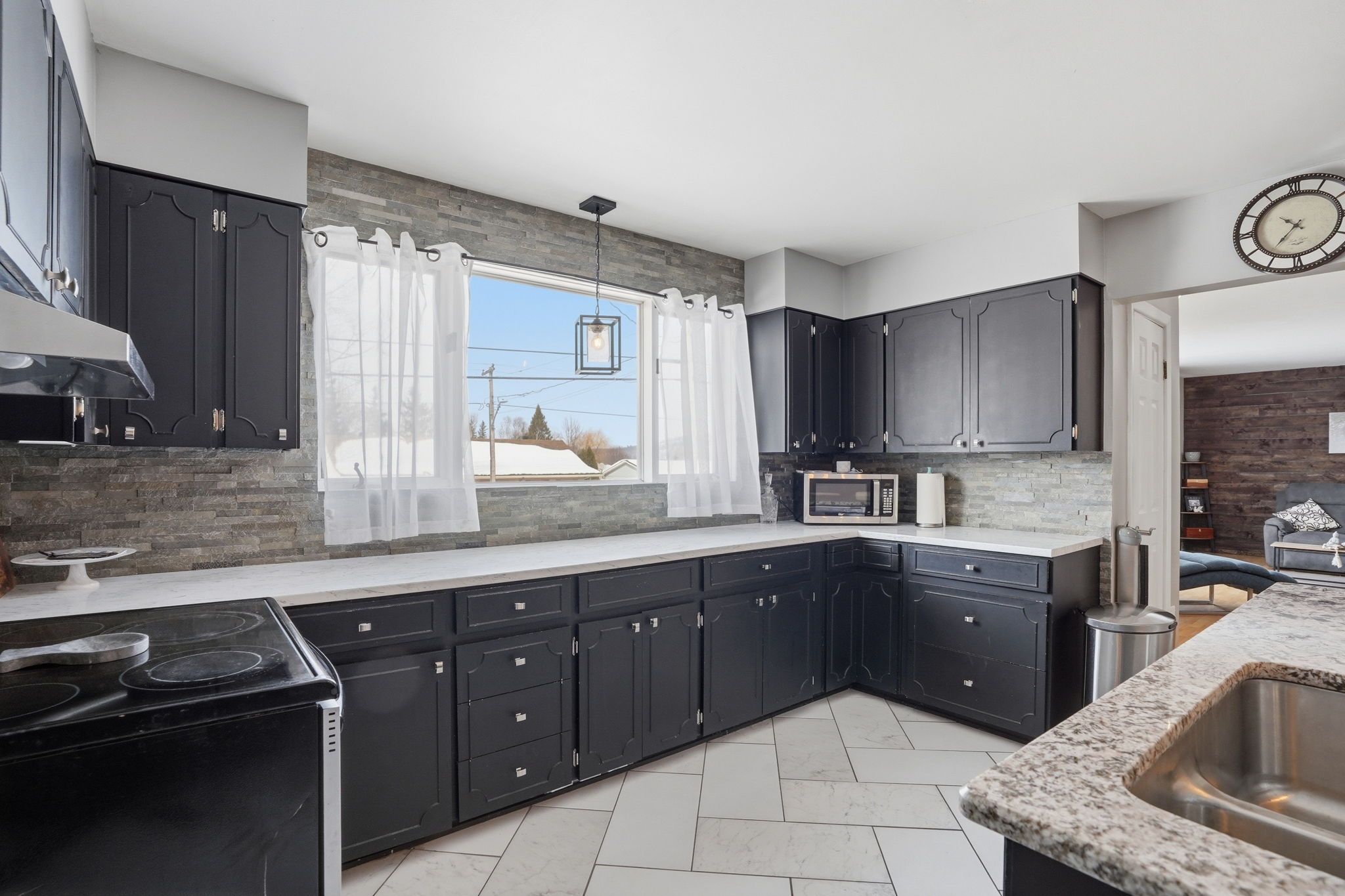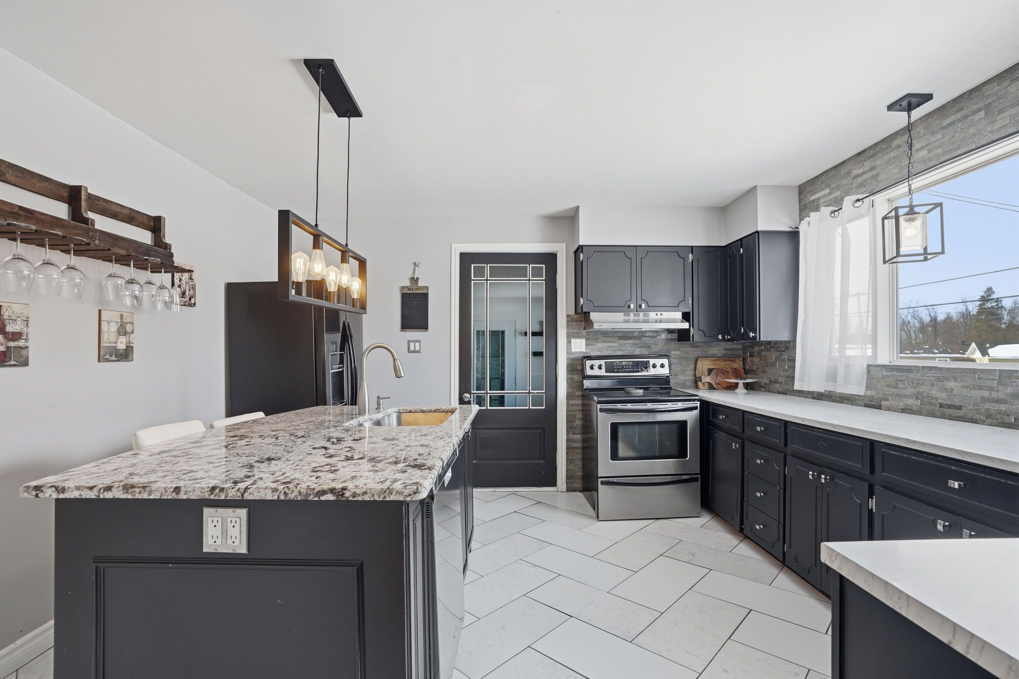 • Main floor features three bedrooms and bright eat-in kitchen with granite countertops.