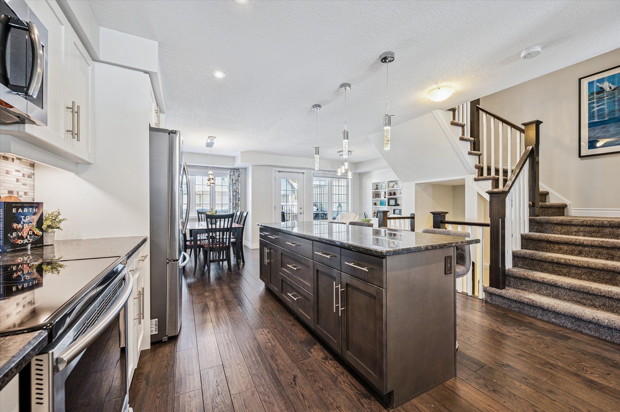Exceptionally maintained and thoughtfully curated, 54-635 saginaw parkway is an executive townhome in north galt offering refined finishes, generous living space, and a prime location close to schools, shopping, and the 401. Offering approximately 2,200 sq ft of finished living space (1,750 sq ft above grade plus a 450 sq ft finished walkout basement), this home blends style and functionality across all three levels. The bright, open-concept main floor features engineered hardwood flooring and a stunning modern kitchen with granite countertops, a large centre island, soft-close cabinetry, under mount lighting, stylish backsplash, stainless steel appliances, and elegant pendant lighting, flowing seamlessly into the spacious family room with a cozy gas fireplace, alongside a generous dining area and versatile bonus space ideal for a home office or sitting area. A stylish 2-piece powder room and double doors leading to a private terrace complete the main level. Upstairs, you'll find three generously sized bedrooms with hardwood flooring, including a primary suite with a walk-in closet and a beautifully finished 3-piece ensuite with double vanity and tiled shower, as well as convenient upper-level laundry and a 4-piece family bath. The fully finished walkout basement adds exceptional value with custom built-in cabinetry, a spacious rec room, dedicated office area, a 2-piece bathroom, inside access to the garage, and a welcoming foyer with double closets, making this move-in-ready home an exceptional opportunity for executive townhome living.