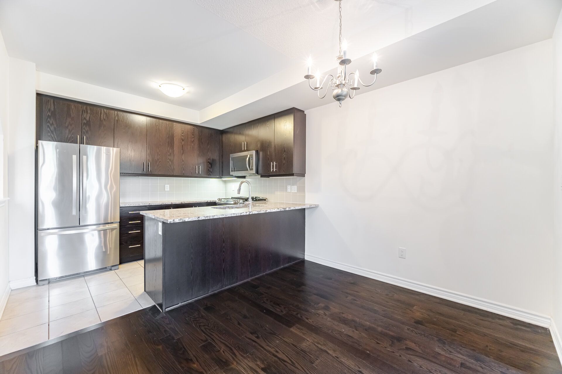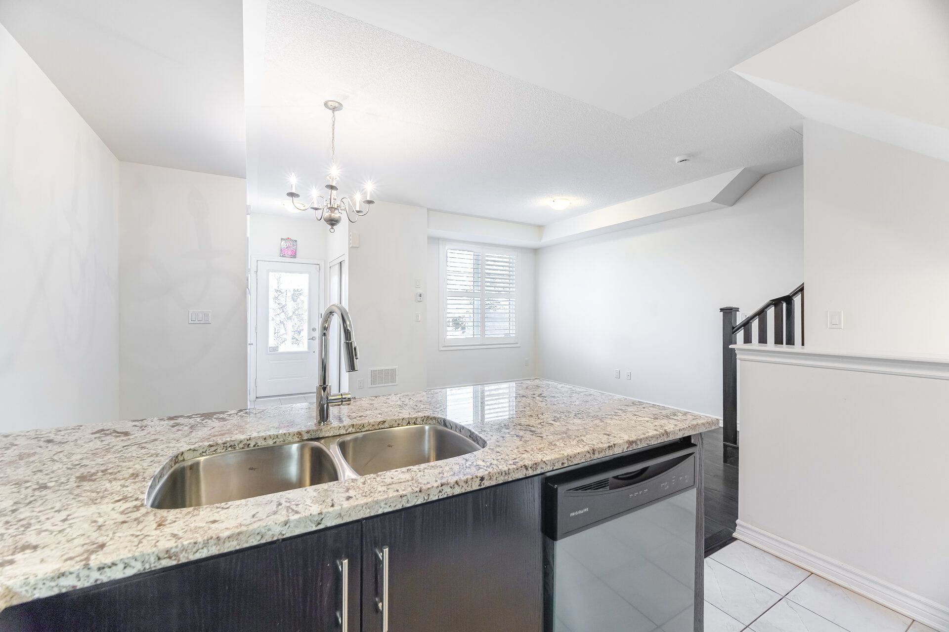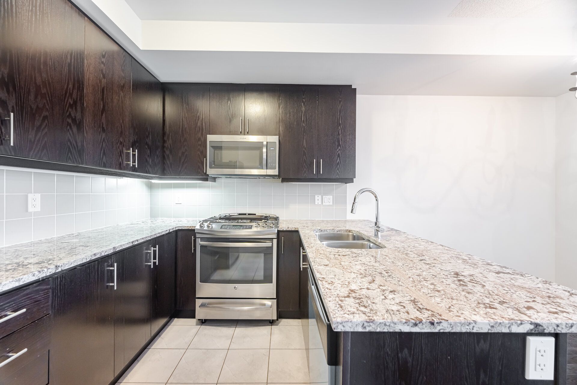 • Modern kitchen with granite countertops and stainless-steel appliances.