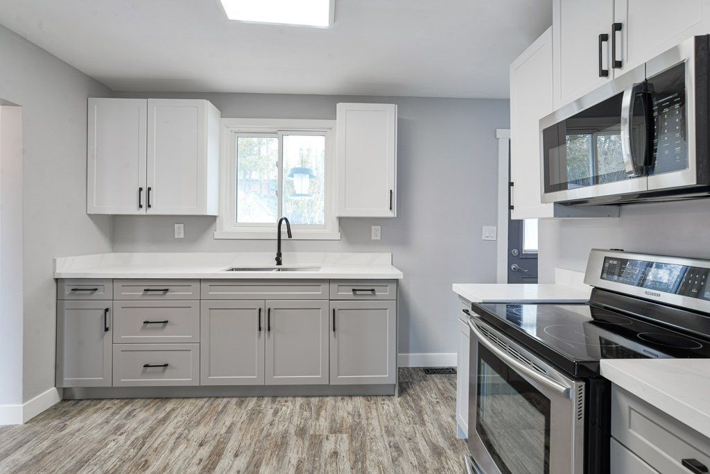 • Modern kitchen featuring quartz countertops and stainless steel appliances.