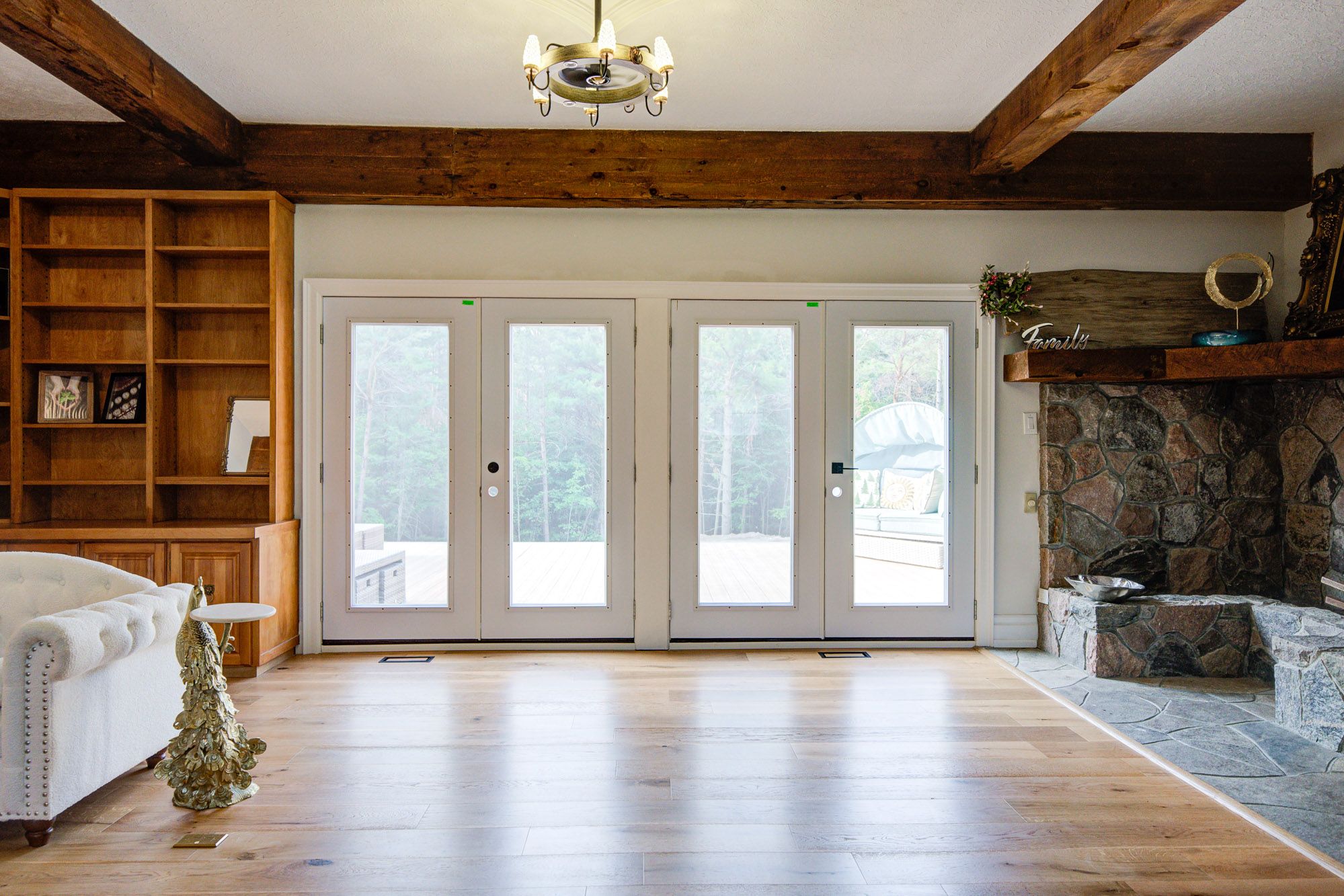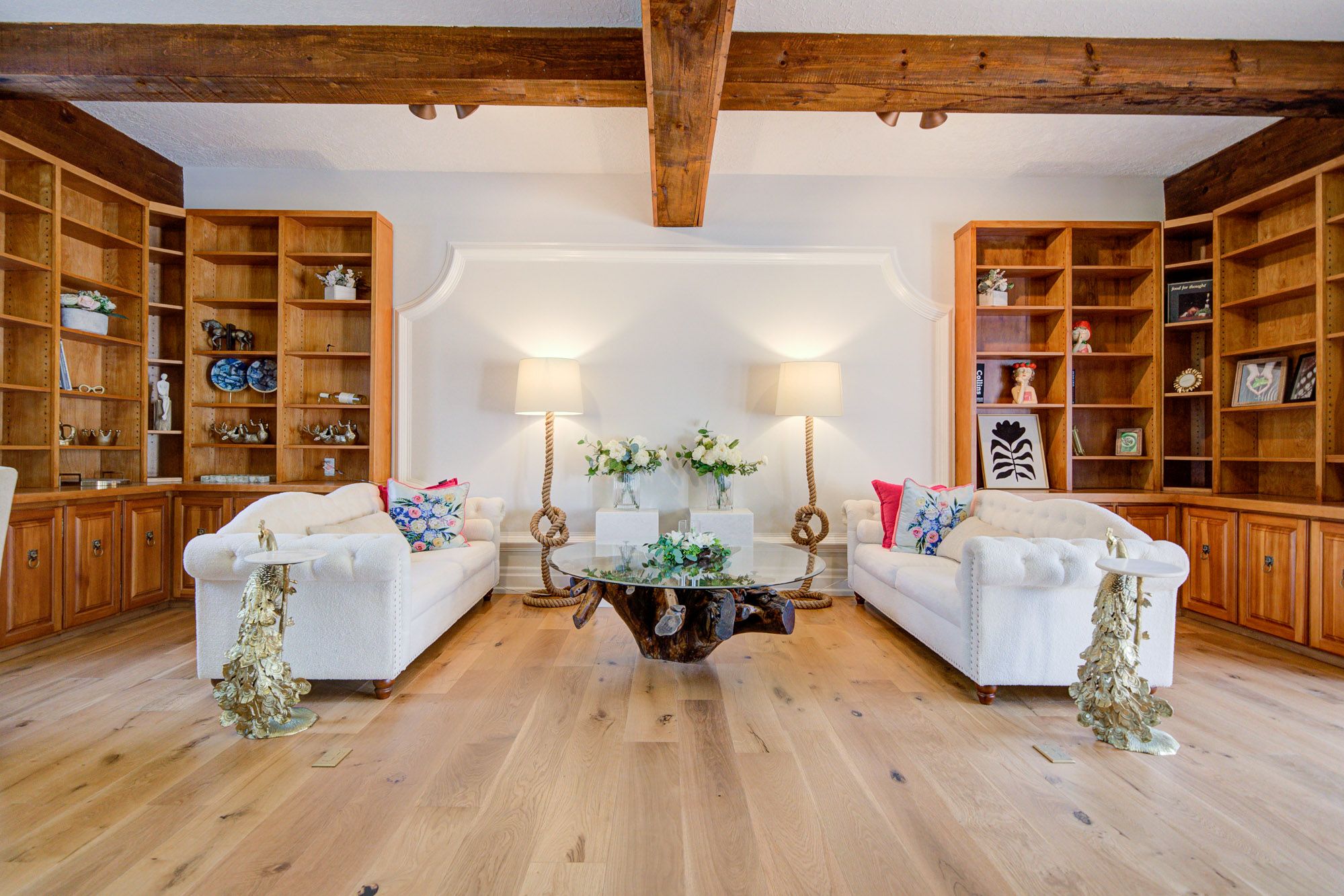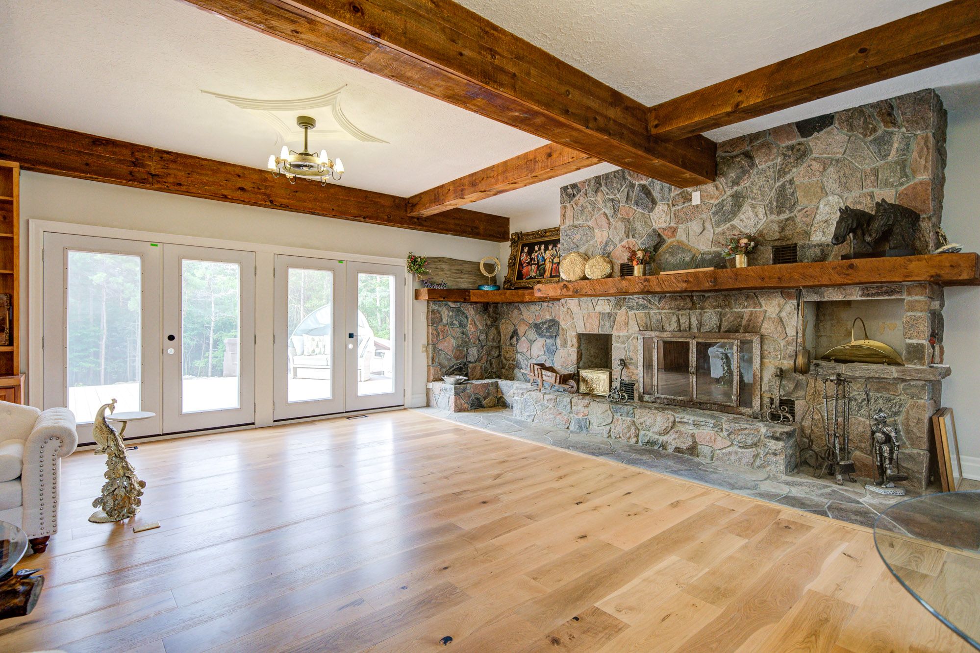 • Stunning family room with wooden beams and a floor-to-ceiling fireplace.