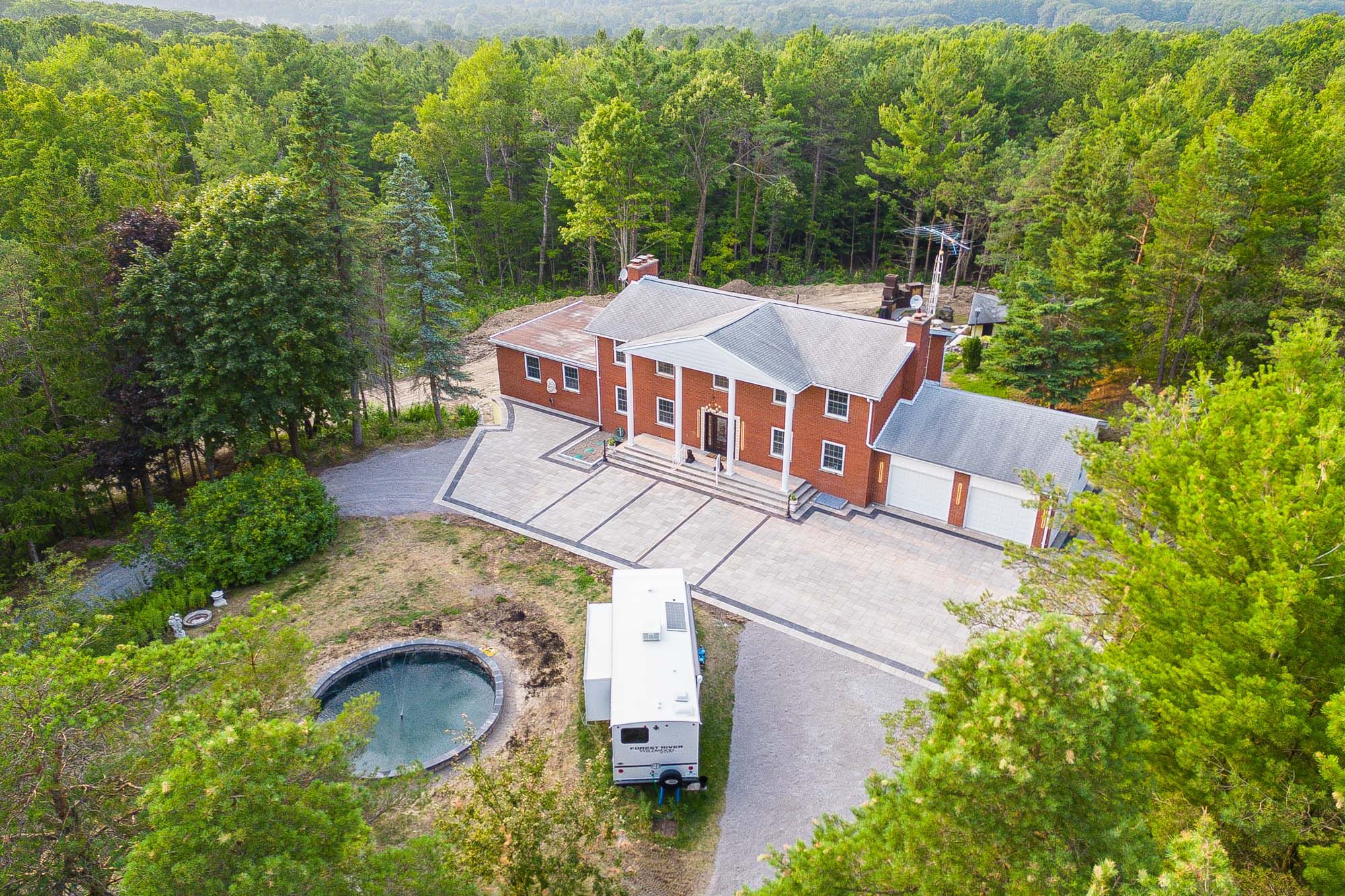 Discover unparalleled privacy and timeless charm at this custom-built sanctuary, nestled on nearly 12 lush acres in the heart of rural uxbridge. Set behind a private security gate, a tree-lined path leads you to a residence defined by sophisticated country living. The showstopping family room features soaring wooden beams and a floor-to-ceiling stone fireplace, with walkouts to a backyard oasis complete with a cascading waterfall, serene pond, and a built-in outdoor fireplace/pizza oven for magical evenings. Inside, find rare architectural gems like a sunken living room and a sprawling main floor offering endless potential. The primary and guest suites offer private walkouts to a flat-top terrace overlooking the forest-perfect for morning coffee. The finished basement features two separate exits and walkout sliding doors, providing seamless in-law capability and flow to the enchanting gardens. Heated efficiently with geothermal energy and located moments from the trail hub, skyloft, and wooden sticks golf, this property offers the ultimate blend of sustainability, tranquility, and convenience.