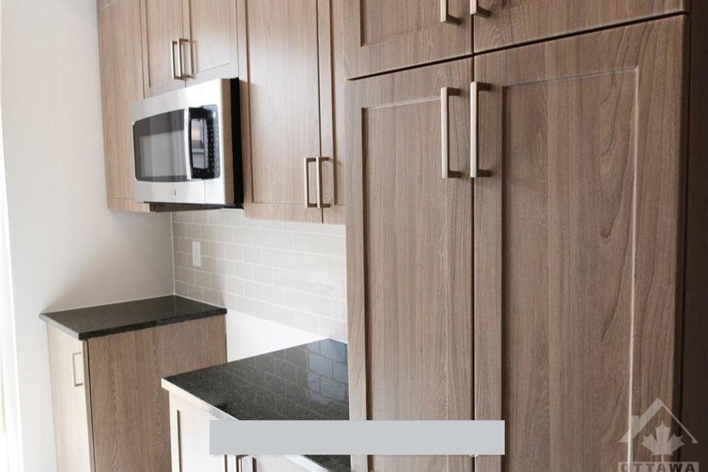 • Modern kitchen featuring elegant cabinetry and a large stone island.