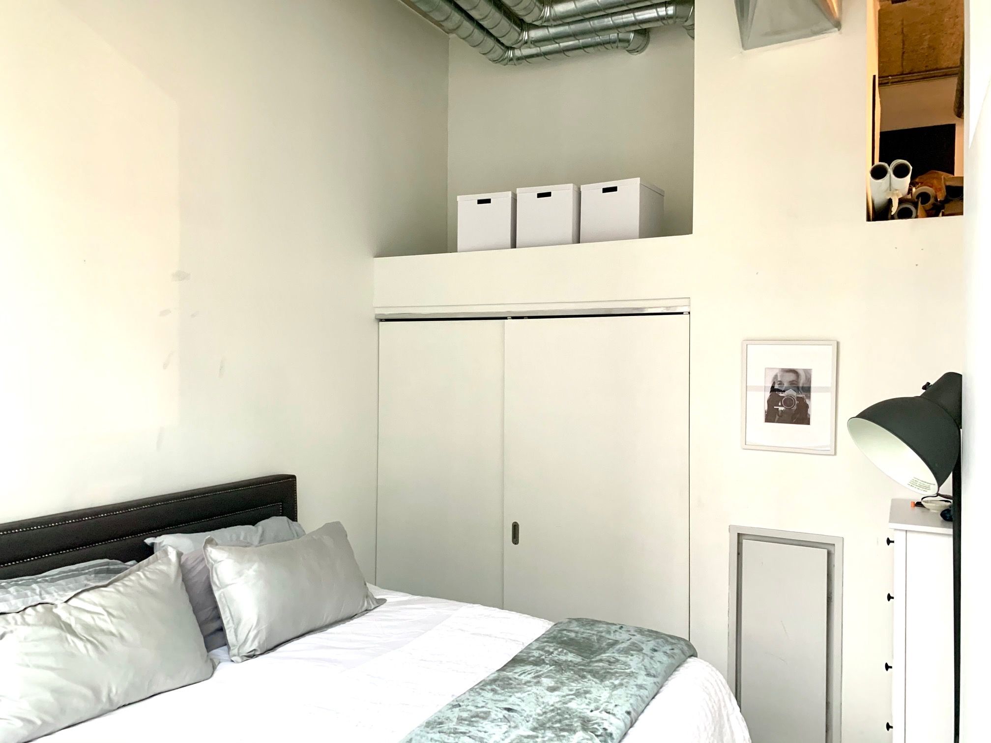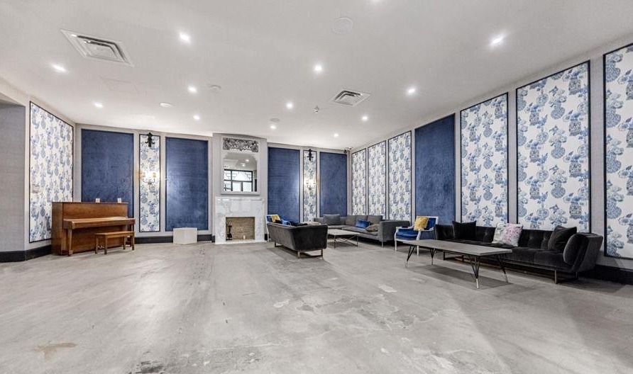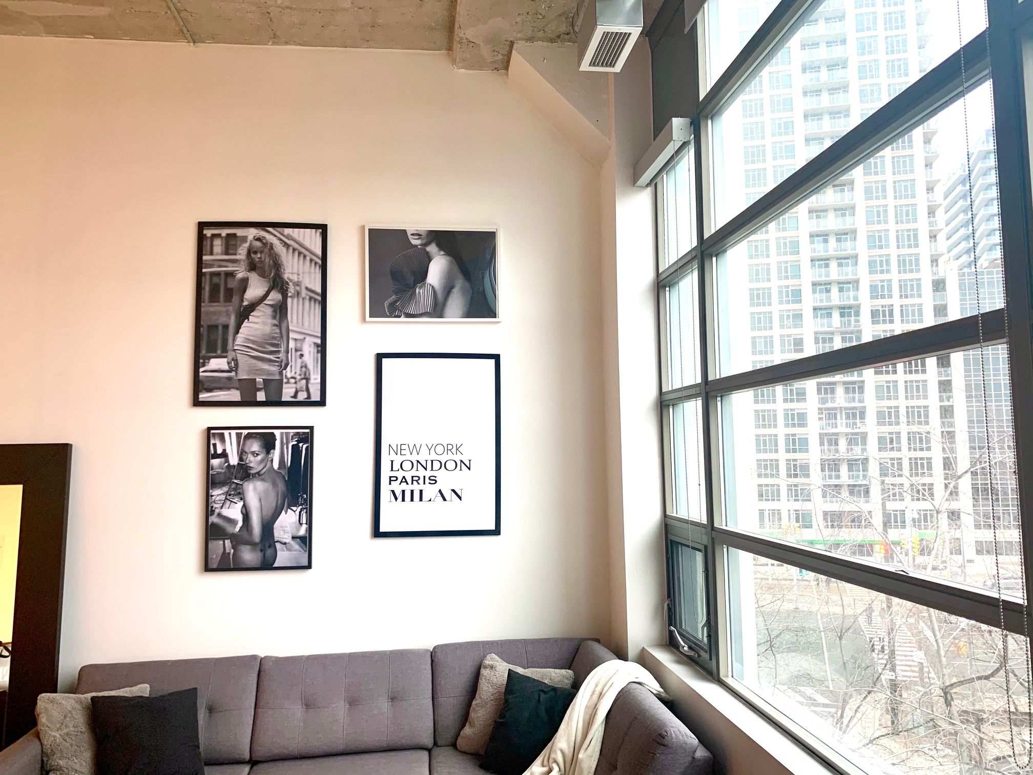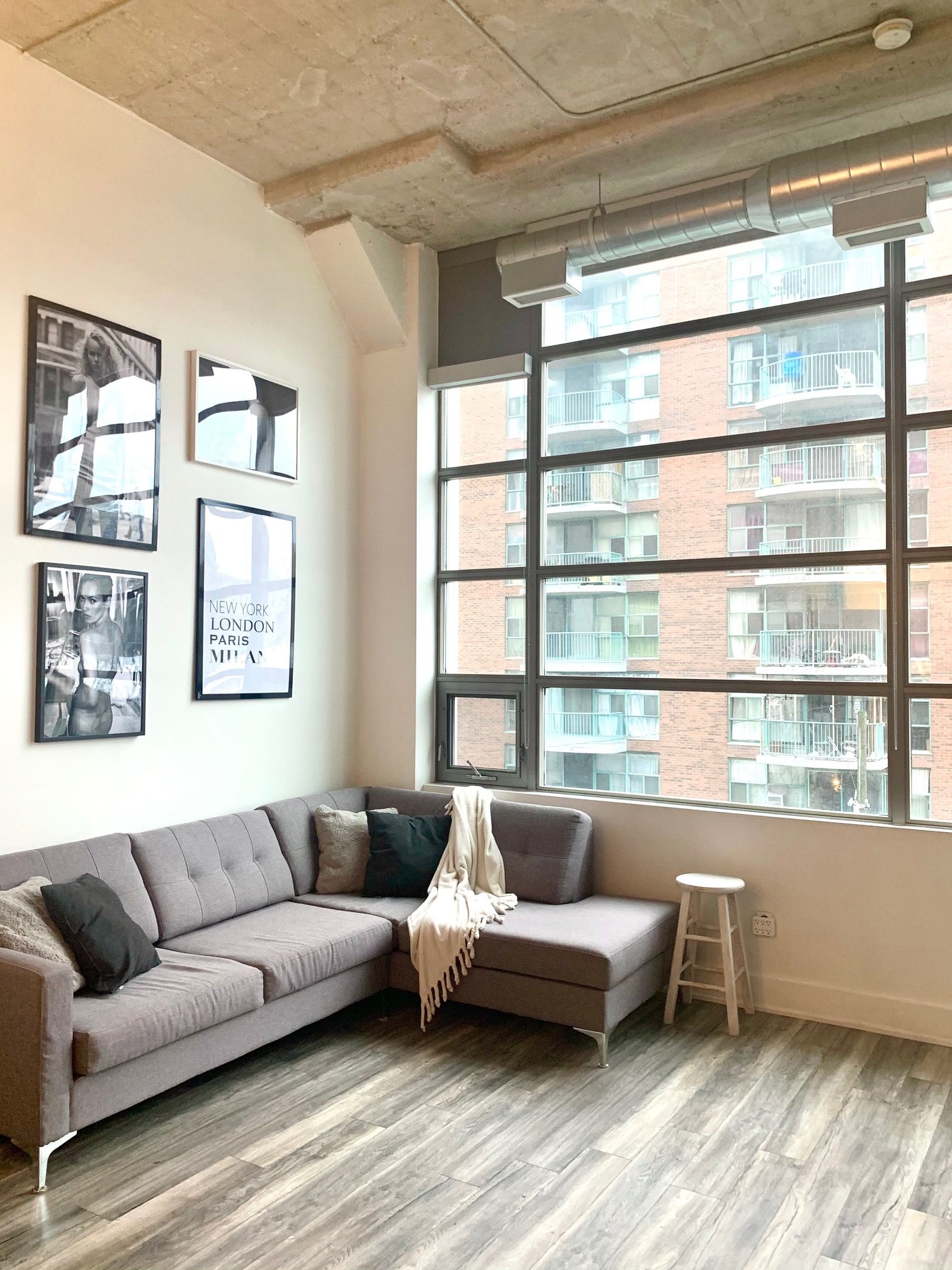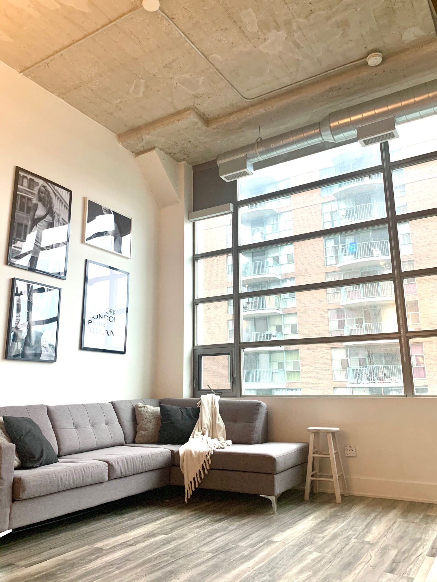 • Bright 1-bedroom layout with large windows and soaring concrete ceilings.