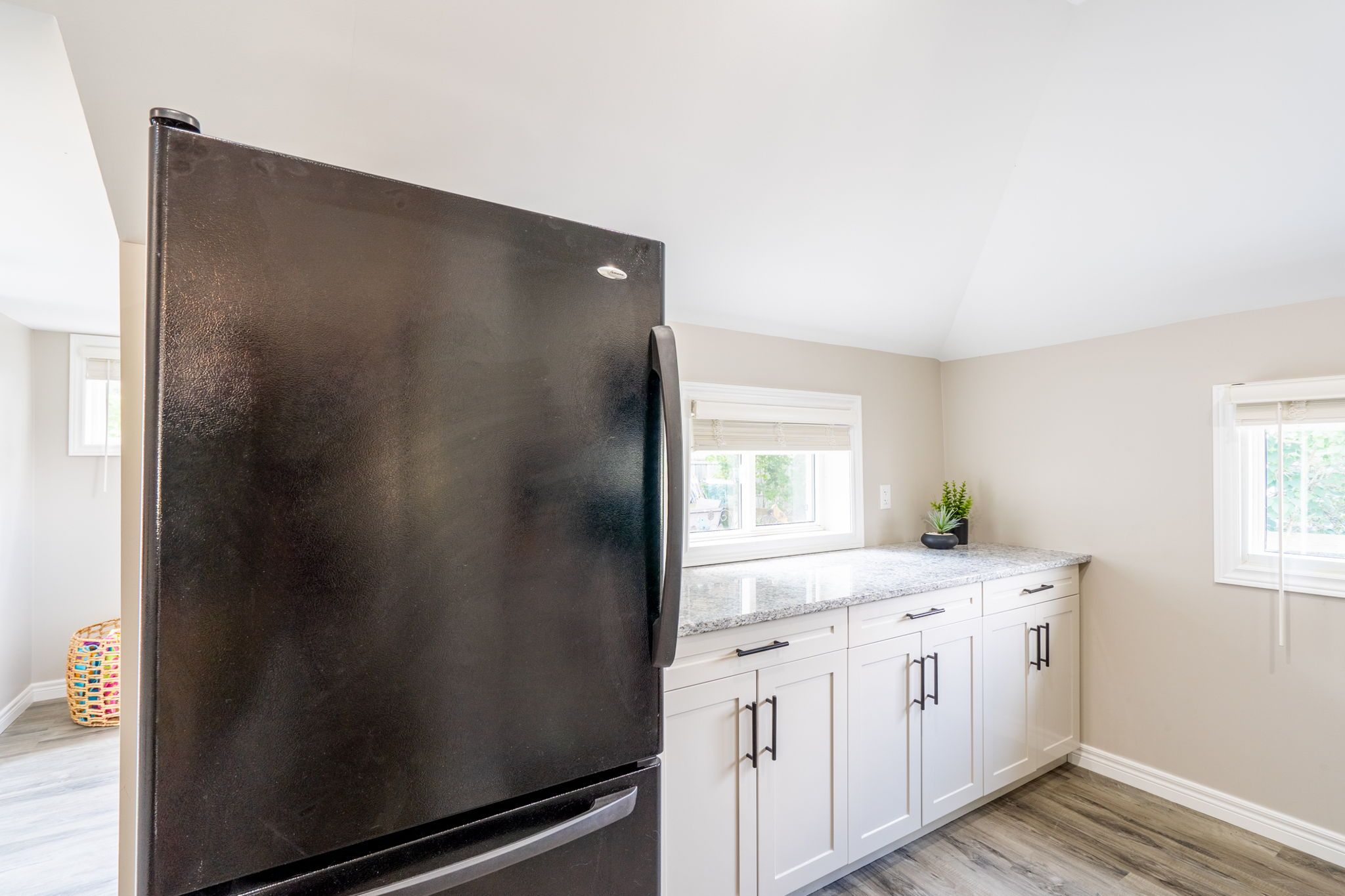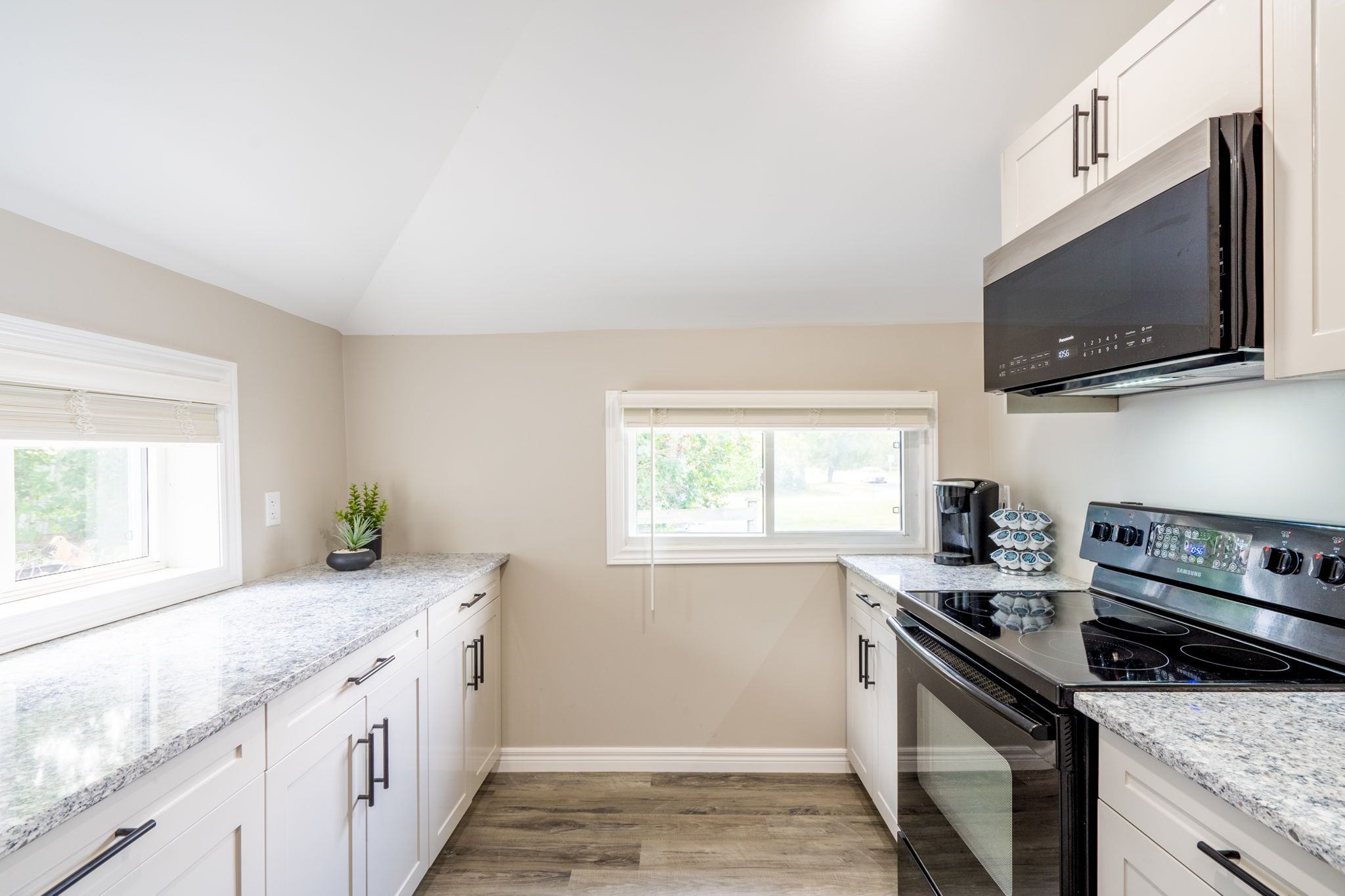 • Modern kitchen equipped with appliances, ample storage, and minimalist design.