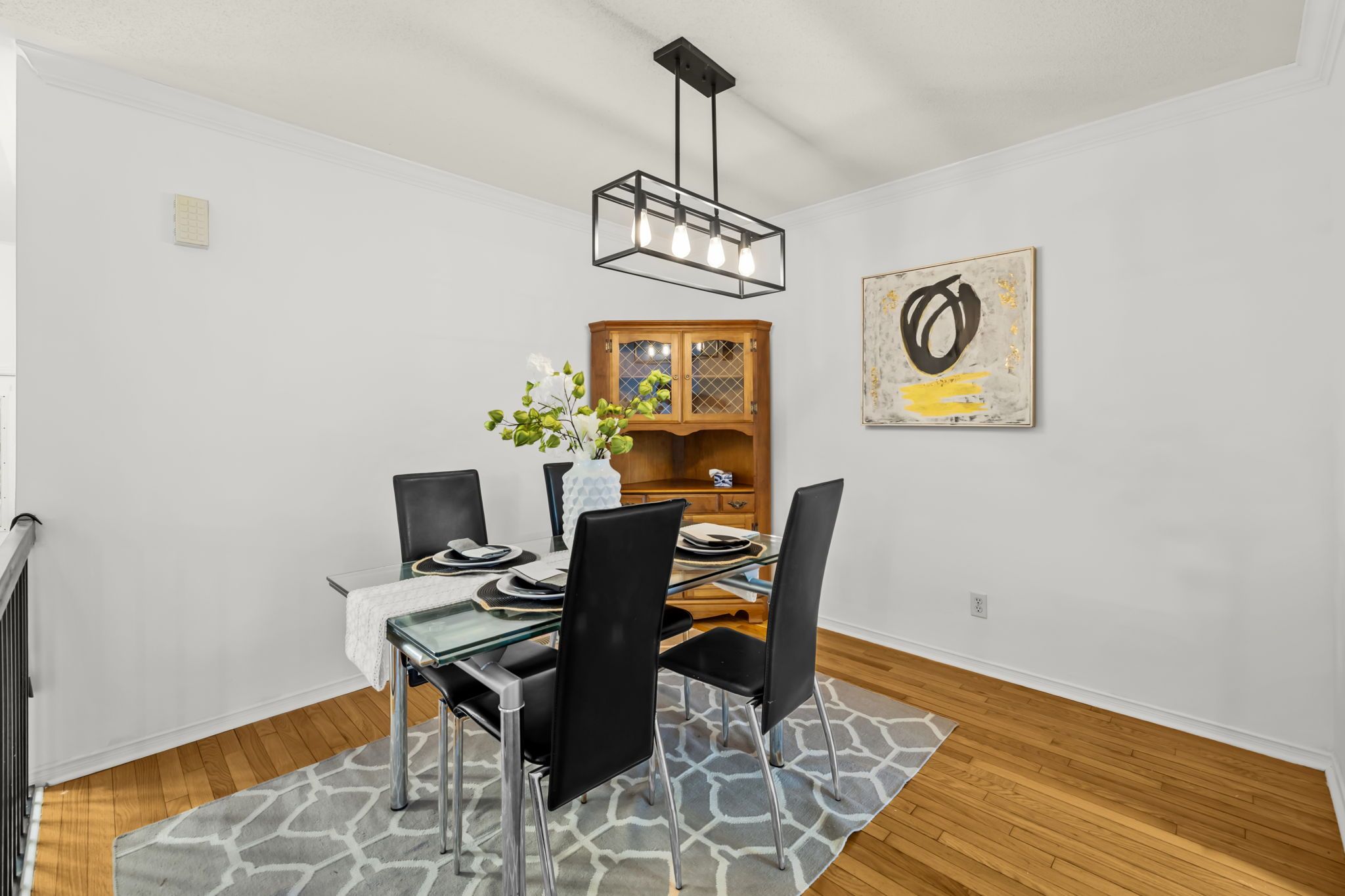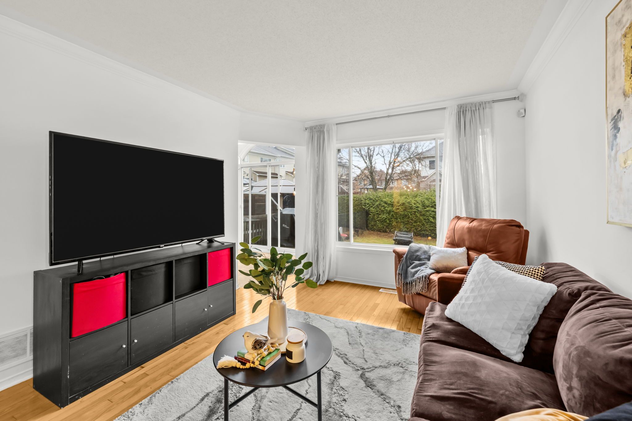 • Elegant living and dining area with hardwood floors and large windows.