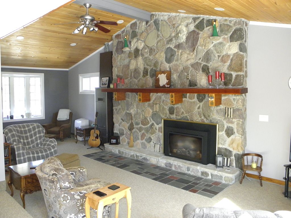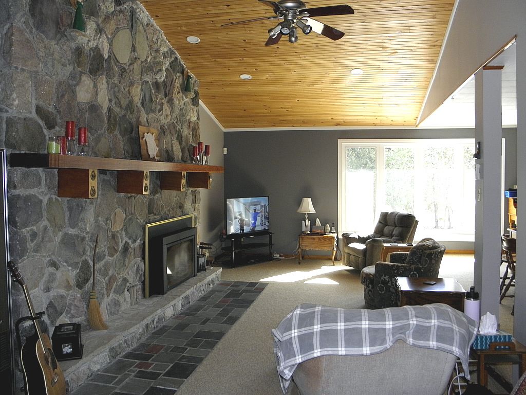 • Open concept main floor with vaulted ceilings and stone fireplaces.