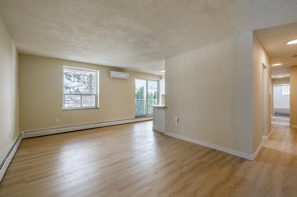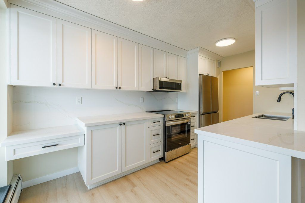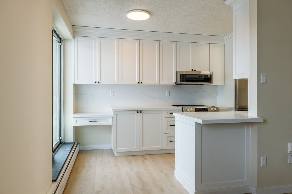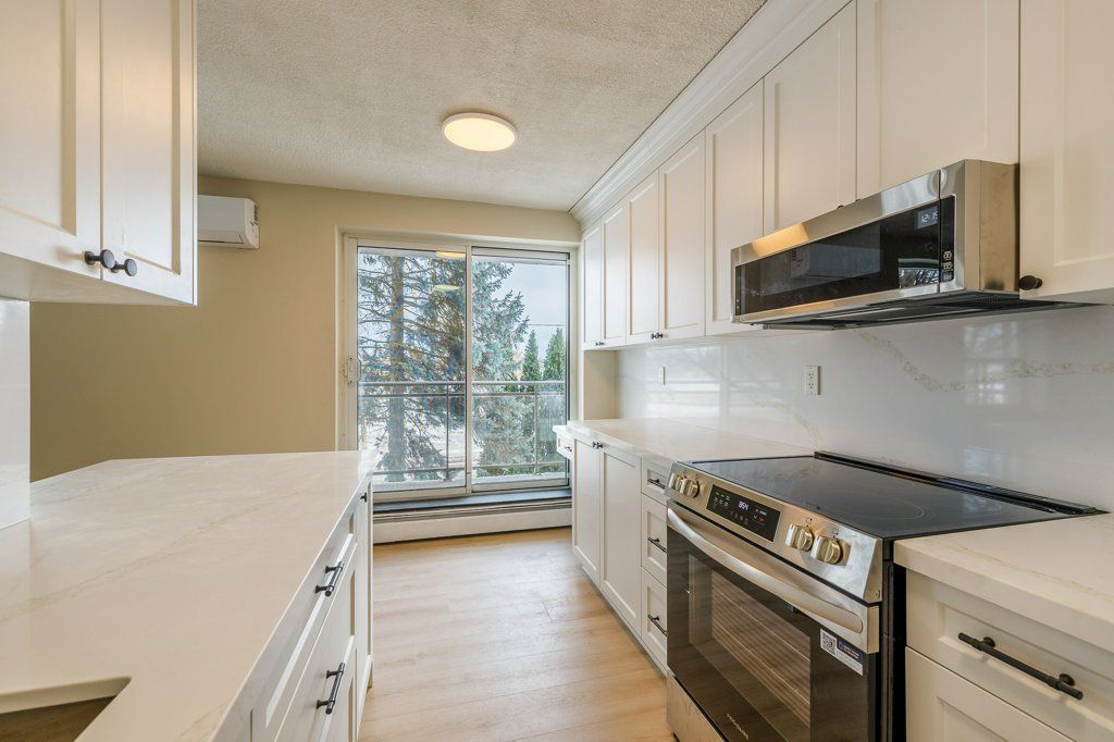 "like a brand new condo" tons of $$$ spent in new renovations! High end luxury new updates include: luxury kitchen, soft close cabinets, quartz counter-tops, gorgeous tile back splash, 6 top of the line appliances, new vinyl plank floors, trim, baseboards, lights, switches, tastefully remodelled bathroom with new tub/shower combo, luxury flooring, carpet free, in suite laundry, walk out to large balcony with a beautiful view, ductless a/c, 1 exclusive parking spot included . This 2 bedroom and 1 bath condo is one of the finest spacious 2 bedroom units in the entire building! You will be impressed. This unit is vacant and ready for immediate possession. This a great location to either live in or to purchase as an investment!