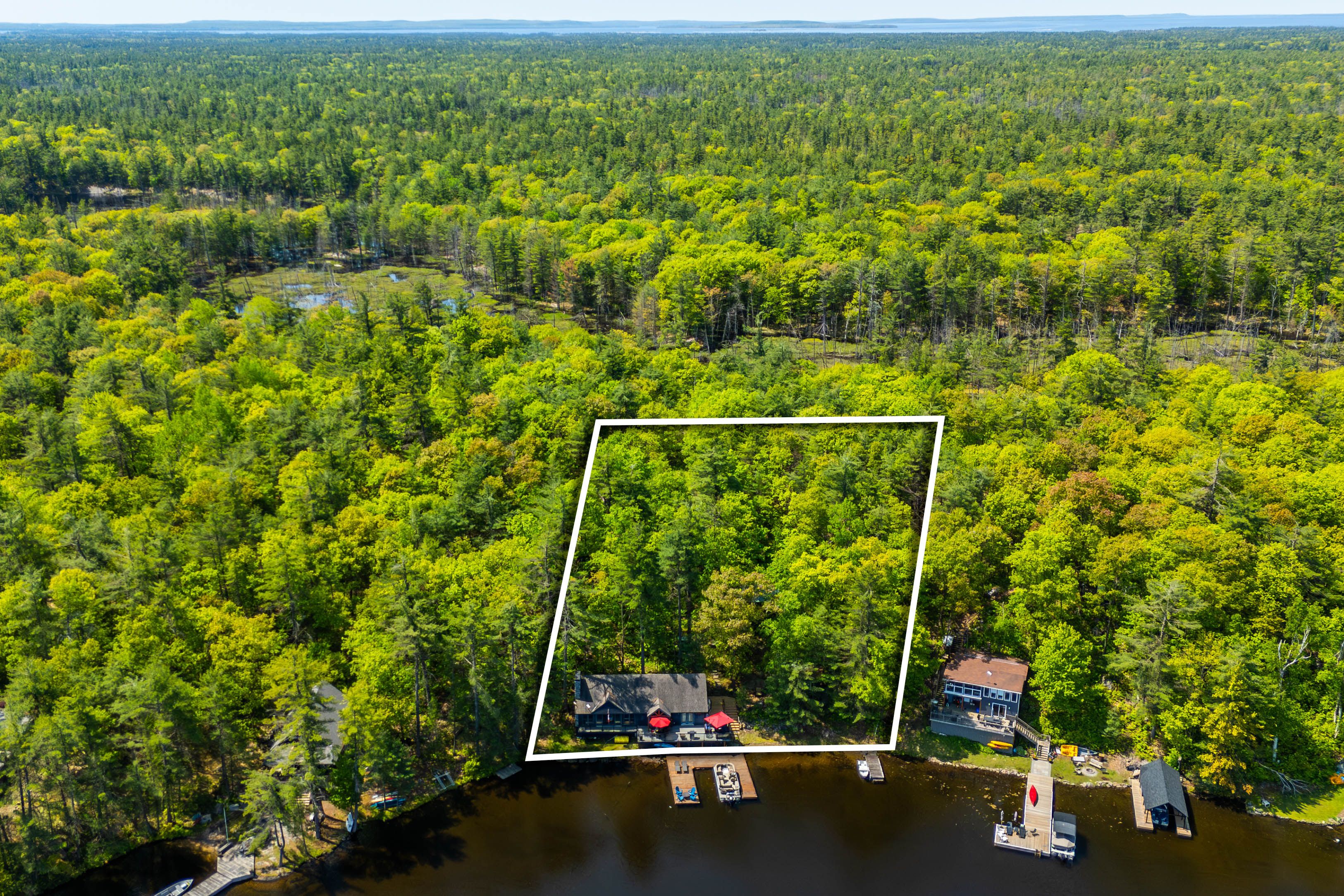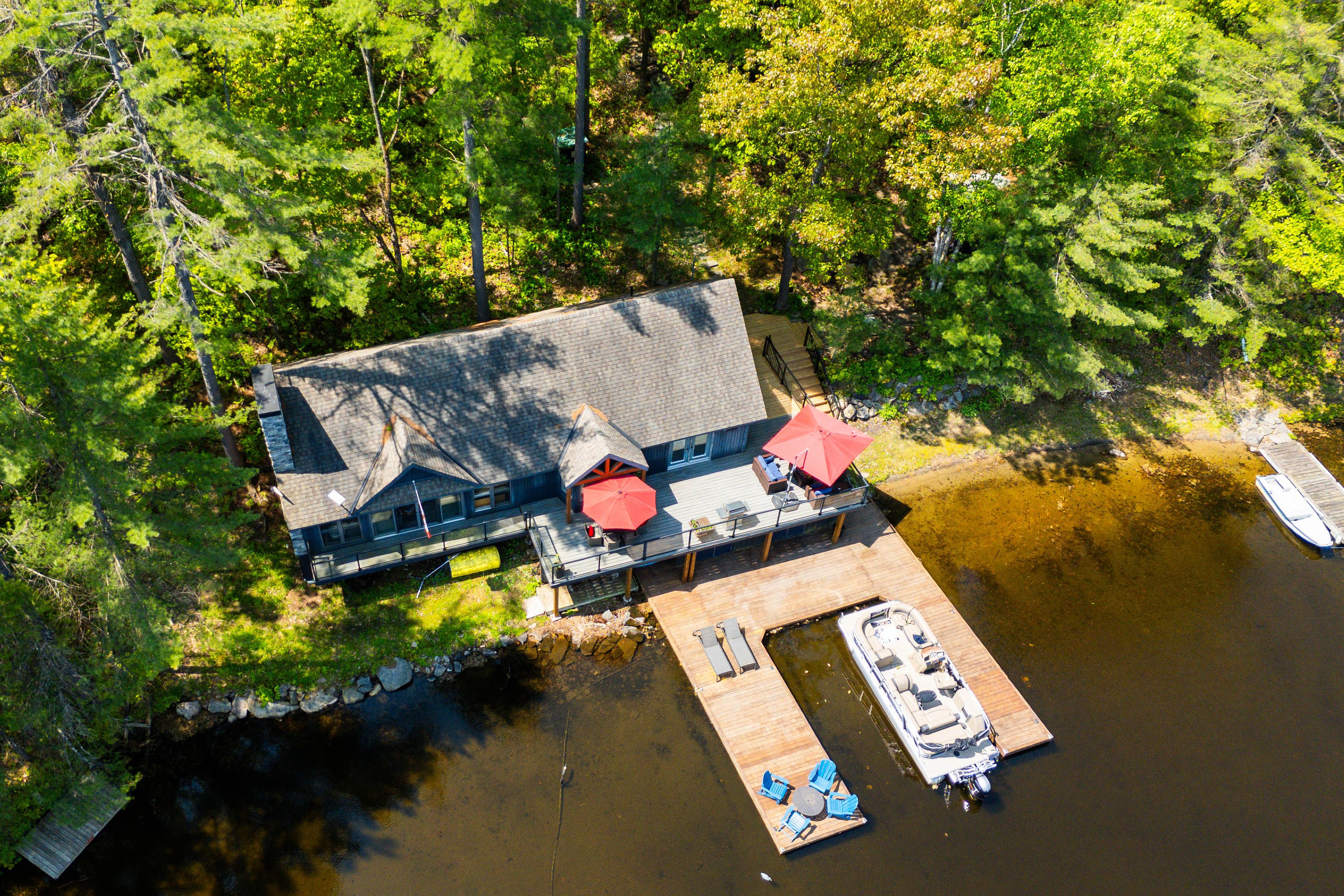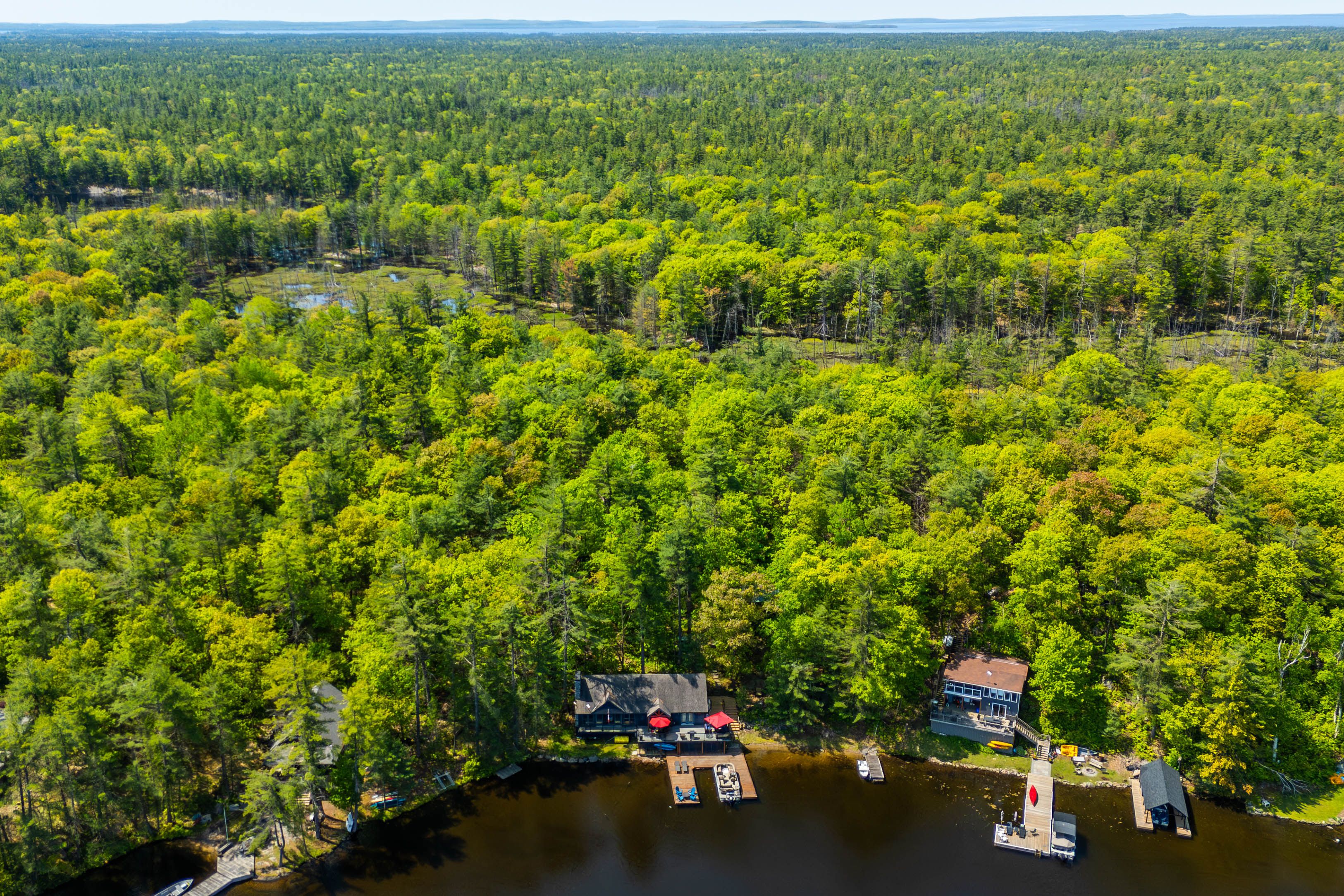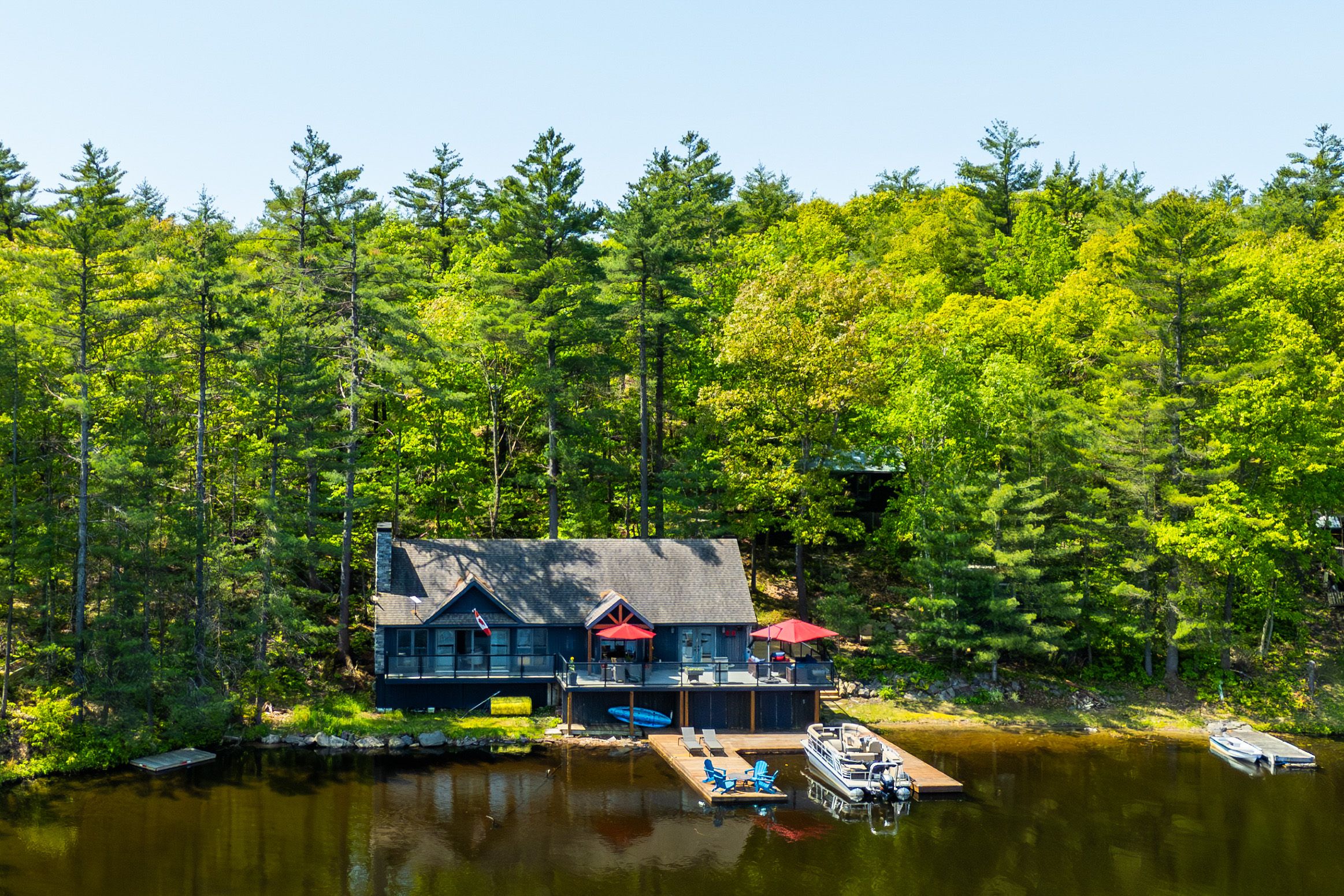Welcome to 6394 go home lake - an exquisite waterfront retreat where timeless craftsmanship meets the beauty of untouched muskoka wilderness. Set on 190 feet of private shoreline in the highly sought-after crystal bay, this four-season property offers an unparalleled connection to nature and the water. Inside, a sense of warmth and sophistication greets you. The open concept living area is framed by wide plank floors and anchored by a stone fireplace, an inviting centerpiece for family gatherings or quiet evenings by the fire. The chef's kitchen combines form and function with custom cabinetry, stainless-steel appliances, and generous workspace for entertaining. Adjacent, the dining area opens to a panoramic lake view, creating a seamless flow between indoor and outdoor living. Step outside to an expansive deck designed for lakeside entertaining, complete with integrated control 4 sound for effortless ambience. Here, mornings begin with coffee overlooking still waters, and evenings end under a canopy of stars. The main cottage offers three well-appointed bedrooms and a full bath, while a newly renovated guest bunkie extends the accommodation to visiting family and friends. The bunkie features two bedrooms, a bath, and provisions for a kitchenette, perfect as a studio, office, or guest suite with spectacular views of the bay. Beyond your doorstep, 100's of acres of adjoining crown land provide unmatched privacy and adventure, ideal for hiking, exploring, or simply losing yourself in nature. Go home lake's pristine waters connect to georgian bay through the voyageurs club, offering access to hidden coves, cascading waterfalls, and private swimming lagoons. With its rare combination of comfort, design, and natural beauty, this property delivers the quintessential muskoka experience, a place to recharge, reconnect, and create lasting memories on one of the region's most treasured lakes.