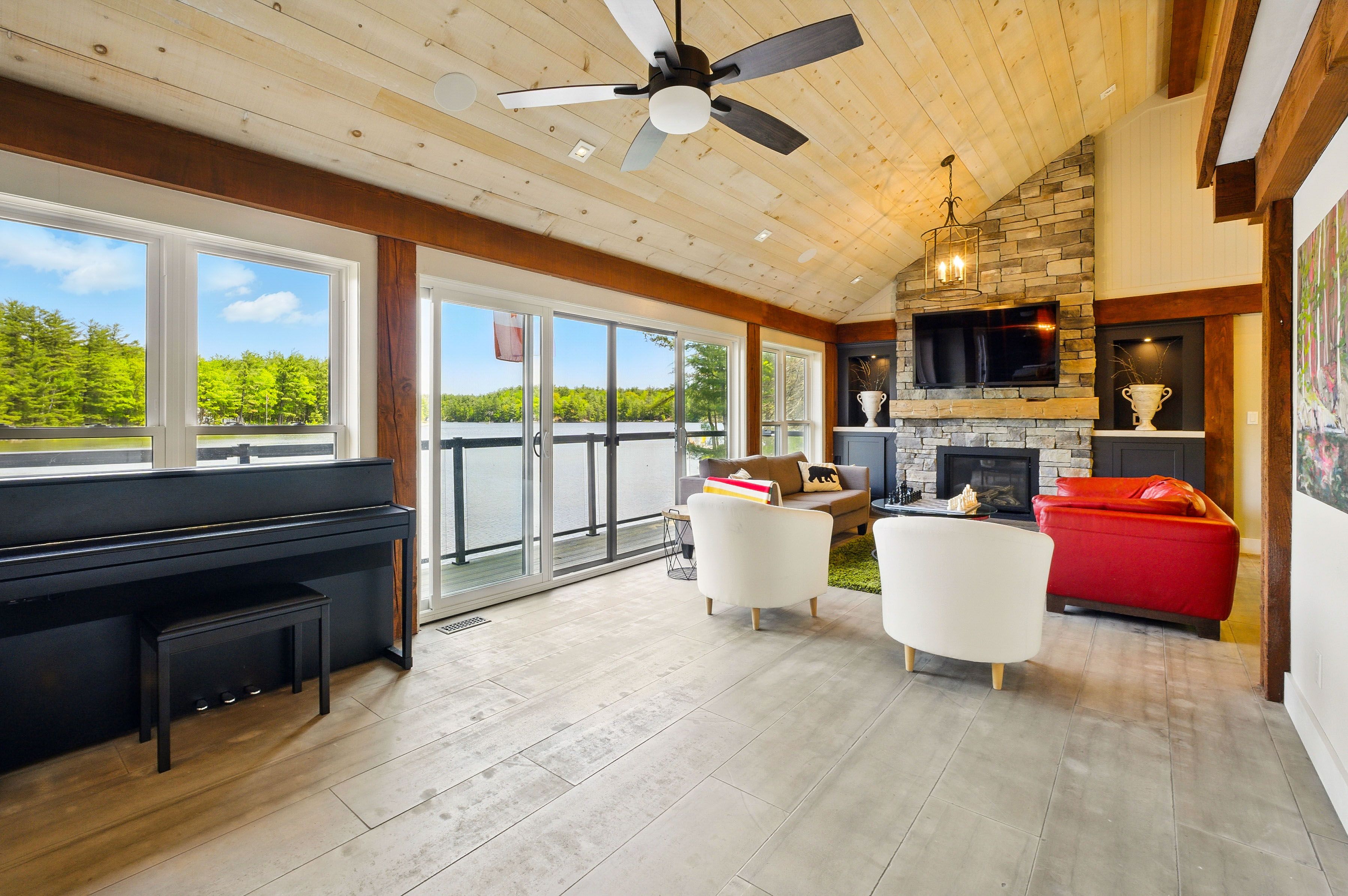 • Open concept living area with stone fireplace, perfect for gatherings.