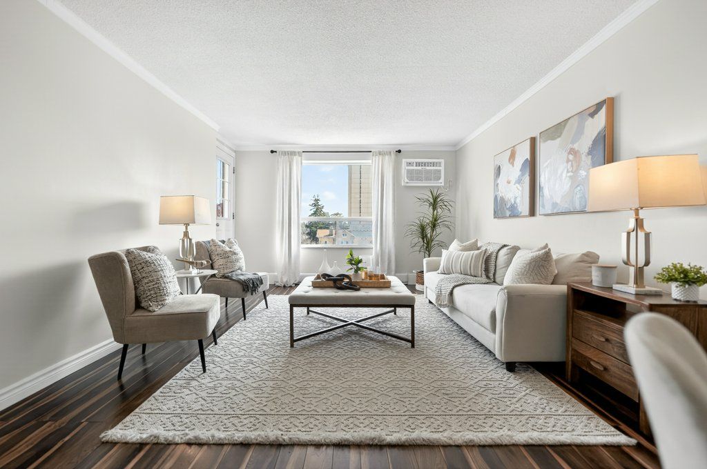• Bright living area with large windows and private balcony.