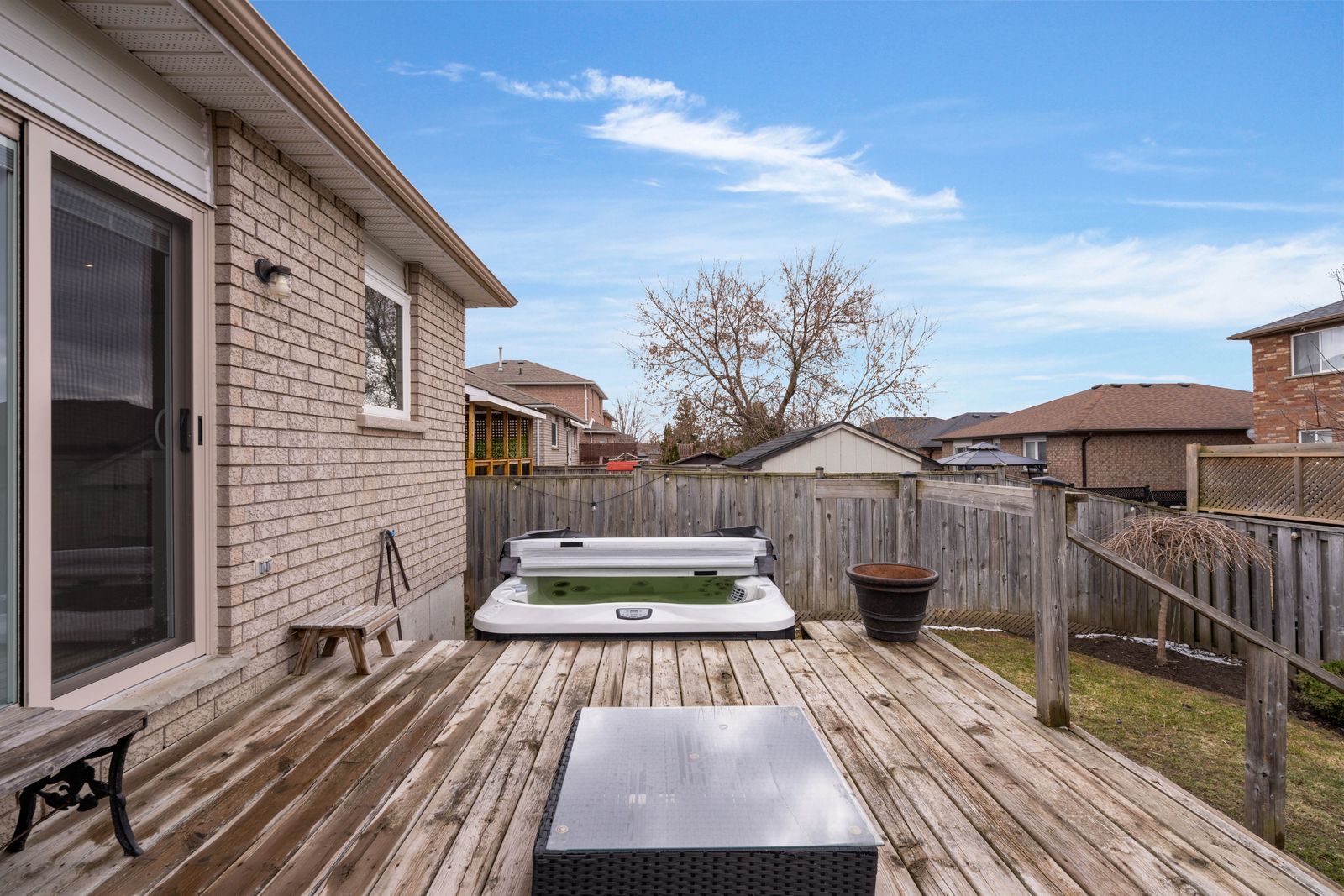 • Private fenced backyard features a deck and jacuzzi hot tub for relaxation.